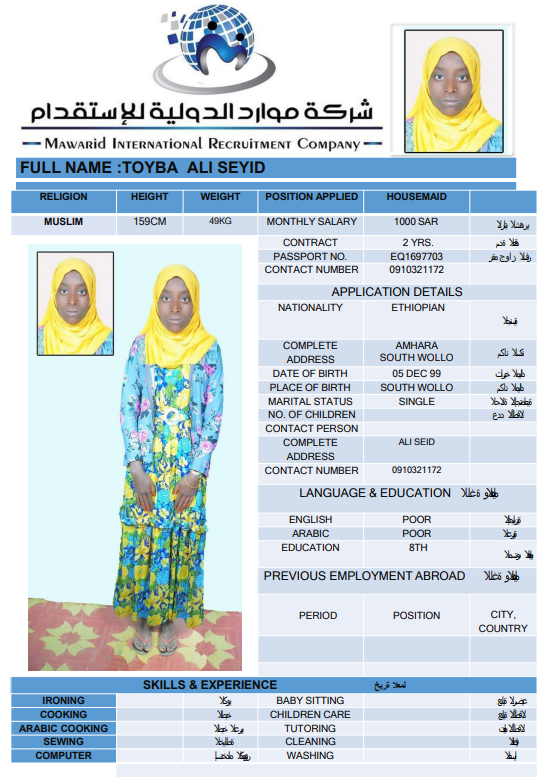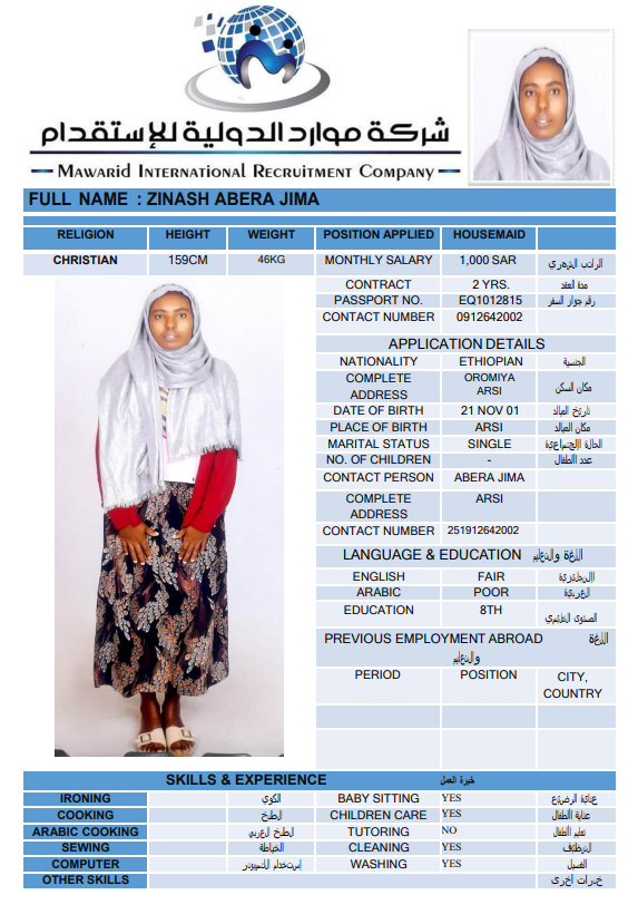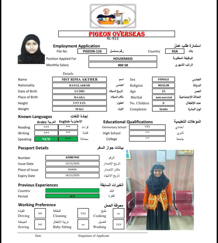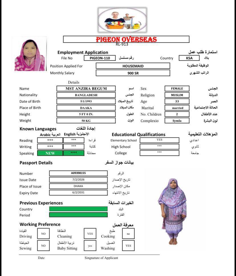 نوع الخدمة نوع الخدمة استقدام تأجير نقل خدمات الجنسية الجنسية الفلبين الهند اثيوبيا بروندي بنغلاديش أوغندا سريلانكا كينيا اندونيسيا غانا المهنة عاملة منزلية سائق خاص عاملة عناية ممرضة منزلية الديانة مسلم غير مسلم الخبرة سبق العمل لم يسبق العمل بحث مسح SUMI بنغلاديش العمر 37 الخبرة لم يسبق العمل الديانة مسلم رقم الملف A18160488 حجز العاملة RIMA بنغلاديش العمر 25 الخبرة لم يسبق العمل الديانة مسلم رقم الملف A20867442 حجز العاملة AKTER بنغلاديش العمر 31 الخبرة لم يسبق العمل الديانة مسلم رقم الملف A050390580 حجز العاملة MST ANZIRA بنغلاديش العمر 33 الخبرة لم يسبق العمل الديانة مسلم رقم الملف A09398155 حجز العاملة ALEMNESH AWOKE TAFESE اثيوبيا العمر 22 الخبرة لم يسبق العمل الديانة غير مسلم رقم الملف EQ1954281 حجز العاملة ZINASH ABERA JIMA اثيوبيا العمر 25 الخبرة لم يسبق العمل الديانة غير مسلم رقم الملف EQ1012815 حجز العاملة MESERET ASMAMAW GETE اثيوبيا العمر 25 الخبرة لم يسبق العمل الديانة غير مسلم رقم الملف EP7424330 حجز العاملة EKRAMYIMER MUHY اثيوبيا العمر 27 الخبرة لم يسبق العمل الديانة مسلم رقم الملف EQ2075279 حجز العاملة TOYBA ALI SEYID اثيوبيا العمر 27 الخبرة لم يسبق العمل الديانة مسلم رقم الملف EQ1697703 حجز العاملة TOYBA ALI BELAY اثيوبيا العمر 28 الخبرة لم يسبق العمل الديانة مسلم رقم الملف EQ1544055 حجز العاملة 6 7 8 9 10 11 12 13 14
