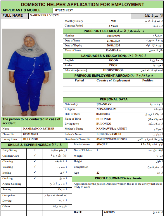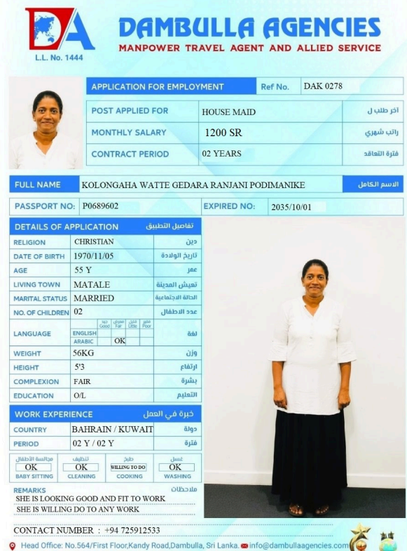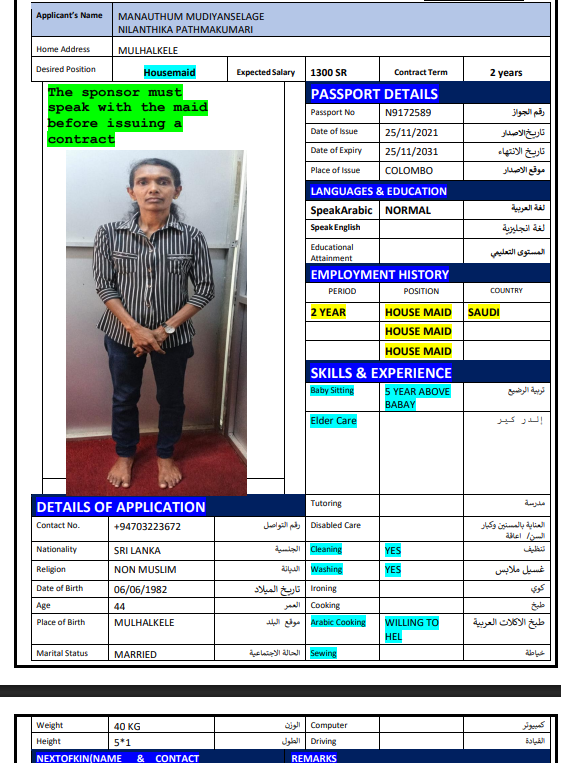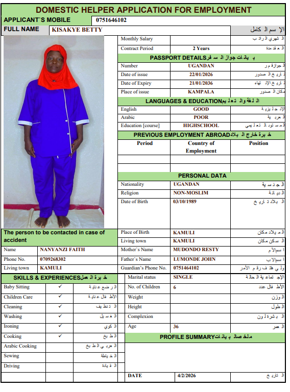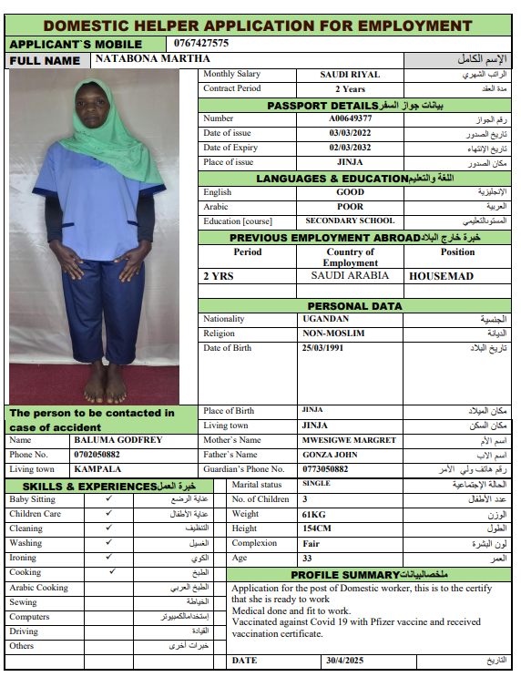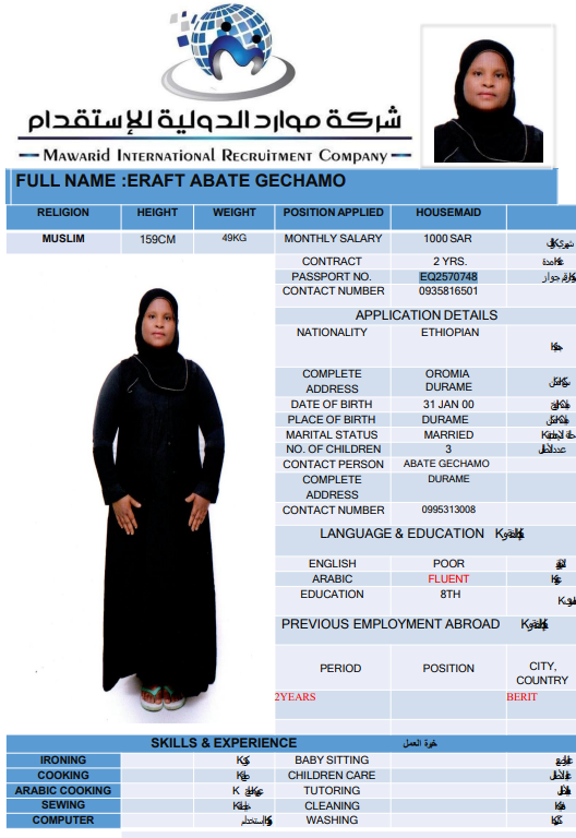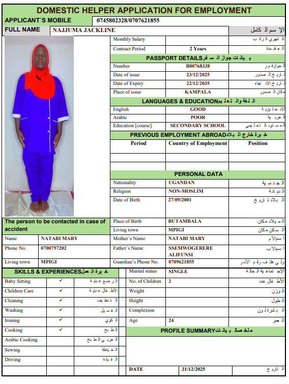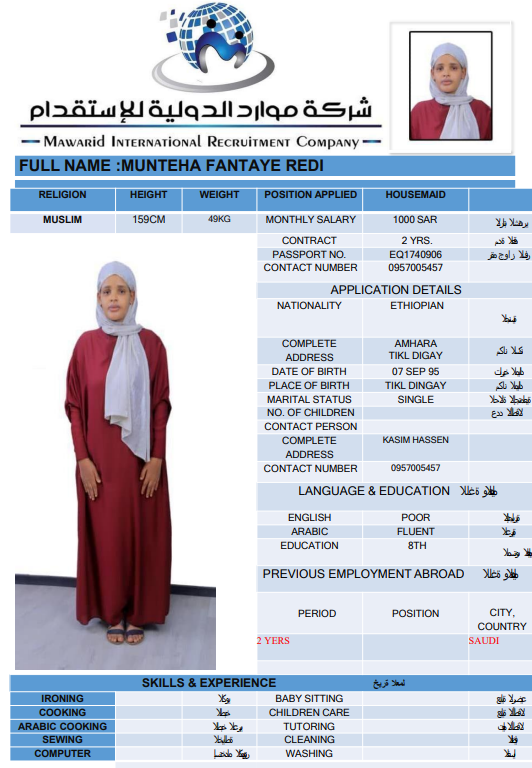 نوع الخدمة نوع الخدمة استقدام تأجير نقل خدمات الجنسية الجنسية الفلبين الهند اثيوبيا بروندي بنغلاديش أوغندا سريلانكا كينيا اندونيسيا غانا المهنة عاملة منزلية سائق خاص عاملة عناية ممرضة منزلية الديانة مسلم غير مسلم الخبرة سبق العمل لم يسبق العمل بحث مسح MUNTEHA FANTAYE REDI اثيوبيا العمر 30 الخبرة سبق العمل الديانة مسلم رقم الملف EQ1740906 حجز العاملة ERAFT ABATE GECHAMO اثيوبيا العمر 25 الخبرة سبق العمل الديانة مسلم رقم الملف EQ2570748 حجز العاملة WESILA MEHBUB ABDELA اثيوبيا العمر 40 الخبرة سبق العمل الديانة مسلم رقم الملف E00093333 حجز العاملة AUGASTINE DAISY SHIROMI سريلانكا العمر 52 الخبرة سبق العمل الديانة غير مسلم رقم الملف N10436443 حجز العاملة MANAUTHUM MUDIYANSELAGE NILANTHIKA P سريلانكا العمر 44 الخبرة سبق العمل الديانة غير مسلم رقم الملف N9172589 حجز العاملة KOLONGAHA WATTE GEDARA RANJANI PODIMAN سريلانكا العمر 55 الخبرة سبق العمل الديانة غير مسلم رقم الملف P0689602 حجز العاملة JACKLINE العمر 24 الخبرة لم يسبق العمل الديانة غير مسلم رقم الملف B00768338 حجز العاملة VICKY أوغندا العمر 23 الخبرة لم يسبق العمل الديانة غير مسلم رقم الملف B00539393 حجز العاملة BETTY أوغندا العمر 36 الخبرة لم يسبق العمل الديانة غير مسلم رقم الملف B00780607 حجز العاملة NATABONA MARTHA أوغندا العمر 35 الخبرة سبق العمل الديانة غير مسلم رقم الملف 00649377A حجز العاملة 1 2 3 4 5 6