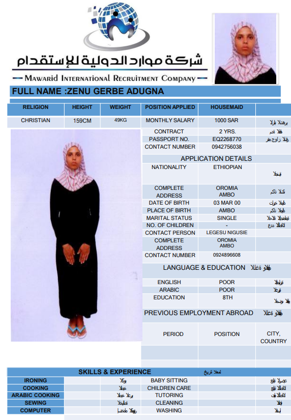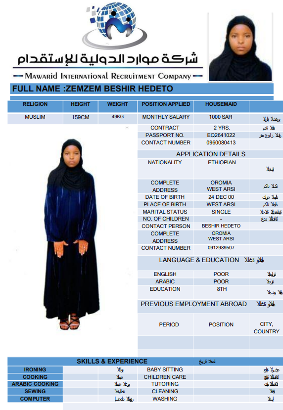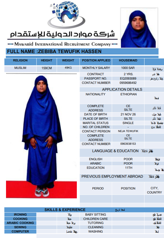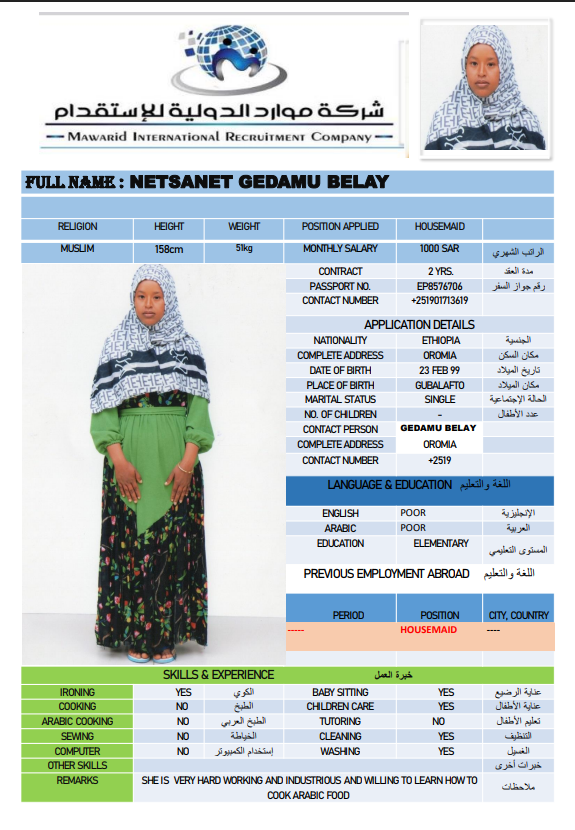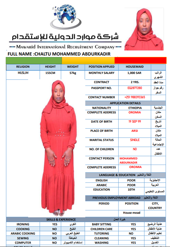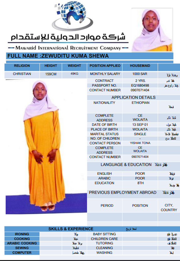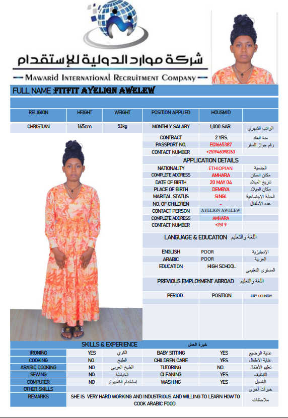 نوع الخدمة نوع الخدمة استقدام تأجير نقل خدمات الجنسية الجنسية الفلبين الهند اثيوبيا بروندي بنغلاديش أوغندا سريلانكا كينيا اندونيسيا غانا المهنة عاملة منزلية سائق خاص عاملة عناية ممرضة منزلية الديانة مسلم غير مسلم الخبرة سبق العمل لم يسبق العمل بحث مسح MEKIYA WADO AMAN اثيوبيا العمر 26 الخبرة لم يسبق العمل الديانة مسلم رقم الملف EQ2086992 حجز العاملة CHALTU MOHAMMED ABDURKADIR اثيوبيا العمر 27 الخبرة لم يسبق العمل الديانة مسلم رقم الملف EQ2877280 حجز العاملة TAYIBA AWOL BELELO اثيوبيا العمر 27 الخبرة لم يسبق العمل الديانة مسلم رقم الملف EQ1592943 حجز العاملة FITFIT AYELIGN AWELEW اثيوبيا العمر 22 الخبرة لم يسبق العمل الديانة غير مسلم رقم الملف EQ1665387 حجز العاملة NETSANET GEDAMU BELAY اثيوبيا العمر 27 الخبرة لم يسبق العمل الديانة مسلم رقم الملف EP8576706 حجز العاملة ZEBIBA TEWUFIK HASSEN اثيوبيا العمر 26 الخبرة لم يسبق العمل الديانة مسلم رقم الملف EQ2093089 حجز العاملة ZEMZEM BESHIR HEDETO اثيوبيا العمر 26 الخبرة لم يسبق العمل الديانة مسلم رقم الملف EQ2641022 حجز العاملة ZEMZEM GEBAWO USH اثيوبيا العمر 27 الخبرة لم يسبق العمل الديانة مسلم رقم الملف EQ2082589 حجز العاملة ZENU GERBE ADUGNA اثيوبيا العمر 26 الخبرة لم يسبق العمل الديانة غير مسلم رقم الملف EQ2268770 حجز العاملة ZEWUDITU KUMA SHEWA اثيوبيا العمر 25 الخبرة لم يسبق العمل الديانة غير مسلم رقم الملف EQ1680498 حجز العاملة 1 2 3 4 5 6