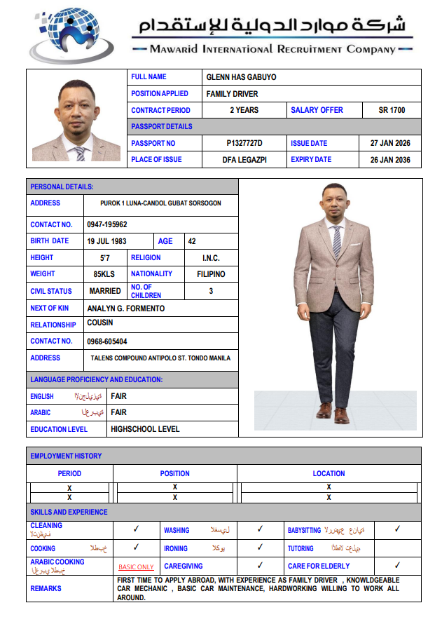 نوع الخدمة نوع الخدمة استقدام تأجير نقل خدمات الجنسية الجنسية الفلبين الهند اثيوبيا بروندي بنغلاديش أوغندا سريلانكا كينيا اندونيسيا غانا المهنة عاملة منزلية سائق خاص عاملة عناية ممرضة منزلية الديانة مسلم غير مسلم الخبرة سبق العمل لم يسبق العمل بحث مسح MUNIYASAMY الهند العمر 36 الخبرة سبق العمل الديانة غير مسلم رقم الملف R4708725 حجز العاملة MUHAMMAD HASHIM الهند العمر 26 الخبرة سبق العمل الديانة مسلم رقم الملف T7202831 حجز العاملة JOTHI VEL الهند العمر 40 الخبرة سبق العمل الديانة مسلم رقم الملف W9053583 حجز العاملة MOHAMMED UDHUMAN الهند العمر 50 الخبرة سبق العمل الديانة مسلم رقم الملف C2084805 حجز العاملة GLENN HAS GABUYO الفلبين العمر 42 الخبرة لم يسبق العمل الديانة غير مسلم رقم الملف P1327727D حجز العاملة JHUNRI GRATUATO RENOMERON الفلبين العمر 41 الخبرة لم يسبق العمل الديانة غير مسلم رقم الملف P0978195C حجز العاملة السير الذاتية