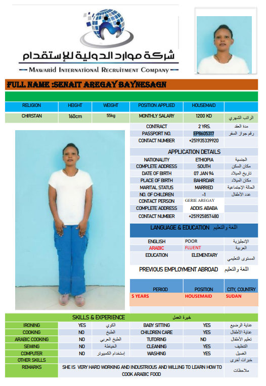 نوع الخدمة نوع الخدمة استقدام تأجير نقل خدمات الجنسية الجنسية الفلبين الهند اثيوبيا بروندي بنغلاديش أوغندا سريلانكا كينيا اندونيسيا غانا المهنة عاملة منزلية سائق خاص عاملة عناية ممرضة منزلية الديانة مسلم غير مسلم الخبرة سبق العمل لم يسبق العمل بحث مسح NALUGEMWA DOROTHY أوغندا العمر 26 الخبرة لم يسبق العمل الديانة غير مسلم رقم الملف B00740282 حجز العاملة NALWEYISO ROSEMARY أوغندا العمر 37 الخبرة سبق العمل الديانة مسلم رقم الملف A00611286 حجز العاملة NANTABA DIZZY أوغندا العمر 38 الخبرة سبق العمل الديانة مسلم رقم الملف B00437439 حجز العاملة NAULA MOREEN أوغندا العمر 23 الخبرة سبق العمل الديانة غير مسلم رقم الملف 00763471B حجز العاملة SHIRLEY RIVERA SOLANO الفلبين العمر 52 الخبرة سبق العمل الديانة غير مسلم رقم الملف P8526771A حجز العاملة GRACE BARAN MANGITNGIT الفلبين العمر 32 الخبرة سبق العمل الديانة غير مسلم رقم الملف P9899712B حجز العاملة REGINE ROSE DELA CRUZ SETERA الفلبين العمر 25 الخبرة لم يسبق العمل الديانة غير مسلم رقم الملف P1597841D حجز العاملة CINDY MARIE LAGADON GAJO الفلبين العمر 45 الخبرة سبق العمل الديانة غير مسلم رقم الملف P1312404D حجز العاملة EVANGELINE CURITANA ASUNCION الفلبين العمر 50 الخبرة سبق العمل الديانة غير مسلم رقم الملف P4127685C حجز العاملة SENAIT AREGAY BAYNESAGN اثيوبيا العمر 32 الخبرة سبق العمل الديانة غير مسلم رقم الملف EP8605317 حجز العاملة 1 2 3 4