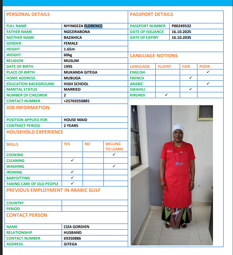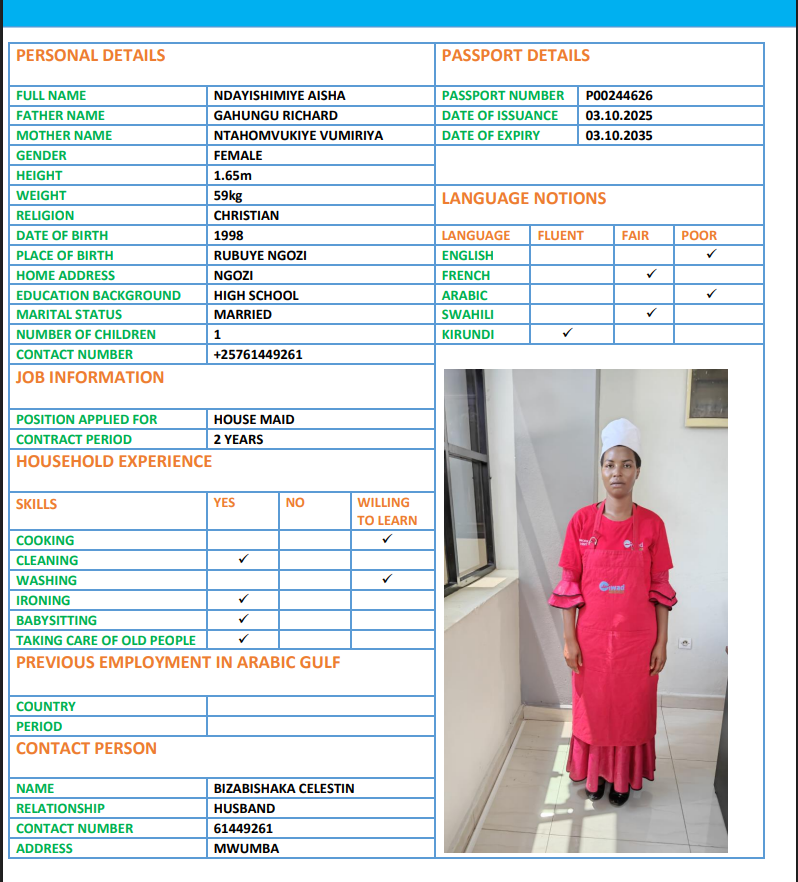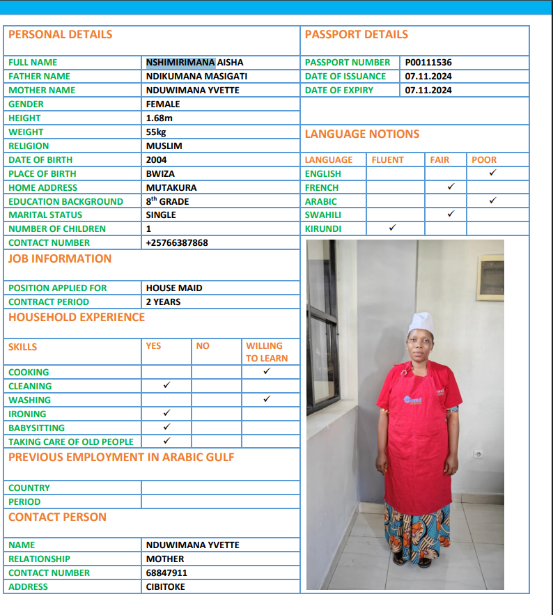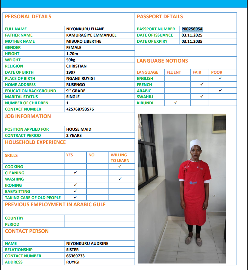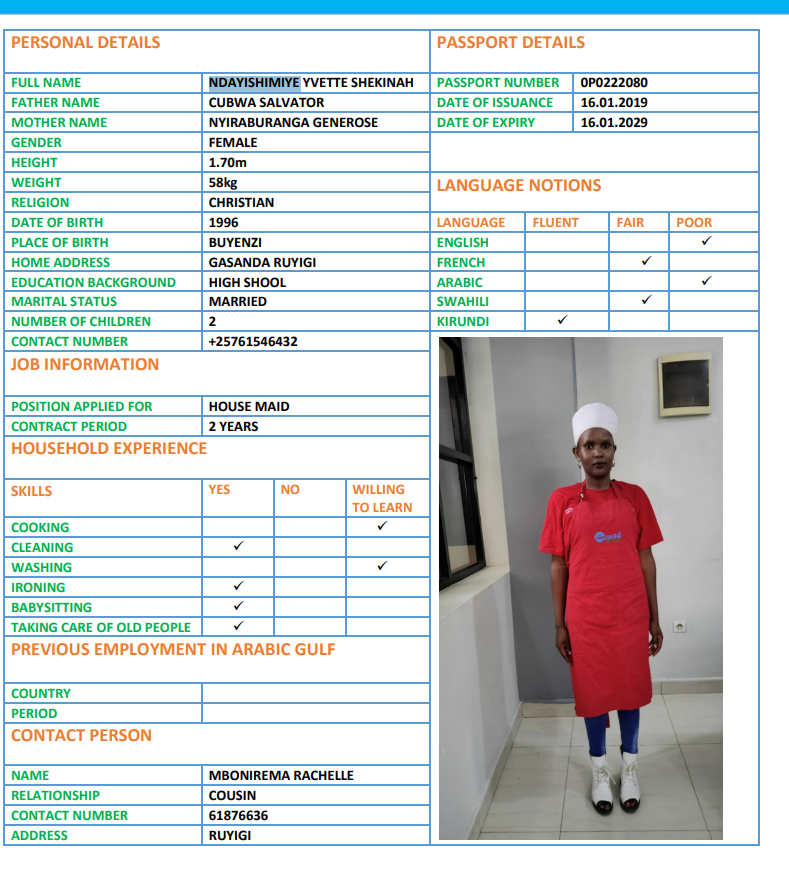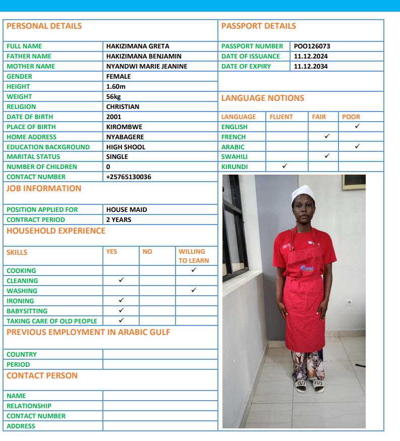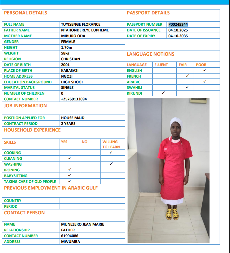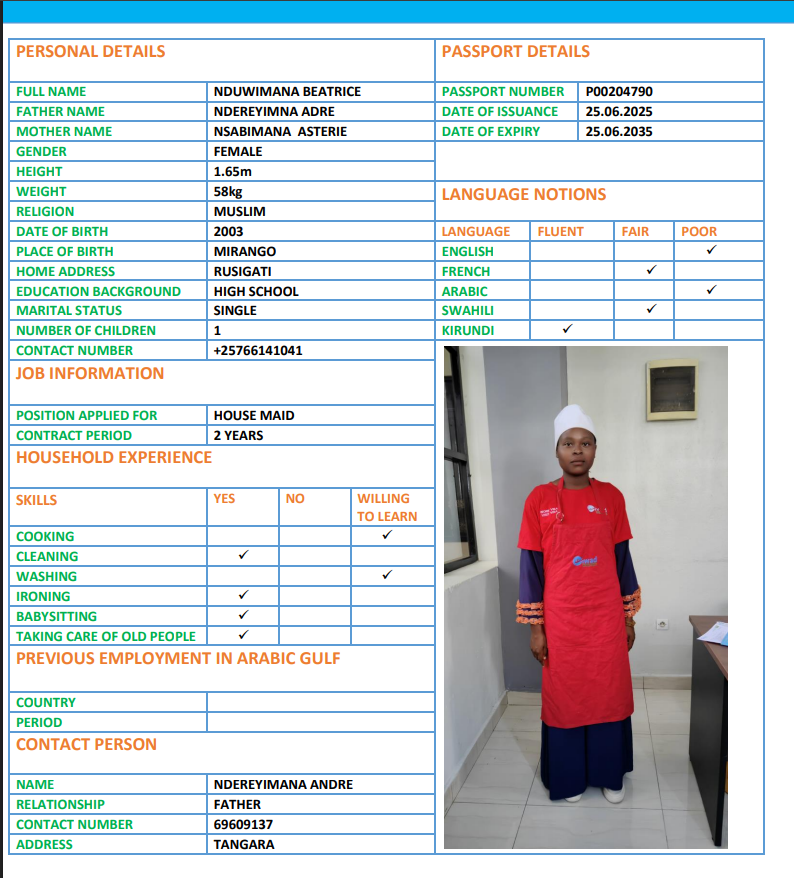 نوع الخدمة نوع الخدمة استقدام تأجير نقل خدمات الجنسية الجنسية الفلبين الهند اثيوبيا بروندي بنغلاديش أوغندا سريلانكا كينيا اندونيسيا غانا المهنة عاملة منزلية سائق خاص عاملة عناية ممرضة منزلية الديانة مسلم غير مسلم الخبرة سبق العمل لم يسبق العمل بحث مسح HAKIZIMANA GRETA بروندي العمر 25 الخبرة لم يسبق العمل الديانة غير مسلم رقم الملف POO126073 حجز العاملة AISHA بروندي العمر 22 الخبرة لم يسبق العمل الديانة مسلم رقم الملف P00111536 حجز العاملة TUYISENGE بروندي العمر 25 الخبرة لم يسبق العمل الديانة غير مسلم رقم الملف P00245344 حجز العاملة NDAYISHIMIYE بروندي العمر 29 الخبرة لم يسبق العمل الديانة غير مسلم رقم الملف 0P0222080 حجز العاملة FLORENCE بروندي العمر 30 الخبرة لم يسبق العمل الديانة مسلم رقم الملف P00249532 حجز العاملة NIYONKURU ELIANE بروندي العمر 27 الخبرة لم يسبق العمل الديانة غير مسلم رقم الملف P00256954 حجز العاملة NDUWIMANA BEATRICE بروندي العمر 23 الخبرة لم يسبق العمل الديانة غير مسلم رقم الملف P00204790 حجز العاملة NDAYISHIMIYE AISHA بروندي العمر 28 الخبرة لم يسبق العمل الديانة غير مسلم رقم الملف P00244626 حجز العاملة