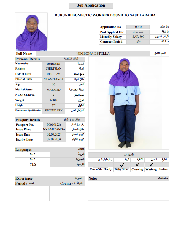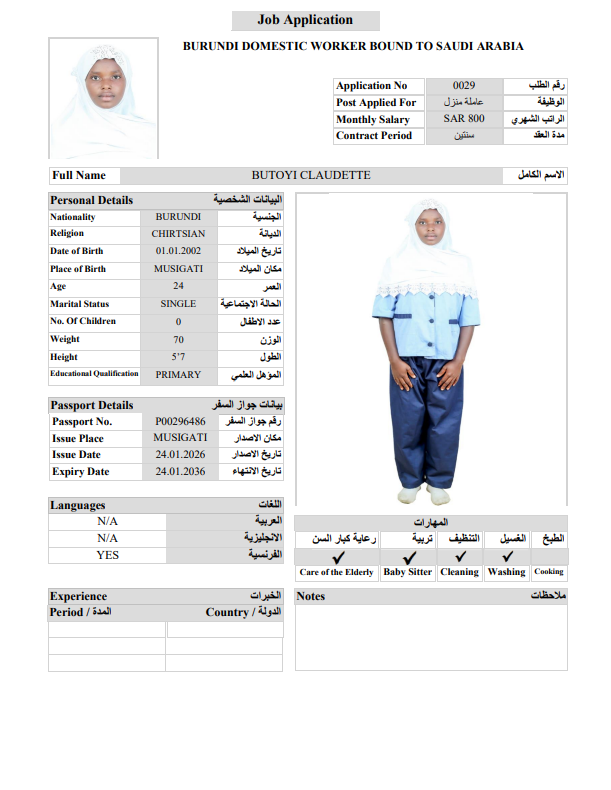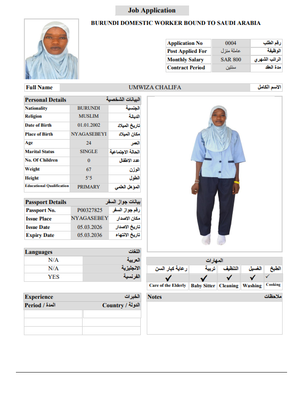 نوع الخدمة نوع الخدمة استقدام تأجير نقل خدمات الجنسية الجنسية الفلبين الهند اثيوبيا بروندي بنغلاديش أوغندا سريلانكا كينيا اندونيسيا غانا المهنة عاملة منزلية سائق خاص عاملة عناية ممرضة منزلية الديانة مسلم غير مسلم الخبرة سبق العمل لم يسبق العمل بحث مسح تبلل اثيوبيا العمر 39 الخبرة سبق العمل الديانة غير مسلم رقم الملف 123 حجز العاملة BUTOYI CLAUDETTE CV بروندي العمر 24 الخبرة لم يسبق العمل الديانة غير مسلم رقم الملف P00296486 حجز العاملة السير الذاتية UWINEZA CHALIFA CV بروندي العمر 24 الخبرة لم يسبق العمل الديانة غير مسلم رقم الملف P00327825 حجز العاملة السير الذاتية NDAYISHIMIYE JOSELYNE CV بروندي العمر 33 الخبرة لم يسبق العمل الديانة غير مسلم رقم الملف ح000105118 حجز العاملة السير الذاتية NDAYISHIMIYE JOSELYNE CV بروندي العمر 30 الخبرة لم يسبق العمل الديانة غير مسلم رقم الملف P00079670 حجز العاملة السير الذاتية MUKESHIMANA PAVELYNE CV بروندي العمر 25 الخبرة لم يسبق العمل الديانة غير مسلم رقم الملف P00151624 حجز العاملة السير الذاتية NIMBONA ESTELLA CV بروندي العمر 30 الخبرة لم يسبق العمل الديانة غير مسلم رقم الملف P00091236 حجز العاملة السير الذاتية NTAKIRUTIMANA SUAVIS CV بروندي العمر 24 الخبرة لم يسبق العمل الديانة غير مسلم رقم الملف P00144059 حجز العاملة السير الذاتية IRANKUNDA FRANCINE CV بروندي العمر 31 الخبرة لم يسبق العمل الديانة غير مسلم رقم الملف OP0341102 حجز العاملة السير الذاتية MINANI VEZTINE CV بروندي العمر 39 الخبرة لم يسبق العمل الديانة غير مسلم رقم الملف P00216807 حجز العاملة السير الذاتية 14 15 16 17 18 19 20 21 22
