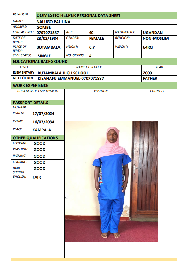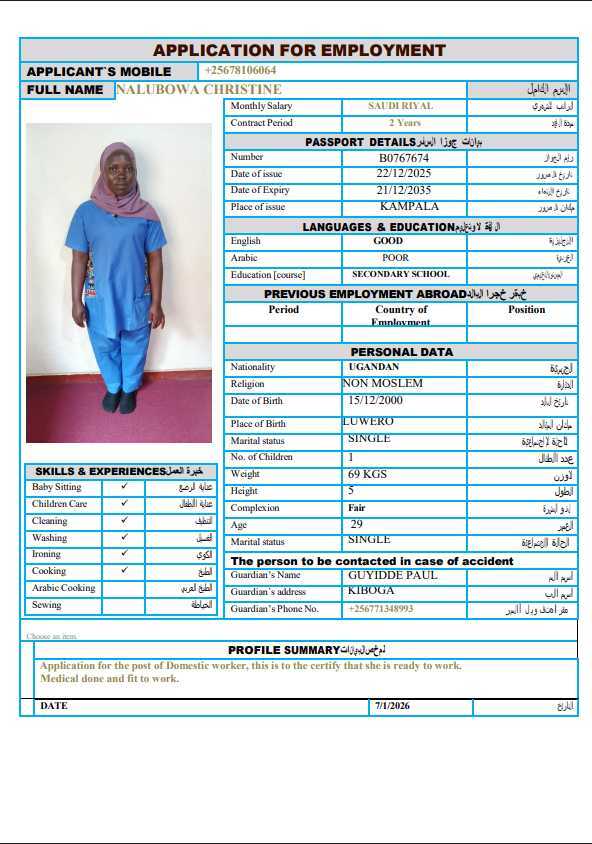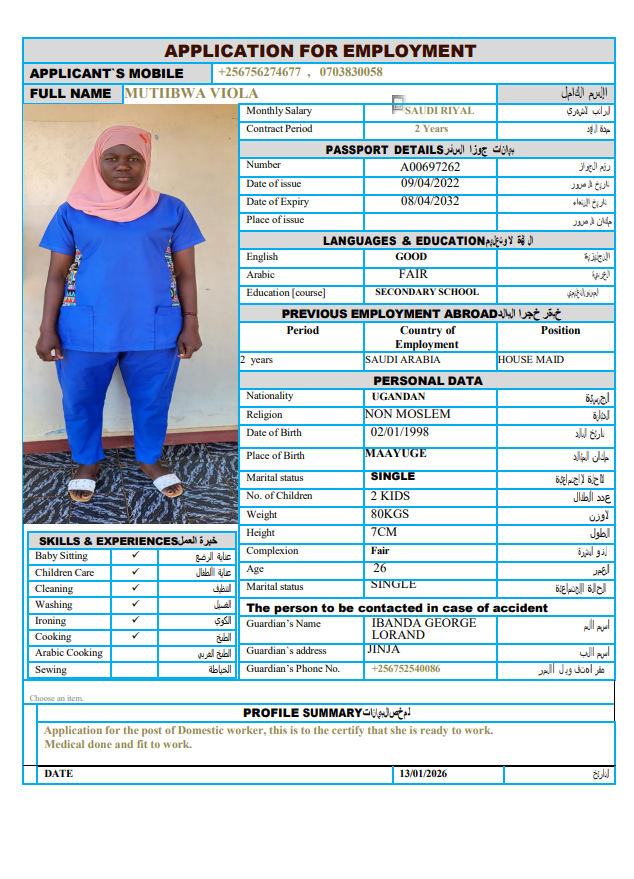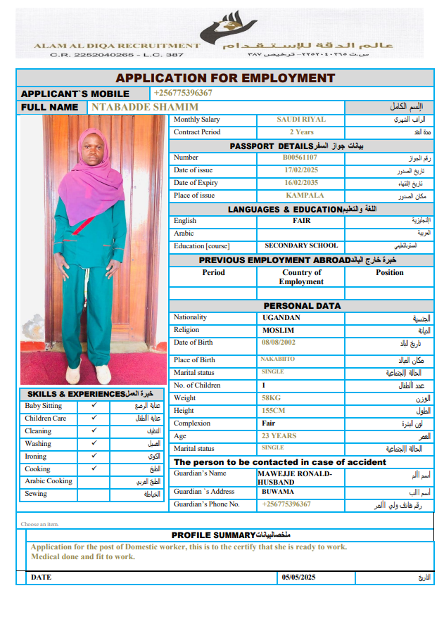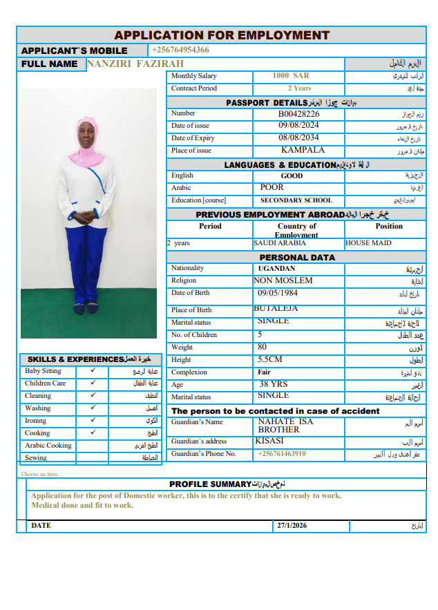 نوع الخدمة نوع الخدمة استقدام تأجير نقل خدمات الجنسية الجنسية الفلبين الهند اثيوبيا بروندي بنغلاديش أوغندا سريلانكا كينيا اندونيسيا غانا المهنة عاملة منزلية سائق خاص عاملة عناية ممرضة منزلية الديانة مسلم غير مسلم الخبرة سبق العمل لم يسبق العمل بحث مسح nansubuga أوغندا العمر 37 الخبرة لم يسبق العمل الديانة غير مسلم رقم الملف b00798458 حجز العاملة domestic أوغندا العمر 36 الخبرة لم يسبق العمل الديانة غير مسلم رقم الملف b00814664 حجز العاملة nanziri أوغندا العمر 38 الخبرة سبق العمل الديانة غير مسلم رقم الملف b00428226 حجز العاملة BABIRYE GLORIA أوغندا العمر 26 الخبرة سبق العمل الديانة غير مسلم رقم الملف a00697154 حجز العاملة السير الذاتية mutiibwa viola أوغندا العمر 26 الخبرة سبق العمل الديانة غير مسلم رقم الملف a00697262 حجز العاملة السير الذاتية NABAWESI MARIAM BABIRYE أوغندا العمر 28 الخبرة لم يسبق العمل الديانة غير مسلم رقم الملف a00410712 حجز العاملة السير الذاتية NALUGO PAULINA أوغندا العمر 42 الخبرة لم يسبق العمل الديانة غير مسلم رقم الملف b00407734 حجز العاملة السير الذاتية NALUBOWA CHRISTINE أوغندا العمر 29 الخبرة لم يسبق العمل الديانة غير مسلم رقم الملف b0767674 حجز العاملة السير الذاتية NAMUKASA DIANA أوغندا العمر 27 الخبرة لم يسبق العمل الديانة غير مسلم رقم الملف b00536280 حجز العاملة السير الذاتية ttuta aisha أوغندا العمر 24 الخبرة لم يسبق العمل الديانة غير مسلم رقم الملف b00407294 حجز العاملة السير الذاتية 16 17 18 19 20 21 22 23 24