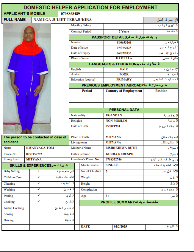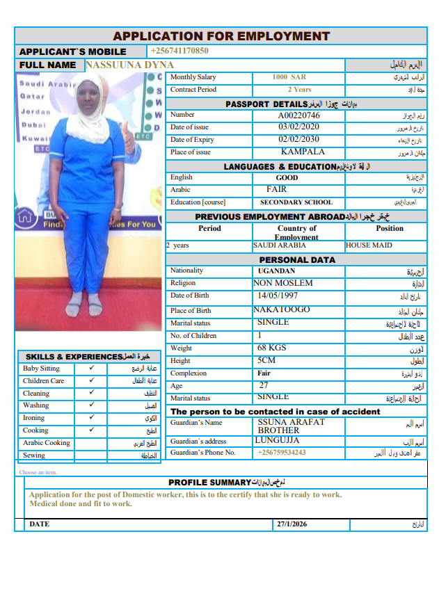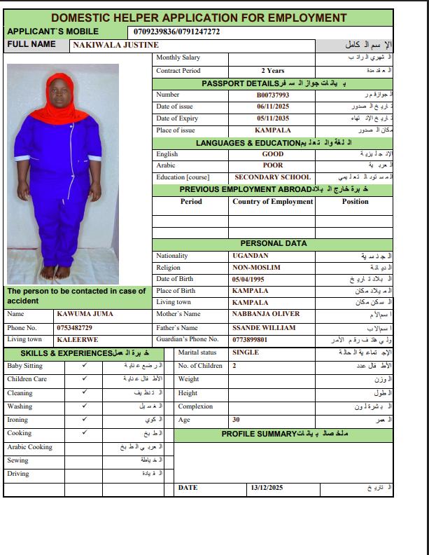 نوع الخدمة نوع الخدمة استقدام تأجير نقل خدمات الجنسية الجنسية الفلبين الهند اثيوبيا بروندي بنغلاديش أوغندا سريلانكا كينيا اندونيسيا غانا المهنة عاملة منزلية سائق خاص عاملة عناية ممرضة منزلية الديانة مسلم غير مسلم الخبرة سبق العمل لم يسبق العمل بحث مسح nangobi أوغندا العمر 27 الخبرة لم يسبق العمل الديانة غير مسلم رقم الملف a00614171 حجز العاملة السير الذاتية nakabugo أوغندا العمر 30 الخبرة لم يسبق العمل الديانة غير مسلم رقم الملف b00051248 حجز العاملة السير الذاتية NASSUUNA DYNA أوغندا العمر 29 الخبرة لم يسبق العمل الديانة غير مسلم رقم الملف a0020746 حجز العاملة السير الذاتية nakiwala أوغندا العمر 31 الخبرة لم يسبق العمل الديانة غير مسلم رقم الملف b00737993 حجز العاملة السير الذاتية namuga أوغندا العمر 32 الخبرة لم يسبق العمل الديانة غير مسلم رقم الملف b00653261 حجز العاملة السير الذاتية GRACE NAFULA كينيا العمر 35 الخبرة سبق العمل الديانة غير مسلم رقم الملف AK1022619 حجز العاملة GLORIA كينيا العمر 29 الخبرة سبق العمل الديانة غير مسلم رقم الملف AK1090806 حجز العاملة ASMIN KHAKUBI كينيا العمر 31 الخبرة لم يسبق العمل الديانة غير مسلم رقم الملف BK806499 حجز العاملة VIVAN LWOMBO كينيا العمر 29 الخبرة لم يسبق العمل الديانة غير مسلم رقم الملف BK724028 حجز العاملة JACINTA WAFULA كينيا العمر 21 الخبرة لم يسبق العمل الديانة غير مسلم رقم الملف AK1525165 حجز العاملة السير الذاتية 17 18 19 20 21 22 23 24 25