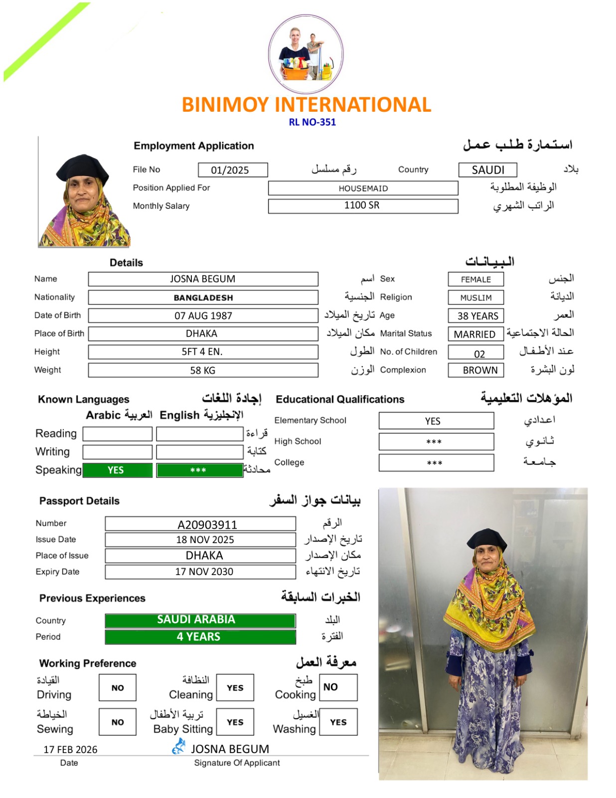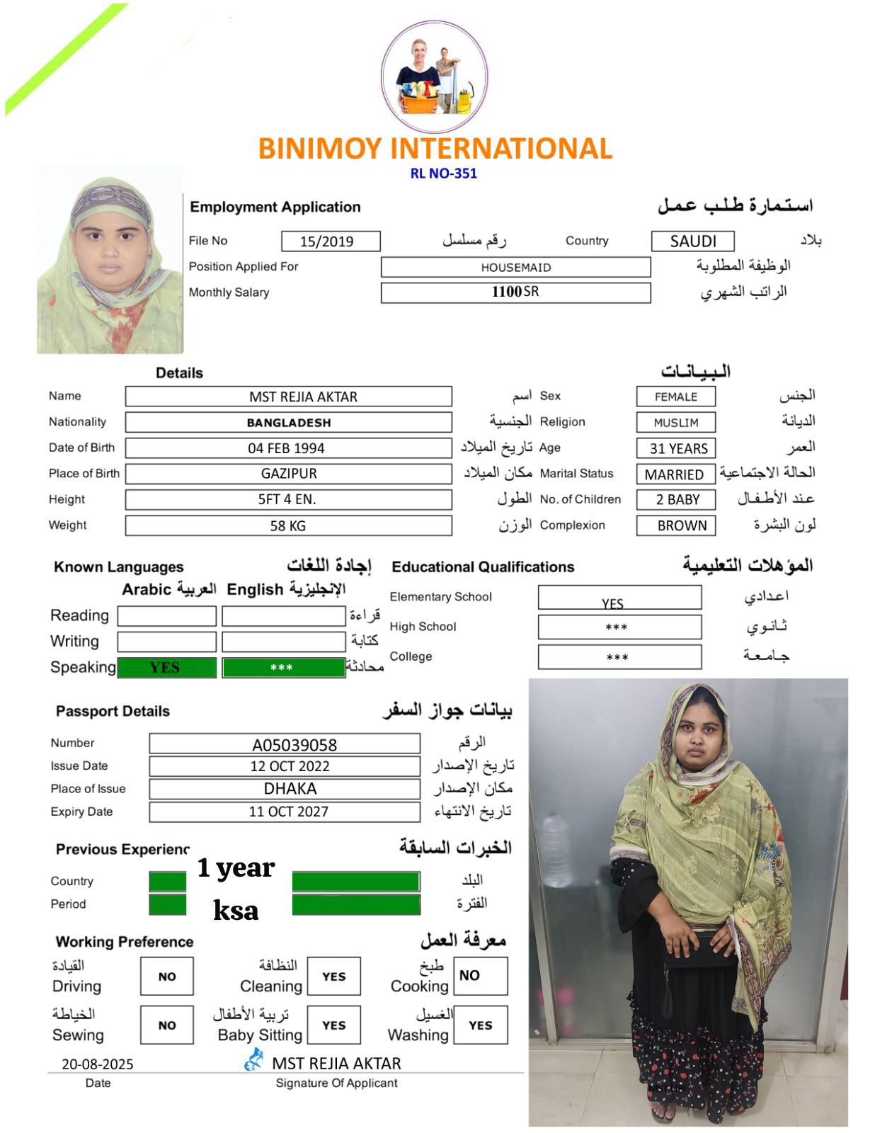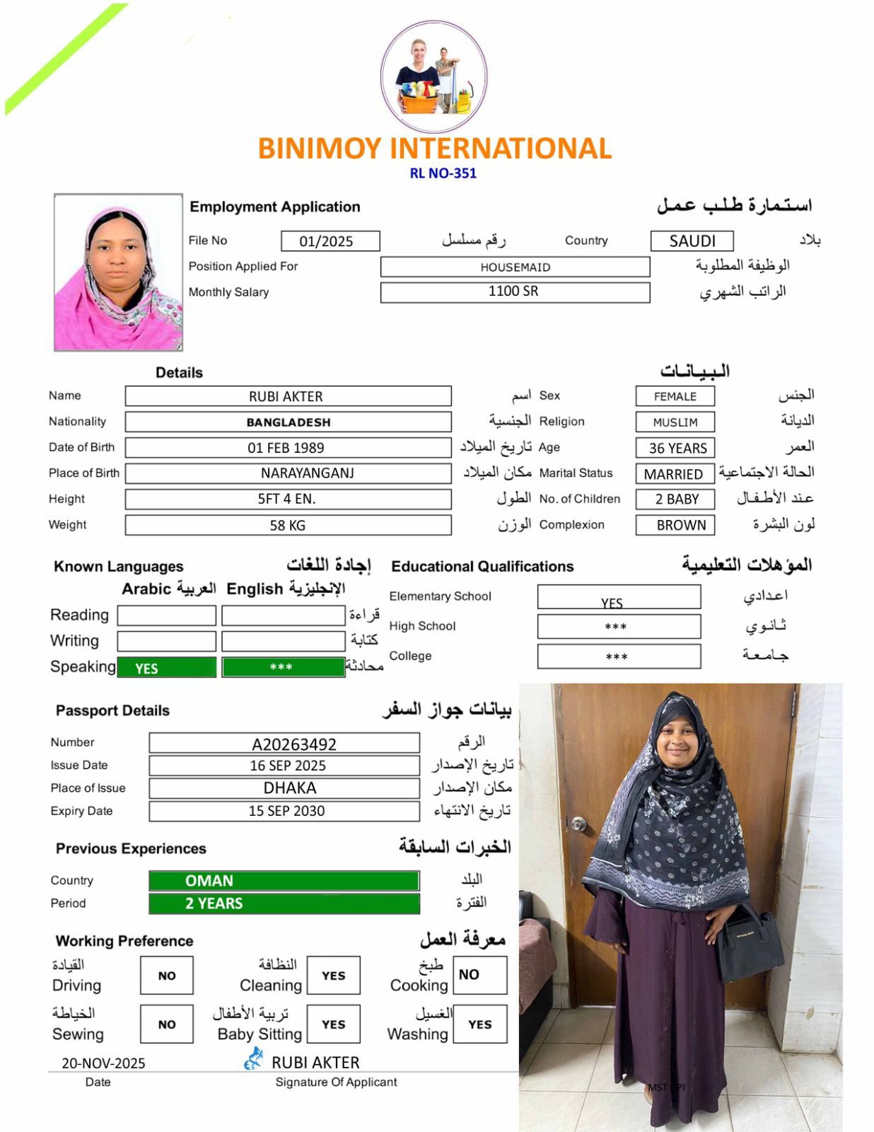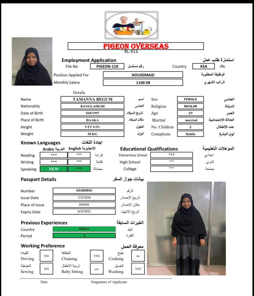 نوع الخدمة نوع الخدمة استقدام تأجير نقل خدمات الجنسية الجنسية الفلبين الهند اثيوبيا بروندي بنغلاديش أوغندا سريلانكا كينيا اندونيسيا غانا المهنة عاملة منزلية سائق خاص عاملة عناية ممرضة منزلية الديانة مسلم غير مسلم الخبرة سبق العمل لم يسبق العمل بحث مسح NISHANTHI سريلانكا العمر 40 الخبرة سبق العمل الديانة غير مسلم رقم الملف N11135478 حجز العاملة JACKLINE العمر 24 الخبرة لم يسبق العمل الديانة غير مسلم رقم الملف B00768338 حجز العاملة VICKY أوغندا العمر 23 الخبرة لم يسبق العمل الديانة غير مسلم رقم الملف B00539393 حجز العاملة BETTY أوغندا العمر 36 الخبرة لم يسبق العمل الديانة غير مسلم رقم الملف B00780607 حجز العاملة NATABONA MARTHA أوغندا العمر 35 الخبرة سبق العمل الديانة غير مسلم رقم الملف 00649377A حجز العاملة REJIA بنغلاديش العمر 31 الخبرة سبق العمل الديانة مسلم رقم الملف A05039058 حجز العاملة JOSNA بنغلاديش العمر 38 الخبرة سبق العمل الديانة مسلم رقم الملف A20903911 حجز العاملة RUBI بنغلاديش العمر 36 الخبرة سبق العمل الديانة مسلم رقم الملف A20263492 حجز العاملة AKTHER LUBNA بنغلاديش العمر 27 الخبرة سبق العمل الديانة مسلم رقم الملف A16032591 حجز العاملة TAMANNA بنغلاديش العمر 29 الخبرة سبق العمل الديانة مسلم رقم الملف A21662810 حجز العاملة 1 2 3 4 5 6 7