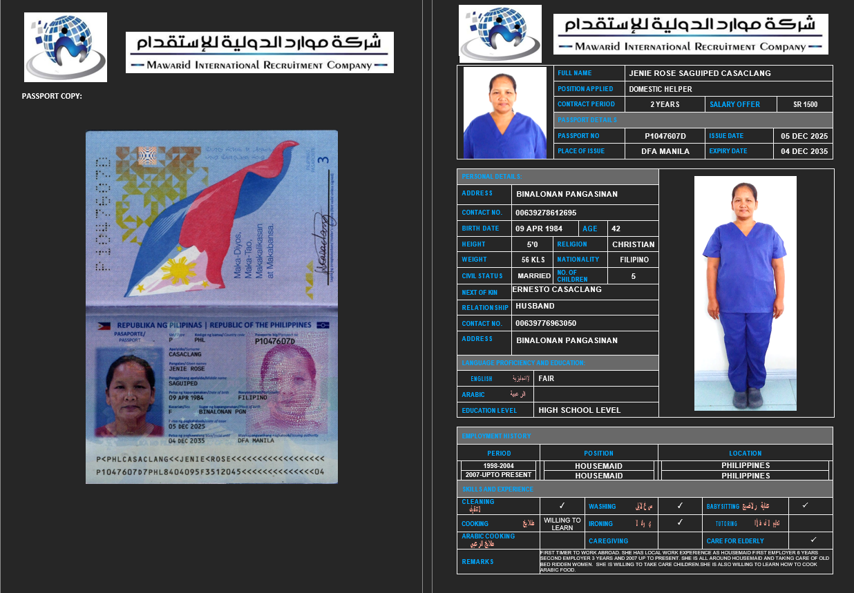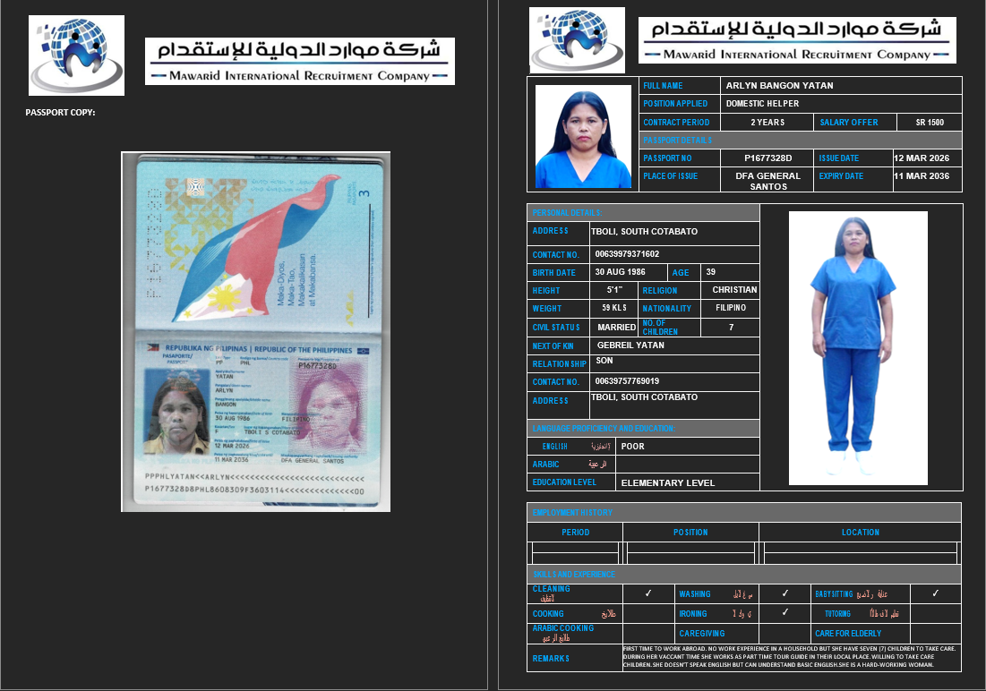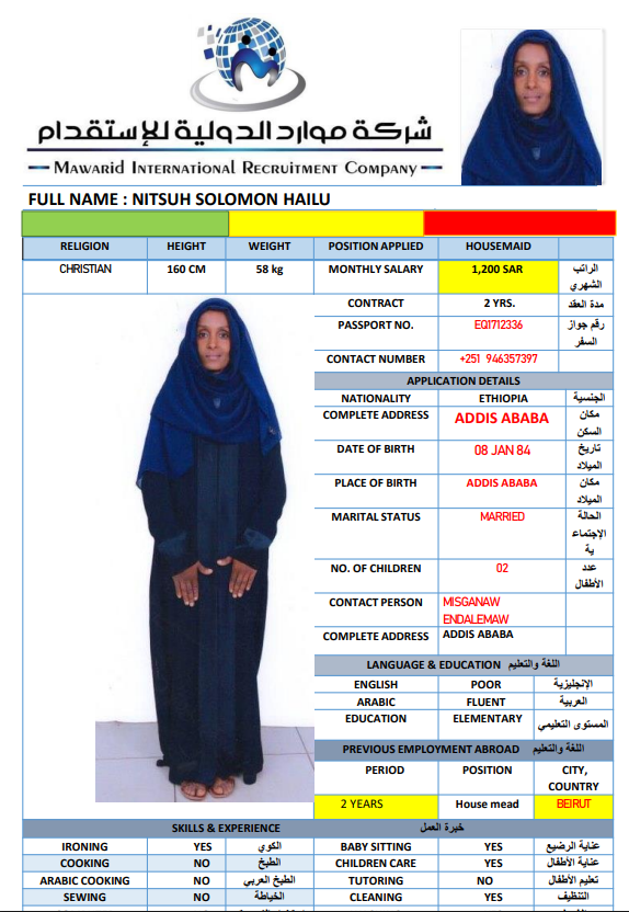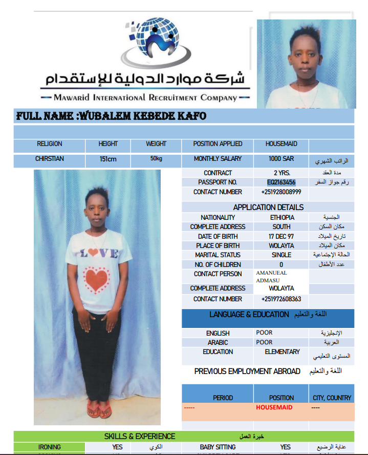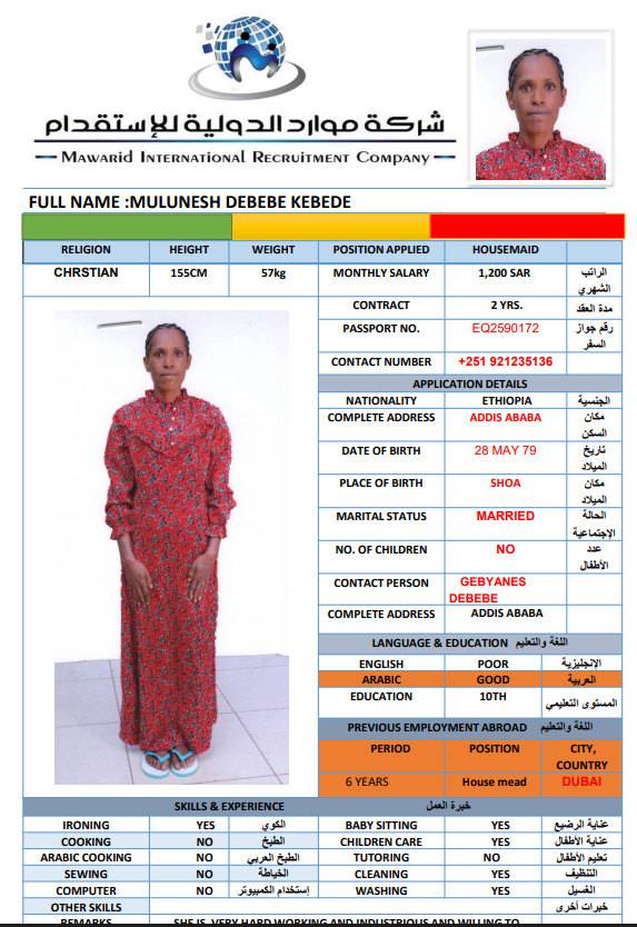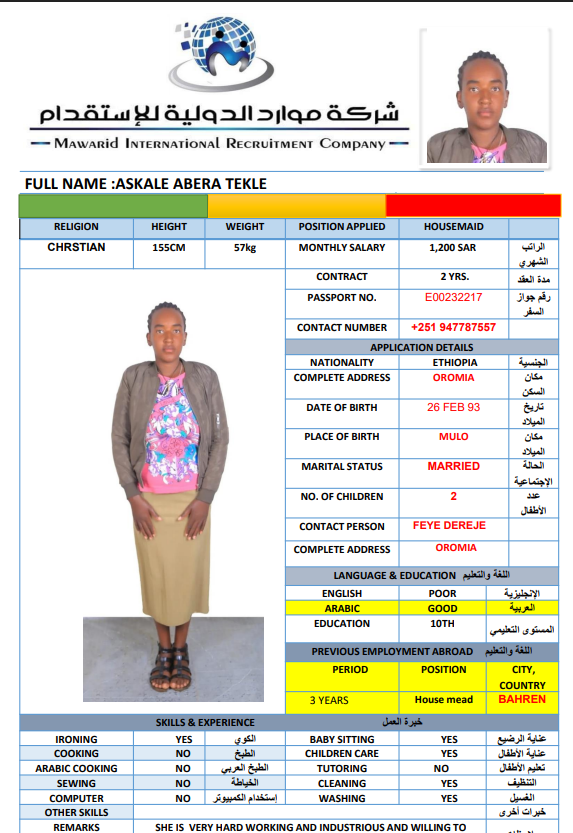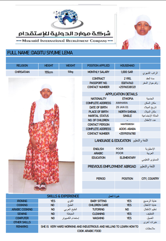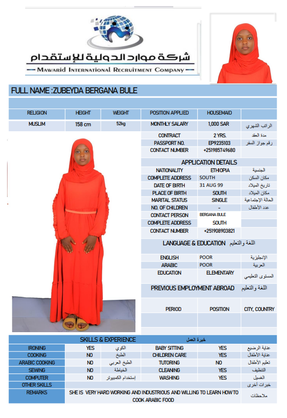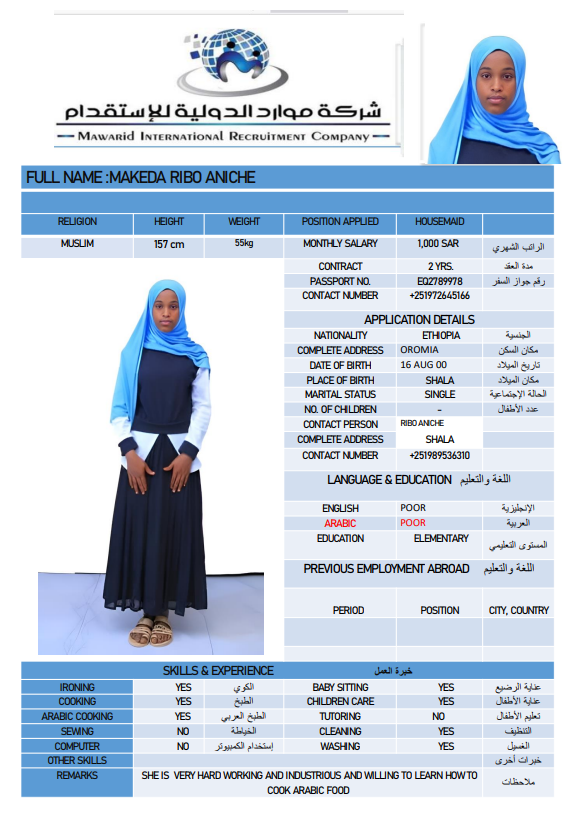 نوع الخدمة نوع الخدمة استقدام تأجير نقل خدمات الجنسية الجنسية الفلبين الهند اثيوبيا بروندي بنغلاديش أوغندا سريلانكا كينيا اندونيسيا غانا المهنة عاملة منزلية سائق خاص عاملة عناية ممرضة منزلية الديانة مسلم غير مسلم الخبرة سبق العمل لم يسبق العمل بحث مسح MULUNESH DEBEBE KEBEDE اثيوبيا العمر 47 الخبرة سبق العمل الديانة غير مسلم رقم الملف EQ2590172 حجز العاملة ASKALE ABERA TEKLE اثيوبيا العمر 33 الخبرة سبق العمل الديانة غير مسلم رقم الملف E00232217 حجز العاملة NITSUH SOLOMON HAILU اثيوبيا العمر 42 الخبرة سبق العمل الديانة غير مسلم رقم الملف EQ1712336 حجز العاملة JENIE ROSE SAGUIPED CASACLANG الفلبين العمر 42 الخبرة لم يسبق العمل الديانة غير مسلم رقم الملف P1047607D حجز العاملة MAKEDA RIBO ANICHE اثيوبيا العمر 26 الخبرة لم يسبق العمل الديانة مسلم رقم الملف EQ2789978 حجز العاملة WUBALEM KEBEDE KAFO اثيوبيا العمر 29 الخبرة لم يسبق العمل الديانة غير مسلم رقم الملف EQ2163456 حجز العاملة ARLYN BANGON YATAN الفلبين العمر 39 الخبرة لم يسبق العمل الديانة غير مسلم رقم الملف P1677328D حجز العاملة ZUBEYDA BERGANA BULE اثيوبيا العمر 27 الخبرة لم يسبق العمل الديانة مسلم رقم الملف 9235103EP حجز العاملة DAGITU SIYUME LEMA اثيوبيا العمر 25 الخبرة لم يسبق العمل الديانة غير مسلم رقم الملف EQ1741163 حجز العاملة انتان اندونيسيا العمر 31 الخبرة سبق العمل الديانة مسلم رقم الملف ثصبشل حجز العاملة 1 2 3 4 5 6 7 8 9