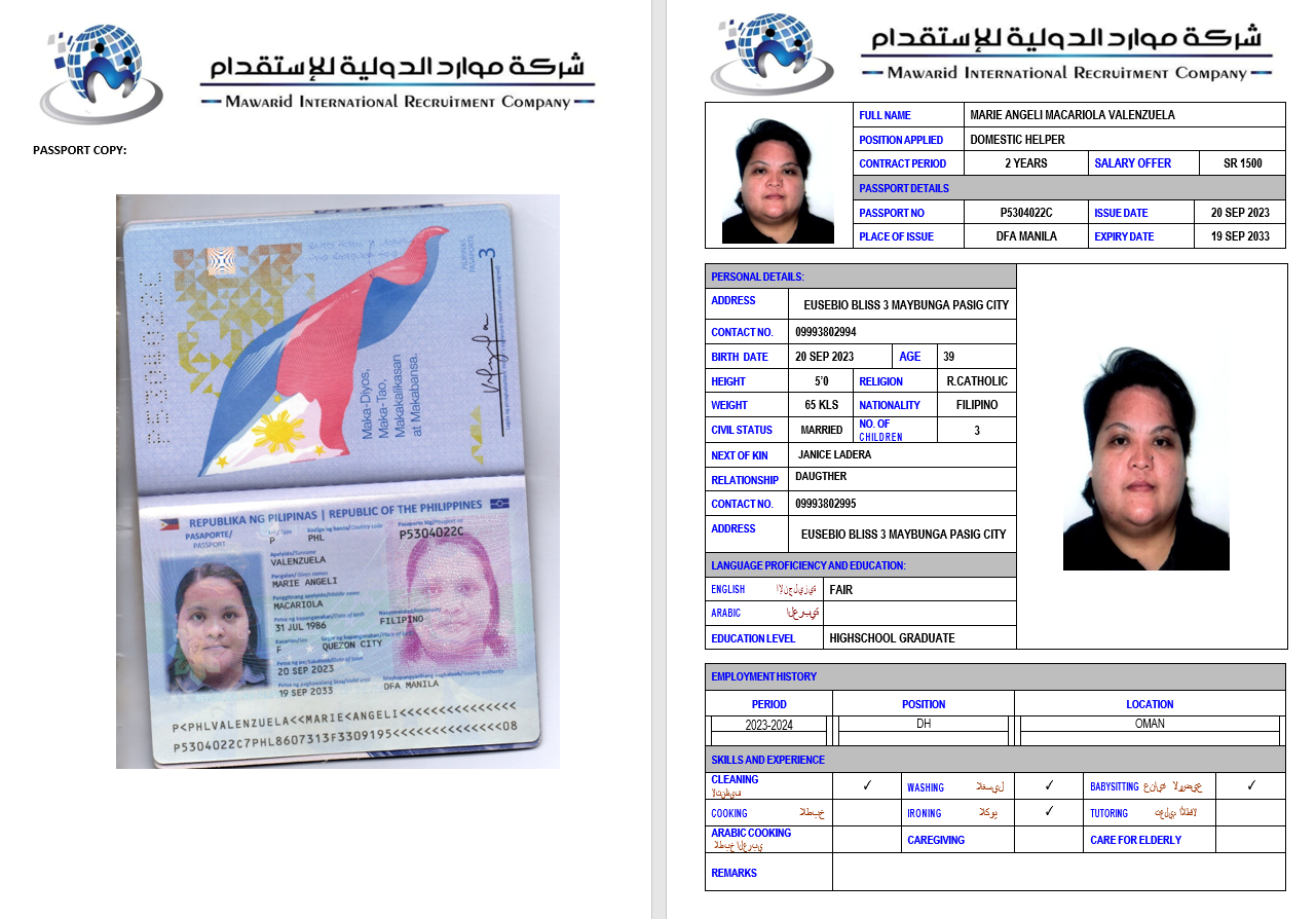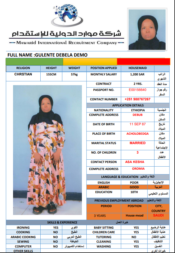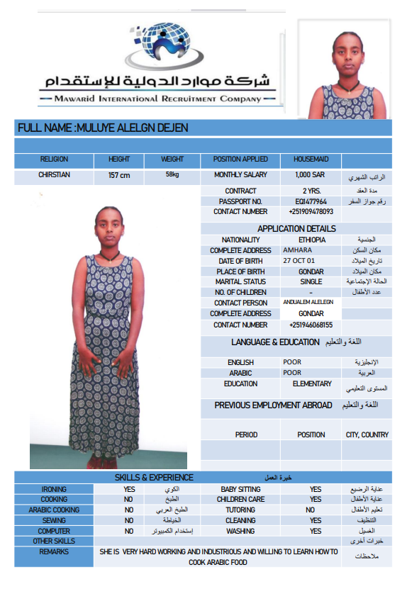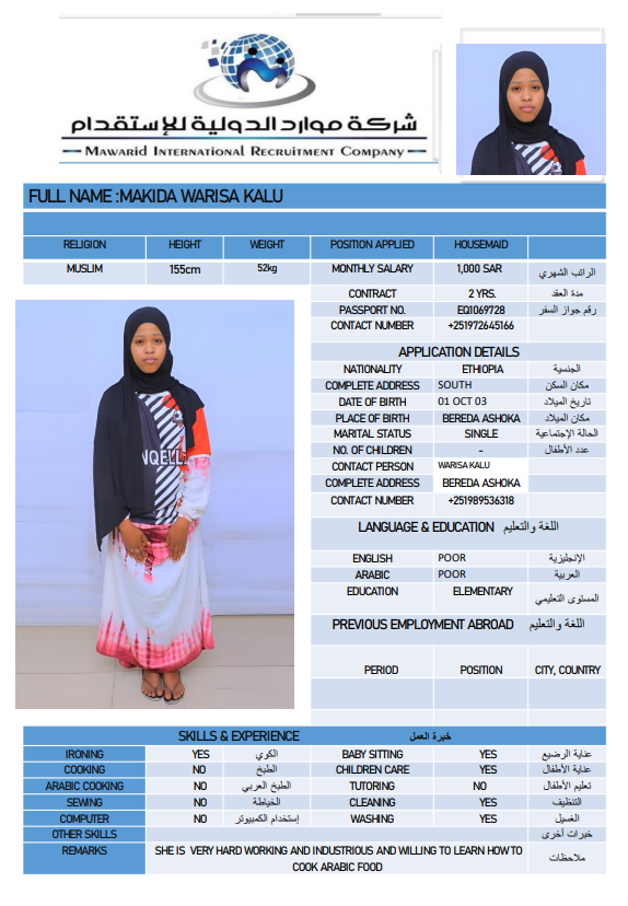نوع الخدمة نوع الخدمة استقدام تأجير نقل خدمات الجنسية الجنسية الفلبين الهند اثيوبيا بروندي بنغلاديش أوغندا سريلانكا كينيا اندونيسيا غانا المهنة عاملة منزلية سائق خاص عاملة عناية ممرضة منزلية الديانة مسلم غير مسلم الخبرة سبق العمل لم يسبق العمل بحث مسح MISAYE WORKINEH HAYILE اثيوبيا العمر 28 الخبرة لم يسبق العمل الديانة غير مسلم رقم الملف EQ2002457 حجز العاملة TIRUYE GEBIYANEH TESHOME اثيوبيا العمر 33 الخبرة سبق العمل الديانة غير مسلم رقم الملف EQ1411083 حجز العاملة REZIKA BIYA ABADURA اثيوبيا العمر 26 الخبرة لم يسبق العمل الديانة مسلم رقم الملف EQ1220693 حجز العاملة RUMAZI ABAMOGA ABAGODU اثيوبيا العمر 24 الخبرة لم يسبق العمل الديانة مسلم رقم الملف EQ2633323 حجز العاملة MAKIDA WARISA KALU اثيوبيا العمر 23 الخبرة لم يسبق العمل الديانة مسلم رقم الملف EQ1069728 حجز العاملة MULUYE ALELGN DEJEN اثيوبيا العمر 25 الخبرة لم يسبق العمل الديانة غير مسلم رقم الملف EQ1477964 حجز العاملة MARIE ANGELI MACARIOLA VALENZUELA الفلبين العمر 39 الخبرة سبق العمل الديانة غير مسلم رقم الملف P5304022C حجز العاملة GULENTE DEBELA DEMO اثيوبيا العمر 39 الخبرة سبق العمل الديانة غير مسلم رقم الملف E00156640 حجز العاملة BONTU NEGASH ABERA اثيوبيا العمر 26 الخبرة لم يسبق العمل الديانة غير مسلم رقم الملف EQ1563079 حجز العاملة JANICE SIERRA BUENAVENTURA الفلبين العمر 42 الخبرة لم يسبق العمل الديانة غير مسلم رقم الملف P1680175D حجز العاملة 3 4 5 6 7 8 9 10 11