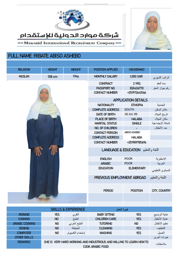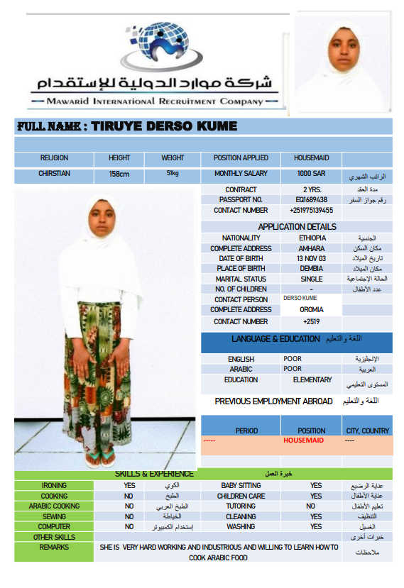 نوع الخدمة نوع الخدمة استقدام تأجير نقل خدمات الجنسية الجنسية الفلبين الهند اثيوبيا بروندي بنغلاديش أوغندا سريلانكا كينيا اندونيسيا غانا المهنة عاملة منزلية سائق خاص عاملة عناية ممرضة منزلية الديانة مسلم غير مسلم الخبرة سبق العمل لم يسبق العمل بحث مسح LENSA SHASHO NEME اثيوبيا العمر 24 الخبرة لم يسبق العمل الديانة غير مسلم رقم الملف E00098409 حجز العاملة LAYILA YASIN YAKESE اثيوبيا العمر 27 الخبرة لم يسبق العمل الديانة مسلم رقم الملف EQ1615147 حجز العاملة RIBATE ABISO ASHEBO اثيوبيا العمر 27 الخبرة لم يسبق العمل الديانة مسلم رقم الملف EQ1436770 حجز العاملة TIRUYE DERSO KUME اثيوبيا العمر 23 الخبرة لم يسبق العمل الديانة غير مسلم رقم الملف EQ1689438 حجز العاملة ALEMNESH AMARE GIETIE اثيوبيا العمر 23 الخبرة لم يسبق العمل الديانة غير مسلم رقم الملف EQ1193860 حجز العاملة MASTEWAL BAYU BIDIRIE اثيوبيا العمر 24 الخبرة لم يسبق العمل الديانة غير مسلم رقم الملف EQ1404753 حجز العاملة KALKIDAN SISAY ADESE اثيوبيا العمر 21 الخبرة لم يسبق العمل الديانة غير مسلم رقم الملف EQ1783707 حجز العاملة VILMA FERNANDEZ CABRADILLA الفلبين العمر 54 الخبرة سبق العمل الديانة غير مسلم رقم الملف P8566197A حجز العاملة MUNIYASAMY الهند العمر 36 الخبرة سبق العمل الديانة غير مسلم رقم الملف R4708725 حجز العاملة MUHAMMAD HASHIM الهند العمر 26 الخبرة سبق العمل الديانة مسلم رقم الملف T7202831 حجز العاملة 4 5 6 7 8 9 10 11 12