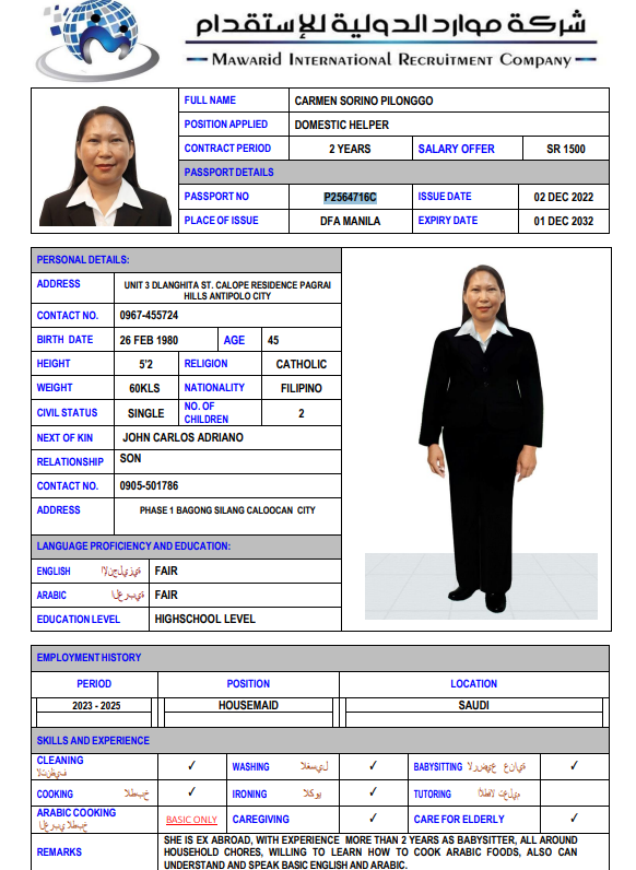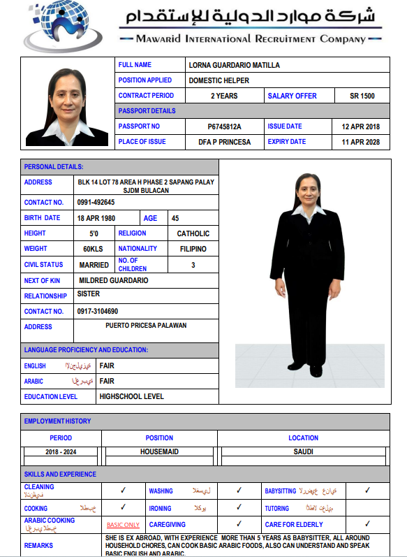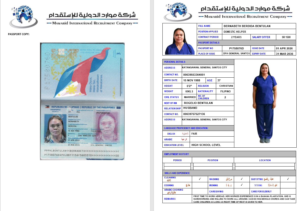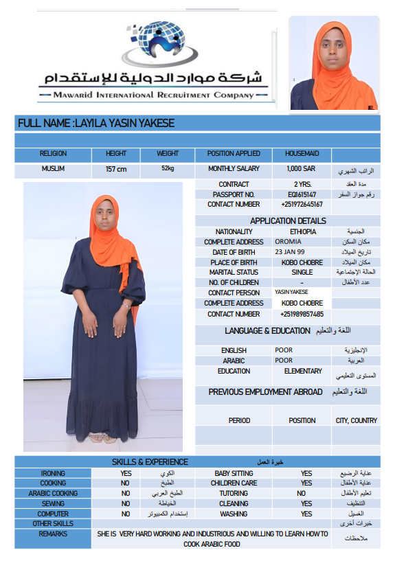 شركة موارد الدولية للإستقدام هي شركة متخصصة في مجال استقدام الأيدي العاملة المنزلية من جنسيات مختلفة بتصريح من وزارة العمل السعودية برقم ترخيص (82). نحن نعمل باستمرار على توفير وتدريب كوادر بشرية من مختلف الدول في تخصصات متنوعة؛ لكي تكون قادرة على تلبية جميع احتياجات عملائنا الكرام بكل نشاط وجدية وأمانة متناهية، وذلك لكافة قطاعات الأفراد، الأعمال والتوسط في الاستقدام، هذا بجانب إنهاء جميع الإجراءات لإستقدام العمالة. كما نقوم بخدمة عملائنا طيلة فترة العقد وحل أي مشكلة تتعلق بالعمالة، وذلك حرصًا منا على تطوير خدماتنا باستمرار لكي ننال رضا وثناء عملائنا دومًا.