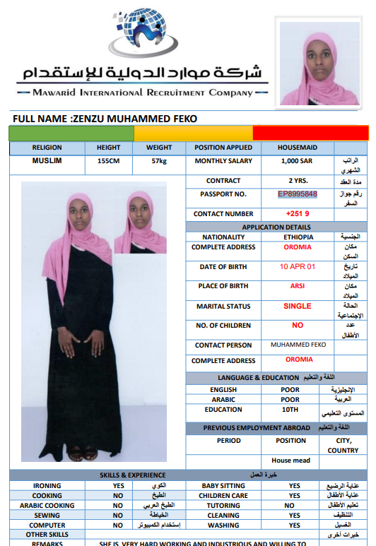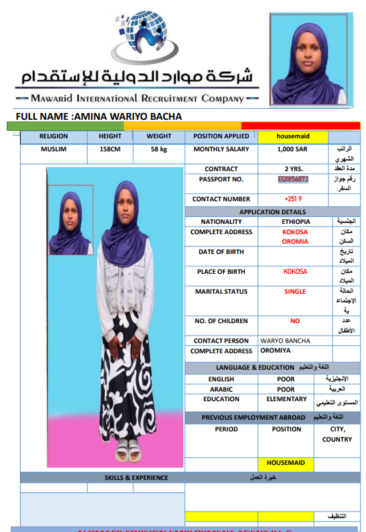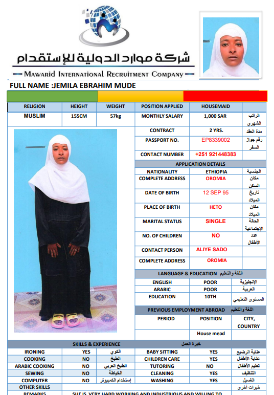 نوع الخدمة نوع الخدمة استقدام تأجير نقل خدمات الجنسية الجنسية الفلبين الهند اثيوبيا بروندي بنغلاديش أوغندا سريلانكا كينيا اندونيسيا غانا المهنة عاملة منزلية سائق خاص عاملة عناية ممرضة منزلية الديانة مسلم غير مسلم الخبرة سبق العمل لم يسبق العمل بحث مسح LORNA GUARDARIO MATILLA الفلبين العمر 45 الخبرة سبق العمل الديانة غير مسلم رقم الملف P6745812A حجز العاملة السير الذاتية RAQUEL SOSA SENDING الفلبين العمر 40 الخبرة لم يسبق العمل الديانة غير مسلم رقم الملف P1279431D حجز العاملة السير الذاتية CARMEN SORINO PILONGGO الفلبين العمر 45 الخبرة سبق العمل الديانة غير مسلم رقم الملف P2564716C حجز العاملة السير الذاتية ALMA MAGABILIN OPEÑANO الفلبين العمر 48 الخبرة سبق العمل الديانة غير مسلم رقم الملف P8872349A حجز العاملة السير الذاتية HAYAT DAWUD SEID اثيوبيا العمر 27 الخبرة لم يسبق العمل الديانة مسلم رقم الملف EQ2580833 حجز العاملة MEKIYA ABDULKADIR EBRAHIM اثيوبيا العمر 27 الخبرة لم يسبق العمل الديانة مسلم رقم الملف EP9143795 حجز العاملة السير الذاتية ZENZU MUHAMMED FEKO اثيوبيا العمر 24 الخبرة لم يسبق العمل الديانة مسلم رقم الملف EP8995848 حجز العاملة السير الذاتية AMINA WARIYO BACHA اثيوبيا العمر 26 الخبرة لم يسبق العمل الديانة مسلم رقم الملف EQ1856873 حجز العاملة السير الذاتية EYERUS BELAY HAYLEMARIYAM اثيوبيا العمر 24 الخبرة لم يسبق العمل الديانة غير مسلم رقم الملف EQ1350953 حجز العاملة السير الذاتية JEMILA EBRAHIM MUDE اثيوبيا العمر 30 الخبرة لم يسبق العمل الديانة مسلم رقم الملف EP8339002 حجز العاملة السير الذاتية 1 2 3 4