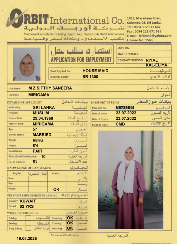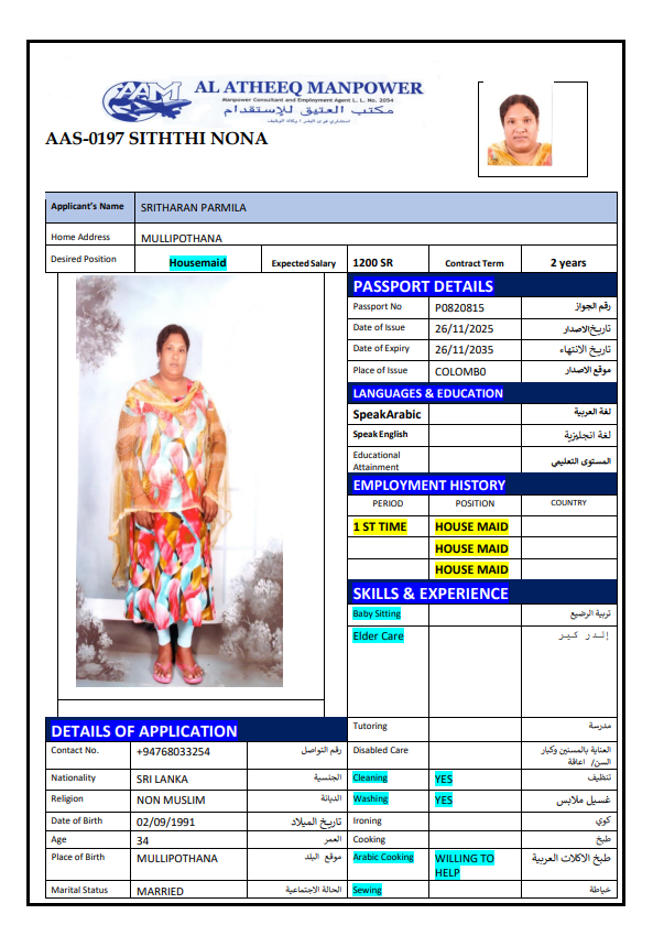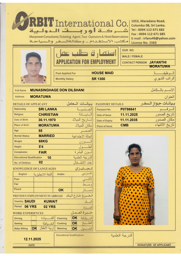 نوع الخدمة نوع الخدمة استقدام تأجير نقل خدمات الجنسية الجنسية الفلبين الهند اثيوبيا بروندي بنغلاديش أوغندا سريلانكا كينيا اندونيسيا غانا المهنة عاملة منزلية سائق خاص عاملة عناية الديانة مسلم غير مسلم الخبرة سبق العمل لم يسبق العمل بحث مسح Anguralage chandrani سريلانكا العمر 49 الخبرة سبق العمل الديانة غير مسلم رقم الملف P0821212 حجز العاملة NAWFER MOHAMMAD RISLA سريلانكا العمر 24 الخبرة لم يسبق العمل الديانة غير مسلم رقم الملف P0796409 حجز العاملة SRITHARAN PARMILA سريلانكا العمر 34 الخبرة سبق العمل الديانة غير مسلم رقم الملف P0820815 حجز العاملة SUVENDRA سريلانكا العمر 48 الخبرة سبق العمل الديانة غير مسلم رقم الملف P0818287 حجز العاملة MAHADEVAN سريلانكا العمر 46 الخبرة لم يسبق العمل الديانة غير مسلم رقم الملف P0670826 حجز العاملة MUNASINGHAGE DON DILSHANI سريلانكا العمر 55 الخبرة سبق العمل الديانة غير مسلم رقم الملف P0786841 حجز العاملة السير الذاتية KANAPATHIPILLAI SINNATHAMBY سريلانكا العمر 49 الخبرة سبق العمل الديانة غير مسلم رقم الملف N11212753 حجز العاملة السير الذاتية M Z SITTHY SANEERA سريلانكا العمر 57 الخبرة سبق العمل الديانة مسلم رقم الملف N9728614 حجز العاملة السير الذاتية IMMAM SHAIF AISHA UMMA سريلانكا العمر 51 الخبرة سبق العمل الديانة مسلم رقم الملف N11369051 حجز العاملة السير الذاتية