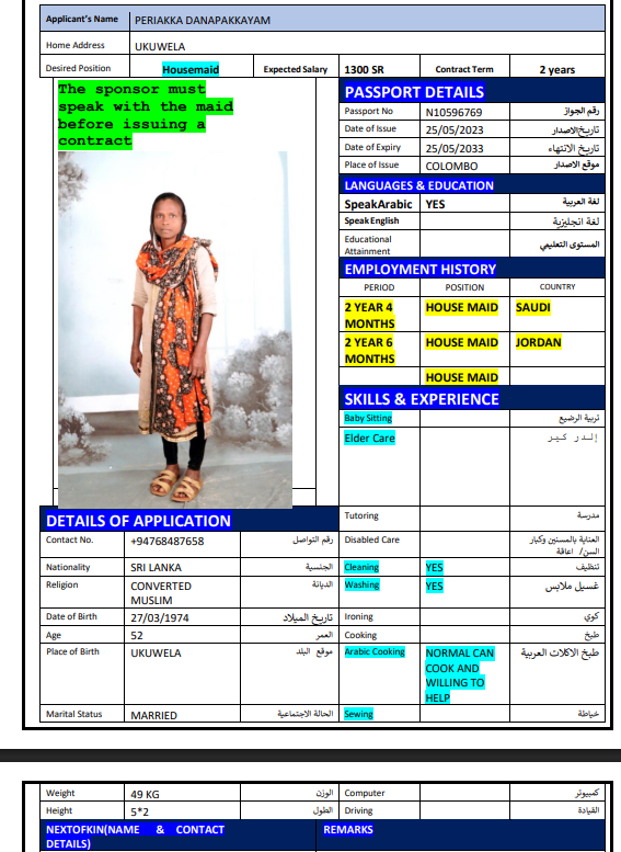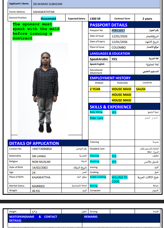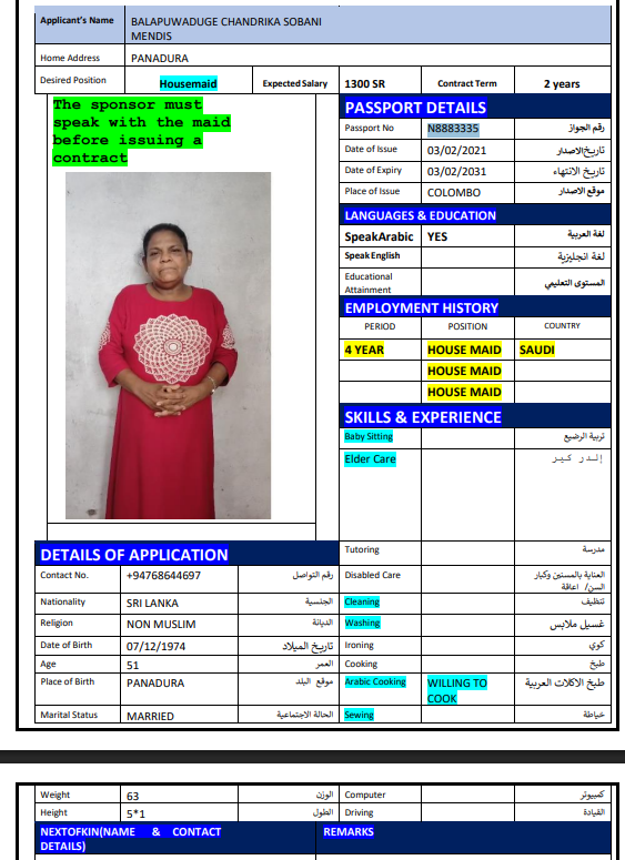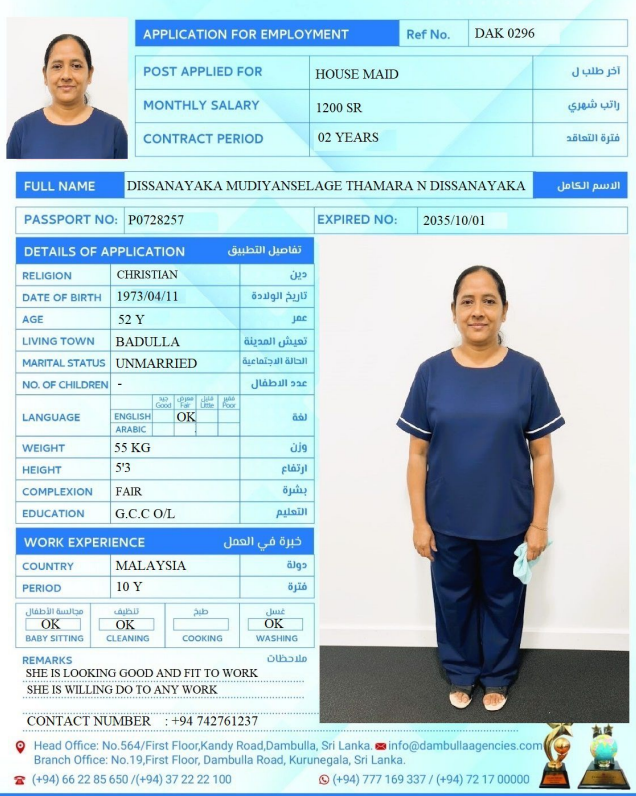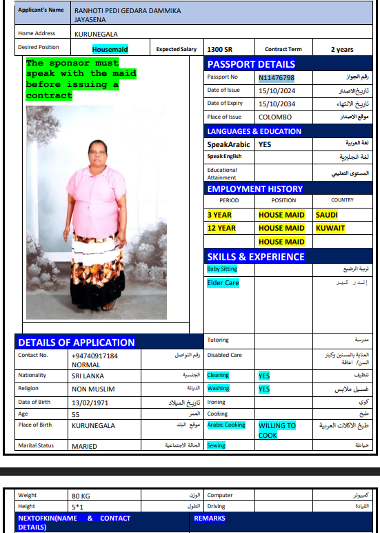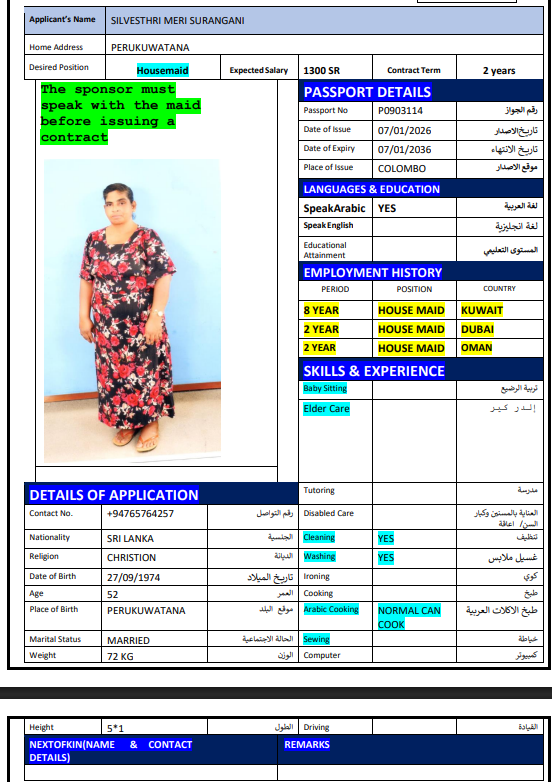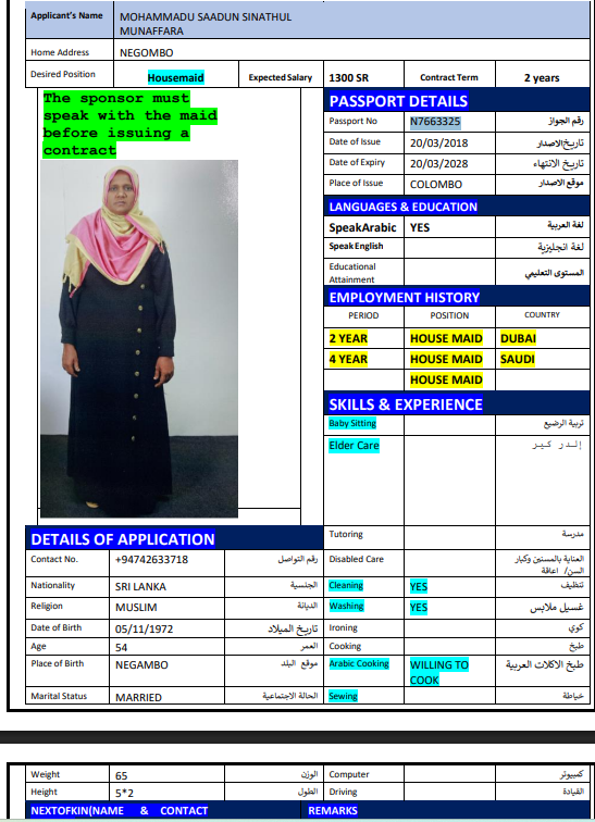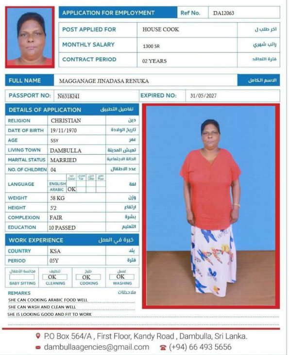 Service Type Service Type Recruitment Rent Transfer Services Nationality Nationality Philippines India Ethiopia Burundi Bangladesh Uganda Sri Lanka KENIA Indonesia Ghana Career Housemaid Family driver Care worker Home nurse Religion Muslim Non-Muslim Choose Experience Previous Work Never Worked Search Clear GAMAGE TENSIKA DINUKSHI Sri Lanka Age 48 Experince Previous Work Relegion Non-Muslim File Number N10446466 Reserve the worker SELWARAD SUBASANI Sri Lanka Age 24 Experince Previous Work Relegion Non-Muslim File Number P0911017 Reserve the worker CV PERIAKKA DANAPAKKAYAM Sri Lanka Age 52 Experince Previous Work Relegion Non-Muslim File Number N10596769 Reserve the worker CV RANHOTI PEDI GEDARA DAMMIKA Sri Lanka Age 55 Experince Previous Work Relegion Non-Muslim File Number N11476798 Reserve the worker CV BULATHSINHALA INDRA KUMARI Sri Lanka Age 52 Experince Previous Work Relegion Non-Muslim File Number P0796215 Reserve the worker CV MOHAMMADU SAADUN SINATHU Sri Lanka Age 54 Experince Previous Work Relegion Muslim File Number N7663325 Reserve the worker CV BALAPUWADUGE CHANDRIKA SOBANI MENDIS Sri Lanka Age 51 Experince Previous Work Relegion Non-Muslim File Number N8883335 Reserve the worker CV SILVESTHRI MERI SURANGANI Sri Lanka Age 52 Experince Previous Work Relegion Non-Muslim File Number P0903114 Reserve the worker CV DISSANAYAKA MUDIYANSELAGE THAMARA N DISSANAYAKA Sri Lanka Age 52 Experince Previous Work Relegion Non-Muslim File Number P0728257 Reserve the worker CV MAGGANAGE JINADASA RENUKA Sri Lanka Age 55 Experince Previous Work Relegion Non-Muslim File Number N6318241 Reserve the worker CV 1 2