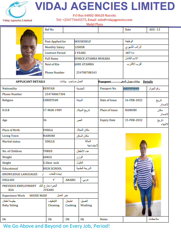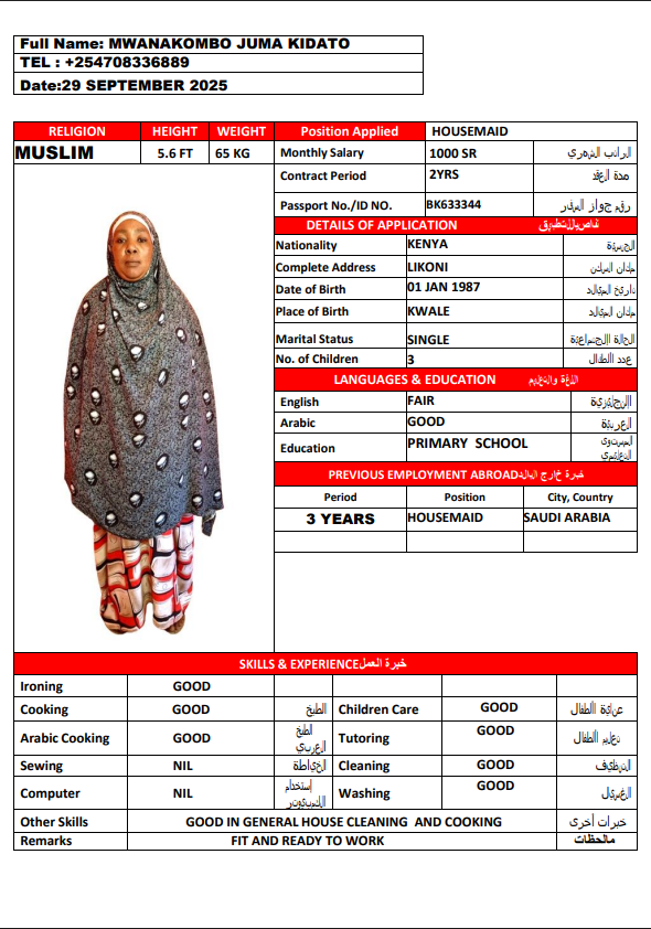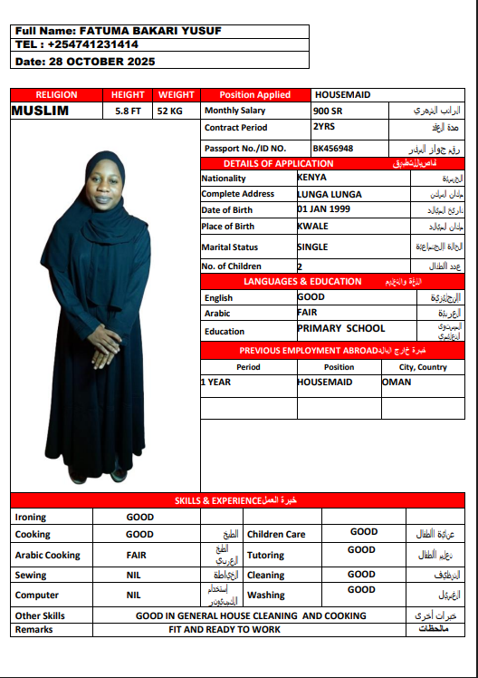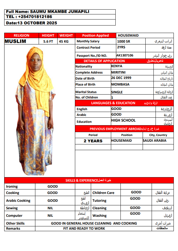 نوع الخدمة نوع الخدمة استقدام تأجير نقل خدمات الجنسية الجنسية الفلبين الهند اثيوبيا بروندي بنغلاديش أوغندا سريلانكا كينيا اندونيسيا غانا المهنة عاملة منزلية سائق خاص عاملة عناية الديانة مسلم غير مسلم الخبرة سبق العمل لم يسبق العمل بحث مسح UMAZI كينيا العمر 26 الخبرة سبق العمل الديانة مسلم رقم الملف AK0987999 حجز العاملة FATUMA كينيا العمر 26 الخبرة سبق العمل الديانة مسلم رقم الملف BK456948 حجز العاملة SAUMU كينيا العمر 26 الخبرة سبق العمل الديانة مسلم رقم الملف AK1307106 حجز العاملة EUNICE ATAMBA MUKARA كينيا العمر 36 الخبرة سبق العمل الديانة غير مسلم رقم الملف AK0999849 حجز العاملة السير الذاتية NGOLO FLORENCE TABU كينيا العمر 46 الخبرة سبق العمل الديانة غير مسلم رقم الملف AK1666419 حجز العاملة السير الذاتية LUSWETI SOLOME NANGILA كينيا العمر 38 الخبرة سبق العمل الديانة غير مسلم رقم الملف BK251987 حجز العاملة السير الذاتية MWANAKOMBO JUMA KIDATO كينيا العمر 38 الخبرة سبق العمل الديانة مسلم رقم الملف BK633344 حجز العاملة السير الذاتية CHRISTABEL OMUMASABA MUTSOLI كينيا العمر 29 الخبرة لم يسبق العمل الديانة غير مسلم رقم الملف BK8530290 حجز العاملة السير الذاتية SARAH NASIMIYU SIMIYU كينيا العمر 32 الخبرة لم يسبق العمل الديانة غير مسلم رقم الملف BK9917930 حجز العاملة السير الذاتية CAROL MUMBI MUTUA كينيا العمر 25 الخبرة لم يسبق العمل الديانة غير مسلم رقم الملف BK1116819 حجز العاملة السير الذاتية 1 2
