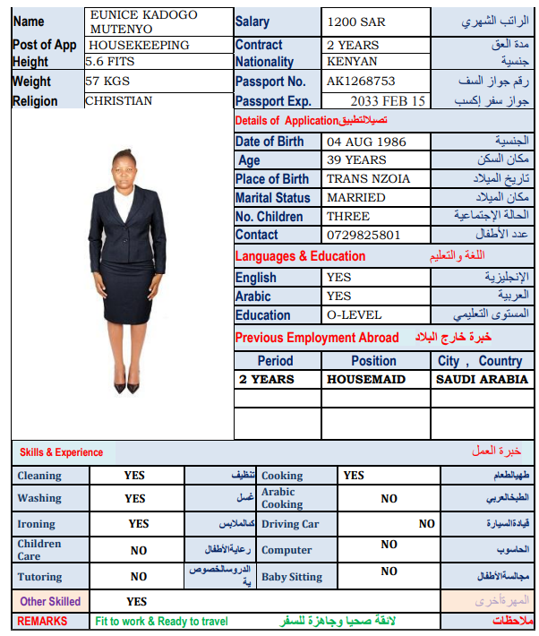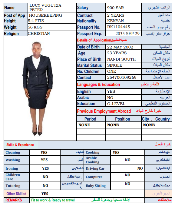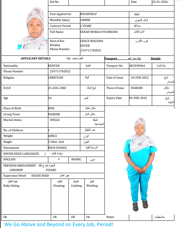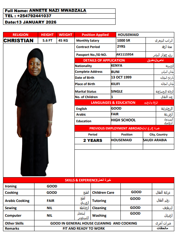 نوع الخدمة نوع الخدمة استقدام تأجير نقل خدمات الجنسية الجنسية الفلبين الهند اثيوبيا بروندي بنغلاديش أوغندا سريلانكا كينيا اندونيسيا غانا المهنة عاملة منزلية سائق خاص عاملة عناية ممرضة منزلية الديانة مسلم غير مسلم الخبرة سبق العمل لم يسبق العمل بحث مسح NGUGI ROSEMARY WAMBUI كينيا العمر 36 الخبرة لم يسبق العمل الديانة غير مسلم رقم الملف AK0975730 حجز العاملة LYDIA NYABOKE ONSARE كينيا العمر 35 الخبرة سبق العمل الديانة غير مسلم رقم الملف BK186941 حجز العاملة السير الذاتية ANNETE NAZI MWADZALA كينيا العمر 26 الخبرة سبق العمل الديانة غير مسلم رقم الملف AK1115954 حجز العاملة السير الذاتية SARAH MORAA NYAMBANE كينيا العمر 24 الخبرة لم يسبق العمل الديانة غير مسلم رقم الملف AK1038464 حجز العاملة السير الذاتية EUNICE KADOGO MUTENYO كينيا العمر 39 الخبرة سبق العمل الديانة غير مسلم رقم الملف AK1268753 حجز العاملة السير الذاتية IRENE AEMBE كينيا العمر 38 الخبرة سبق العمل الديانة غير مسلم رقم الملف AK1090805 حجز العاملة السير الذاتية CAROL MUMBI MUTUA كينيا العمر 25 الخبرة لم يسبق العمل الديانة غير مسلم رقم الملف BK1116819 حجز العاملة السير الذاتية CYNTHIA VIRGINIA OKUMU كينيا العمر 27 الخبرة لم يسبق العمل الديانة غير مسلم رقم الملف BK1144545 حجز العاملة السير الذاتية ELIZA KADZO KAZUNGU كينيا العمر 30 الخبرة لم يسبق العمل الديانة غير مسلم رقم الملف BK148512 حجز العاملة السير الذاتية LUCY VUGUTZA PETER كينيا العمر 23 الخبرة لم يسبق العمل الديانة غير مسلم رقم الملف BK1104445 حجز العاملة السير الذاتية 1 2 3