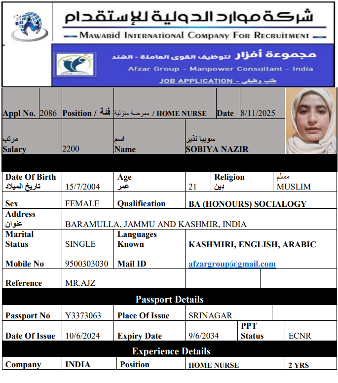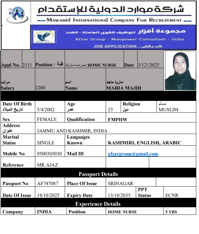 نوع الخدمة نوع الخدمة استقدام تأجير نقل خدمات الجنسية الجنسية الفلبين الهند اثيوبيا بروندي بنغلاديش أوغندا سريلانكا كينيا اندونيسيا غانا المهنة عاملة منزلية سائق خاص عاملة عناية ممرضة منزلية الديانة مسلم غير مسلم الخبرة سبق العمل لم يسبق العمل بحث مسح SABREENA MEHJOOR MEHJOOR AHMAD PARRAY الهند العمر 23 الخبرة لم يسبق العمل الديانة مسلم رقم الملف AD434964 حجز العاملة SHAMIM UL REHMAN ABDUL REHMAN LONE الهند العمر 28 الخبرة لم يسبق العمل الديانة مسلم رقم الملف Y9625889 حجز العاملة DHASTHAGEER الهند العمر 32 الخبرة سبق العمل الديانة مسلم رقم الملف C7157533 حجز العاملة ABID الهند العمر 46 الخبرة سبق العمل الديانة مسلم رقم الملف X6592682 حجز العاملة السير الذاتية MOHAMED SATHIK الهند العمر 43 الخبرة سبق العمل الديانة مسلم رقم الملف X3486515 حجز العاملة السير الذاتية SATHAM HUSSAIN الهند العمر 32 الخبرة سبق العمل الديانة مسلم رقم الملف Y4434610 حجز العاملة السير الذاتية SAIDALI الهند العمر 56 الخبرة سبق العمل الديانة مسلم رقم الملف V4968112 حجز العاملة السير الذاتية JUBAIR KHAN الهند العمر 30 الخبرة سبق العمل الديانة مسلم رقم الملف P7966819 حجز العاملة السير الذاتية SOBIYA NAZIR الهند العمر 21 الخبرة لم يسبق العمل الديانة مسلم رقم الملف Y3373063 حجز العاملة السير الذاتية MARIA MAJID الهند العمر 23 الخبرة لم يسبق العمل الديانة مسلم رقم الملف AF747087 حجز العاملة السير الذاتية