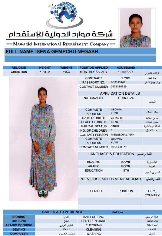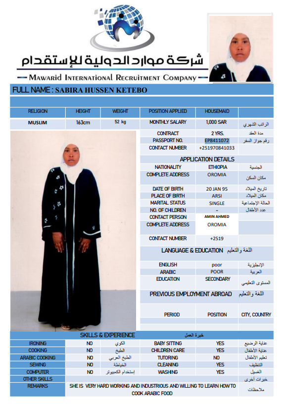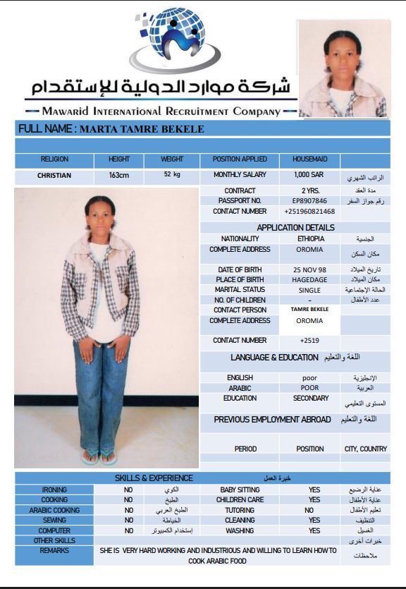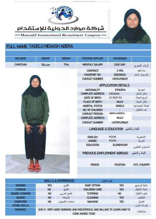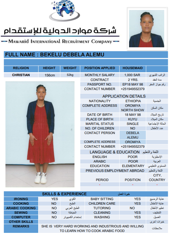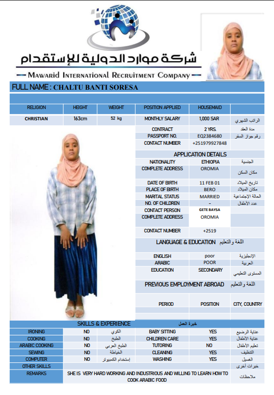 نوع الخدمة نوع الخدمة استقدام تأجير نقل خدمات الجنسية الجنسية الفلبين الهند اثيوبيا بروندي بنغلاديش أوغندا سريلانكا كينيا اندونيسيا غانا المهنة عاملة منزلية سائق خاص عاملة عناية الديانة مسلم غير مسلم الخبرة سبق العمل لم يسبق العمل بحث مسح mamo اثيوبيا العمر 22 الخبرة لم يسبق العمل الديانة غير مسلم رقم الملف eq2155166 حجز العاملة meskerem اثيوبيا العمر 28 الخبرة لم يسبق العمل الديانة غير مسلم رقم الملف ep6400219 حجز العاملة YEMATA SITOTE MAREW اثيوبيا العمر 26 الخبرة لم يسبق العمل الديانة غير مسلم رقم الملف EQ1788069 حجز العاملة السير الذاتية MARTA TAMRE BEKELE اثيوبيا العمر 27 الخبرة لم يسبق العمل الديانة غير مسلم رقم الملف EP8907846 حجز العاملة السير الذاتية CHALTU BANTI SORESA اثيوبيا العمر 24 الخبرة لم يسبق العمل الديانة غير مسلم رقم الملف EQ2384680 حجز العاملة السير الذاتية KETEBO SABIRA HUSSEN اثيوبيا العمر 30 الخبرة لم يسبق العمل الديانة مسلم رقم الملف EP8411072 حجز العاملة السير الذاتية SENA GEMECHU NEGASH اثيوبيا العمر 23 الخبرة لم يسبق العمل الديانة غير مسلم رقم الملف EQ2323267 حجز العاملة السير الذاتية TADELU NEGASH ABERA اثيوبيا العمر 24 الخبرة لم يسبق العمل الديانة غير مسلم رقم الملف EQ1558122 حجز العاملة السير الذاتية BILISE MUHAMMED ILMI اثيوبيا العمر 26 الخبرة لم يسبق العمل الديانة غير مسلم رقم الملف EP9143943 حجز العاملة السير الذاتية BEKELU DEBELA ALEMU اثيوبيا العمر 27 الخبرة لم يسبق العمل الديانة غير مسلم رقم الملف EP8034638 حجز العاملة السير الذاتية 1 2 3 4