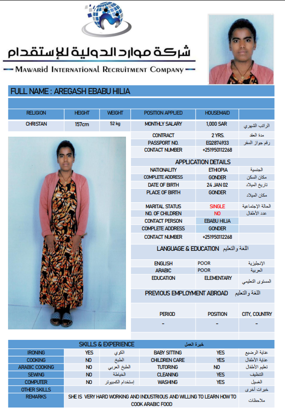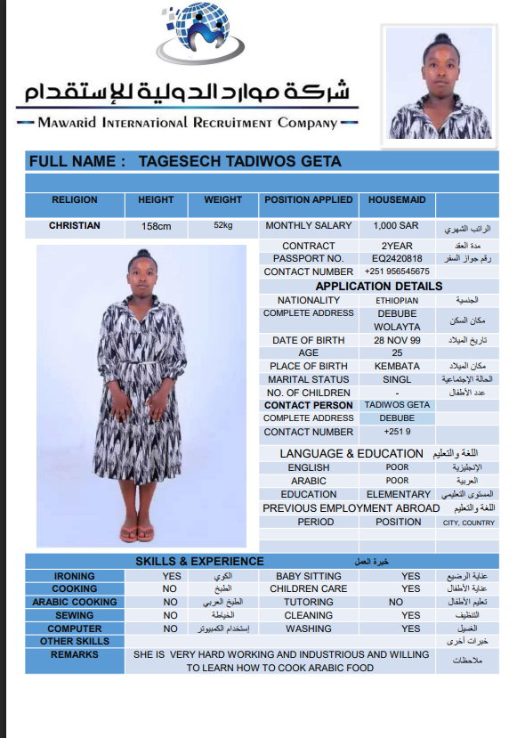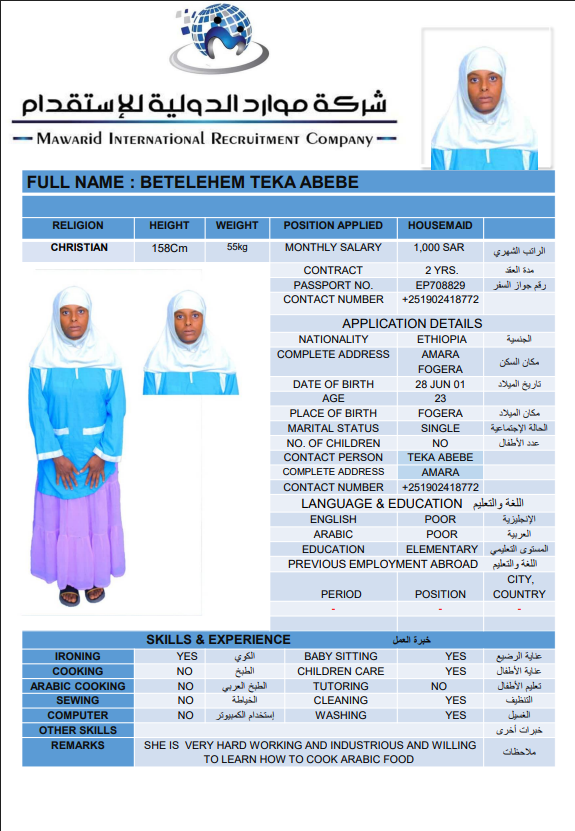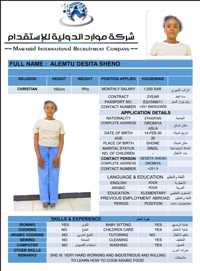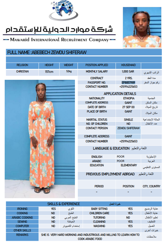 نوع الخدمة نوع الخدمة استقدام تأجير نقل خدمات الجنسية الجنسية الفلبين الهند اثيوبيا بروندي بنغلاديش أوغندا سريلانكا كينيا اندونيسيا غانا المهنة عاملة منزلية سائق خاص عاملة عناية ممرضة منزلية الديانة مسلم غير مسلم الخبرة سبق العمل لم يسبق العمل بحث مسح ALIMAZ SINILEW MEKONEN اثيوبيا العمر 28 الخبرة لم يسبق العمل الديانة غير مسلم رقم الملف EQ1752918 حجز العاملة السير الذاتية FENTAHUN FIREHIWOT KEBEDE اثيوبيا العمر 35 الخبرة سبق العمل الديانة غير مسلم رقم الملف EP8823106 حجز العاملة SHEBERE GIZACHEW MAMO اثيوبيا العمر 23 الخبرة لم يسبق العمل الديانة غير مسلم رقم الملف 2155166EQ حجز العاملة BETELEHEM TEKA ABEBE اثيوبيا العمر 25 الخبرة لم يسبق العمل الديانة غير مسلم رقم الملف 708829EP حجز العاملة AREGASH EBABU HILIA اثيوبيا العمر 24 الخبرة لم يسبق العمل الديانة غير مسلم رقم الملف 2874933EQ حجز العاملة ABEBECH ZEWDU SHIFERAW اثيوبيا العمر 26 الخبرة لم يسبق العمل الديانة غير مسلم رقم الملف 8857989EP حجز العاملة ALEMTU DESITA SHENO اثيوبيا العمر 26 الخبرة لم يسبق العمل الديانة غير مسلم رقم الملف 1549011EQ حجز العاملة TAGESECH TADIWOS GETA اثيوبيا العمر 26 الخبرة لم يسبق العمل الديانة غير مسلم رقم الملف 2420818EQ حجز العاملة CHALTU DIRIBA FEYISA اثيوبيا العمر 24 الخبرة لم يسبق العمل الديانة غير مسلم رقم الملف EQ1666926 حجز العاملة WORKINESH TESEMA YADECHA اثيوبيا العمر 25 الخبرة لم يسبق العمل الديانة غير مسلم رقم الملف EP6903442 حجز العاملة 1 2 3 4 5