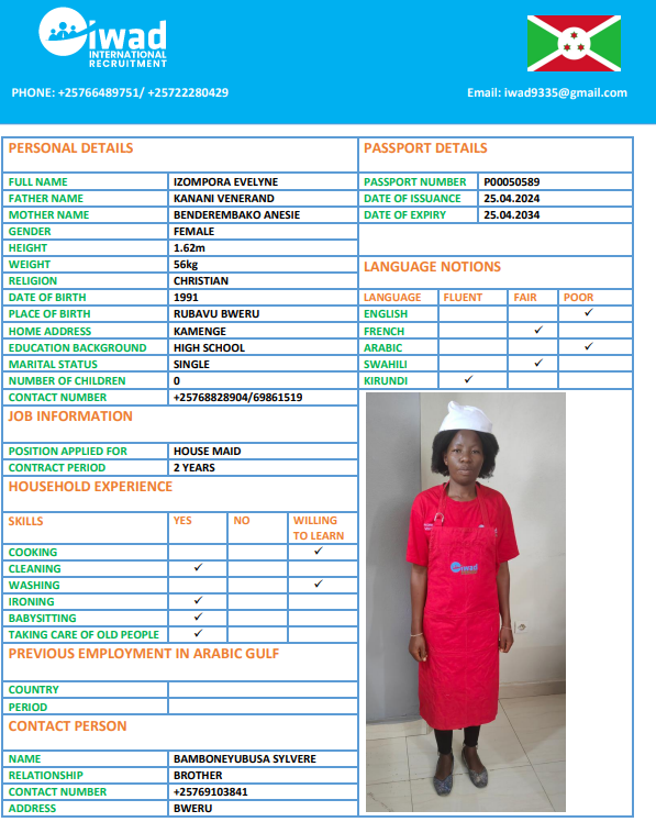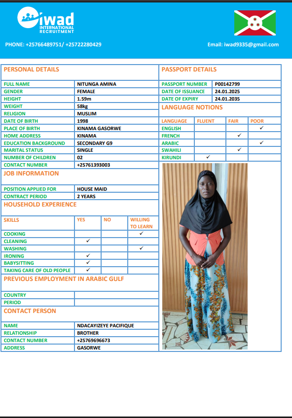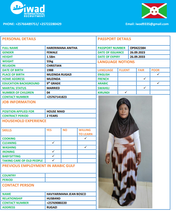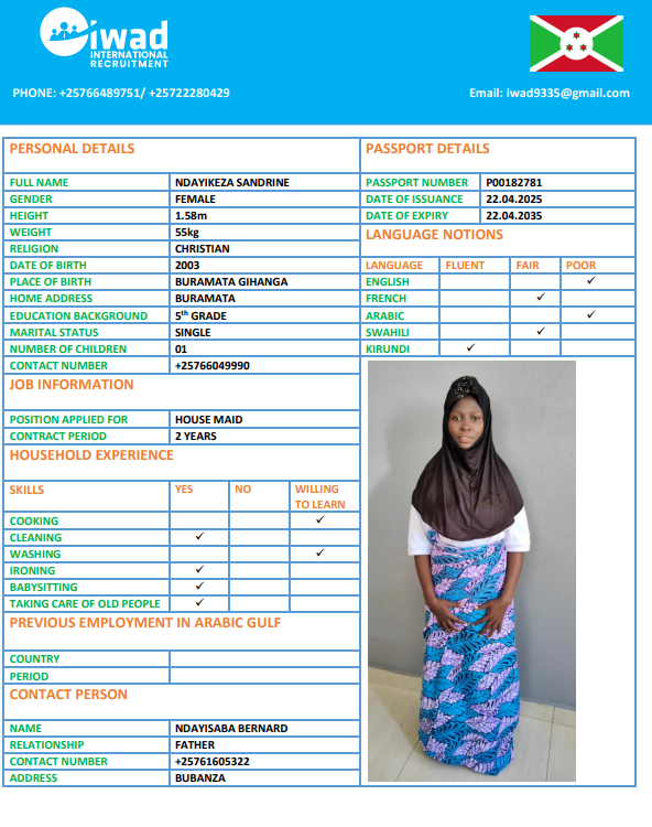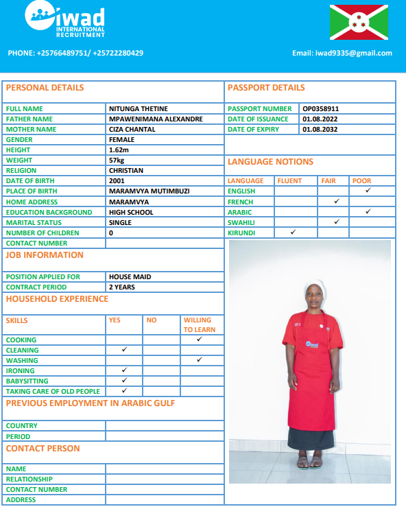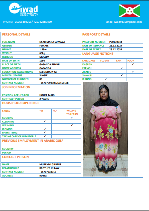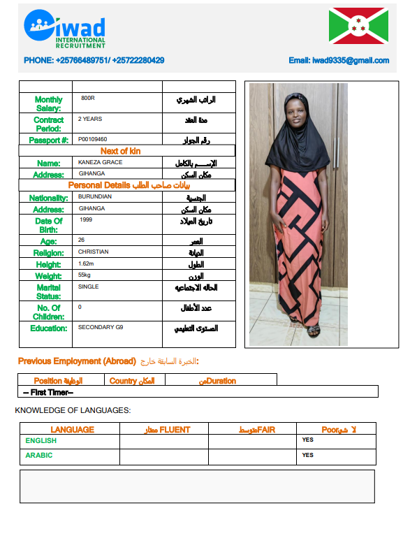 نوع الخدمة نوع الخدمة استقدام تأجير نقل خدمات الجنسية الجنسية الفلبين الهند اثيوبيا بروندي بنغلاديش أوغندا سريلانكا كينيا اندونيسيا غانا المهنة عاملة منزلية سائق خاص عاملة عناية الديانة مسلم غير مسلم الخبرة سبق العمل لم يسبق العمل بحث مسح NSABIMANA SUMAYA بروندي العمر 26 الخبرة لم يسبق العمل الديانة مسلم رقم الملف P00130344 حجز العاملة السير الذاتية NIYONKURU ASHURA بروندي العمر 29 الخبرة لم يسبق العمل الديانة مسلم رقم الملف P00113384 حجز العاملة السير الذاتية NITUNGA AMINA بروندي العمر 27 الخبرة لم يسبق العمل الديانة مسلم رقم الملف P00142799 حجز العاملة السير الذاتية HARERIMANA ANITHA بروندي العمر 37 الخبرة لم يسبق العمل الديانة غير مسلم رقم الملف OP0422384 حجز العاملة السير الذاتية NITUNGA THETINE بروندي العمر 24 الخبرة لم يسبق العمل الديانة غير مسلم رقم الملف OP0358911 حجز العاملة السير الذاتية NDAYIKEZA SANDRINE بروندي العمر 22 الخبرة لم يسبق العمل الديانة غير مسلم رقم الملف P00182781 حجز العاملة السير الذاتية NDAYIRAGIJE JEANINE بروندي العمر 31 الخبرة لم يسبق العمل الديانة مسلم رقم الملف P00223135 حجز العاملة السير الذاتية IZOMPORA EVELYNE بروندي العمر 34 الخبرة لم يسبق العمل الديانة غير مسلم رقم الملف P00050589 حجز العاملة السير الذاتية KANEZA GRACE بروندي العمر 26 الخبرة لم يسبق العمل الديانة غير مسلم رقم الملف P00109460 حجز العاملة السير الذاتية Ancille بروندي العمر 35 الخبرة لم يسبق العمل الديانة غير مسلم رقم الملف 131 حجز العاملة 1 2