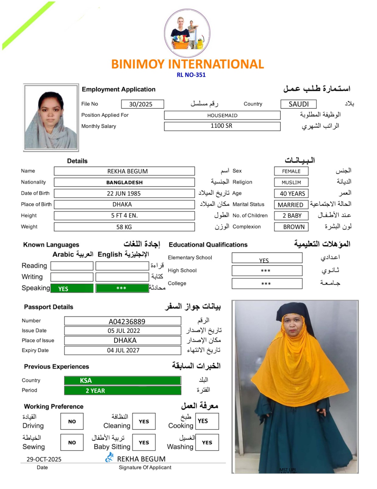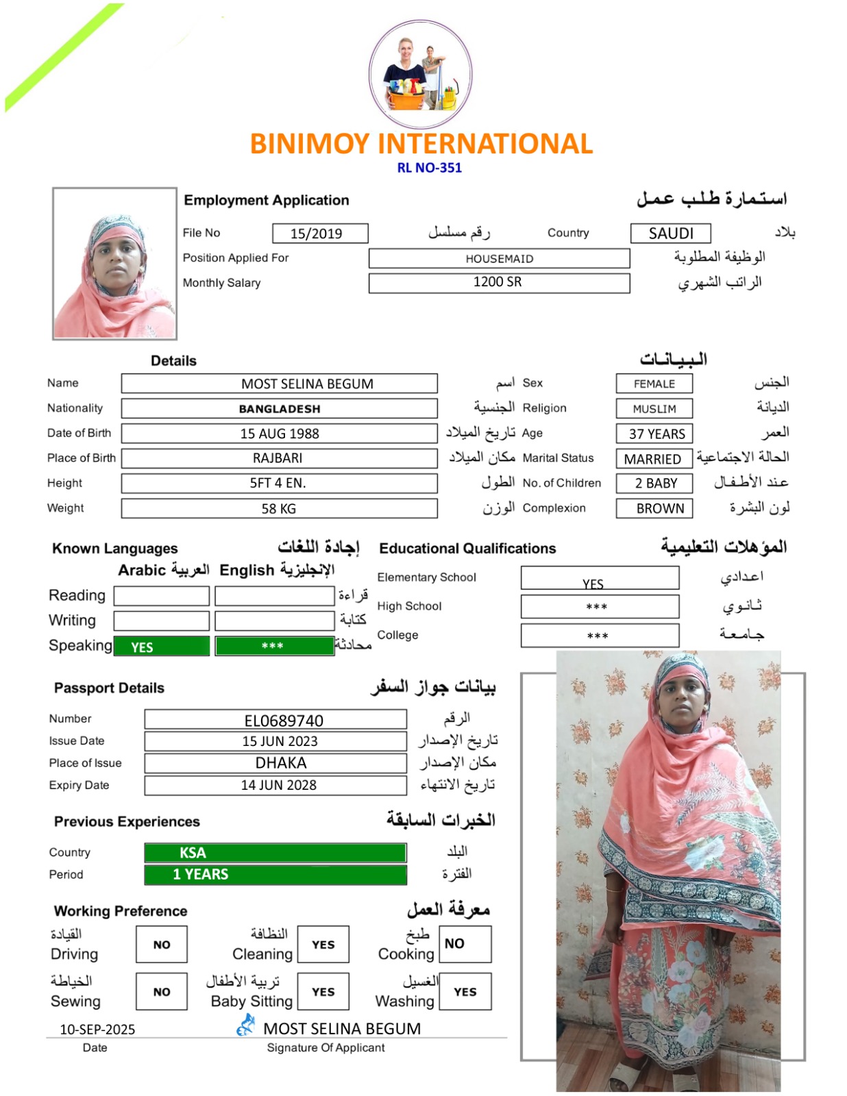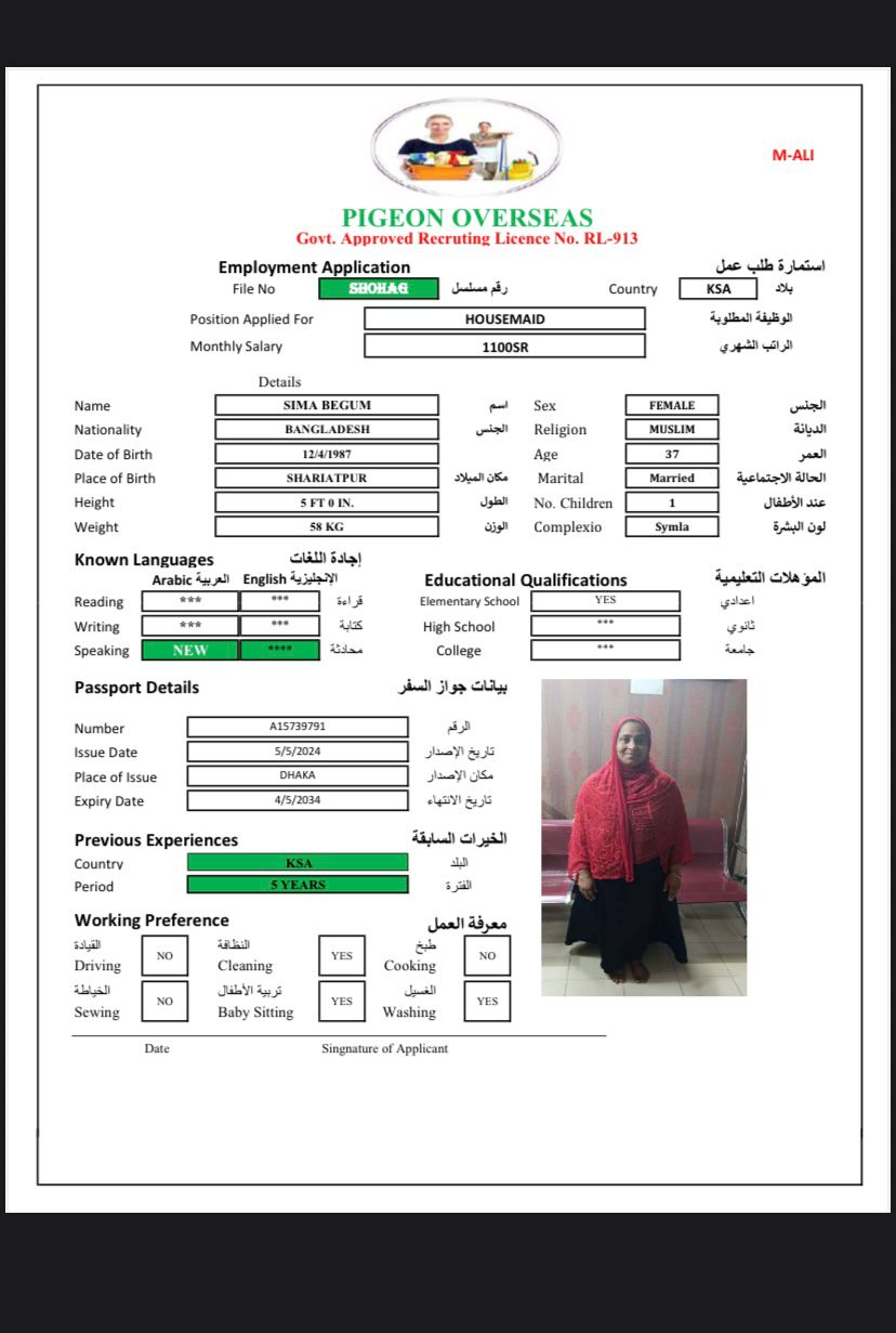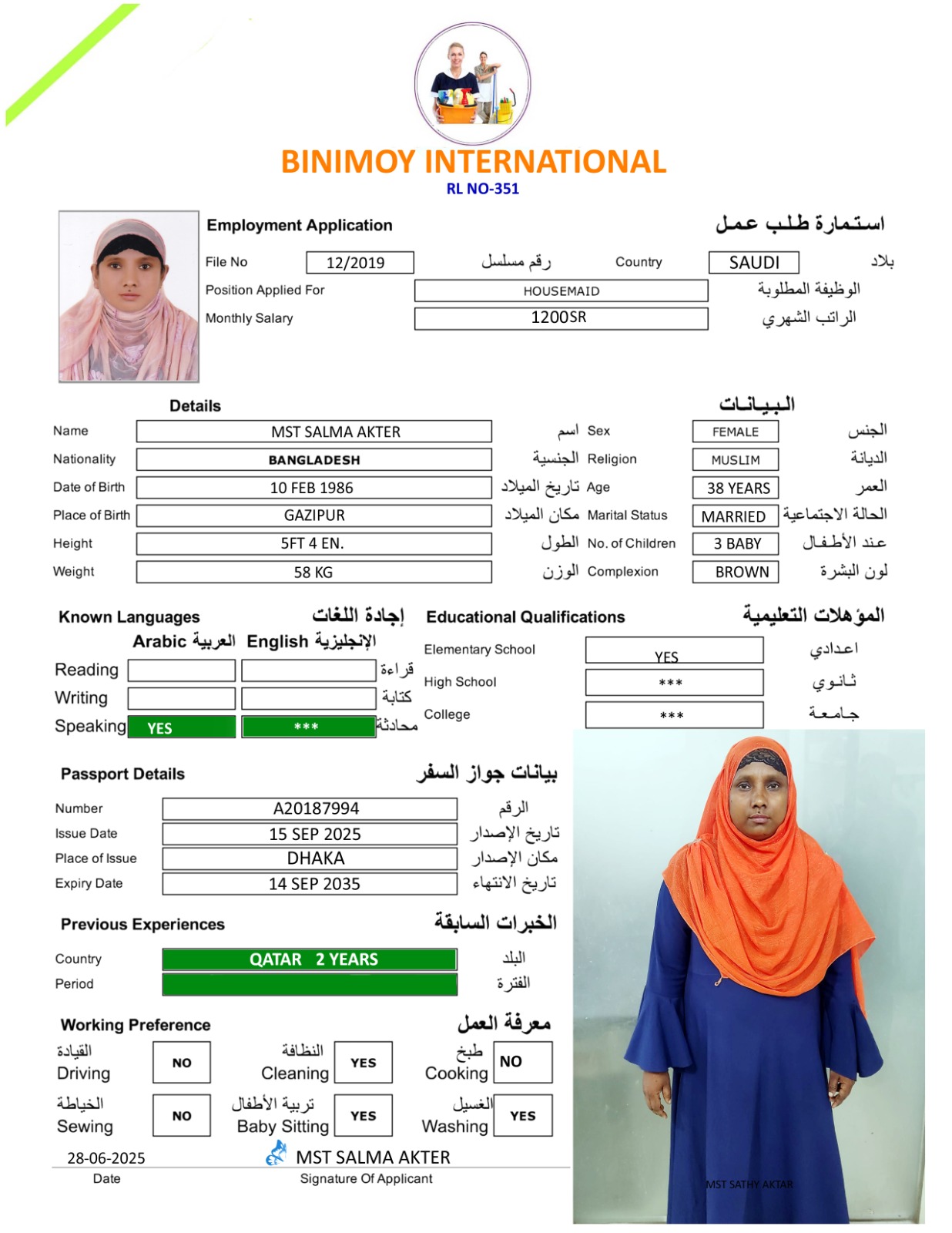 نوع الخدمة نوع الخدمة استقدام تأجير نقل خدمات الجنسية الجنسية الفلبين الهند اثيوبيا بروندي بنغلاديش أوغندا سريلانكا كينيا اندونيسيا غانا المهنة عاملة منزلية سائق خاص عاملة عناية الديانة مسلم غير مسلم الخبرة سبق العمل لم يسبق العمل بحث مسح PARVIN بنغلاديش العمر 38 الخبرة لم يسبق العمل الديانة مسلم رقم الملف A17423027 حجز العاملة SELINA بنغلاديش العمر 37 الخبرة سبق العمل الديانة مسلم رقم الملف EJ0689740 حجز العاملة SALMA بنغلاديش العمر 38 الخبرة سبق العمل الديانة غير مسلم رقم الملف A20187994 حجز العاملة REKHA BEGUM بنغلاديش العمر 40 الخبرة سبق العمل الديانة مسلم رقم الملف A04236889 حجز العاملة AMIRUL بنغلاديش العمر 34 الخبرة سبق العمل الديانة مسلم رقم الملف A15829913 حجز العاملة MST JAHIRUN بنغلاديش العمر 38 الخبرة سبق العمل الديانة مسلم رقم الملف A15561138 حجز العاملة SIMA BEGUM بنغلاديش العمر 37 الخبرة سبق العمل الديانة مسلم رقم الملف A157397910 حجز العاملة