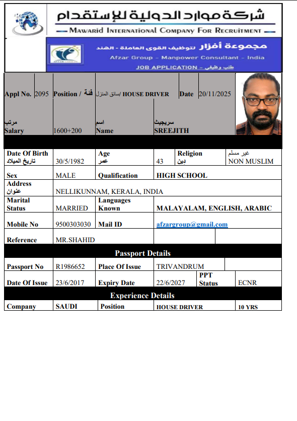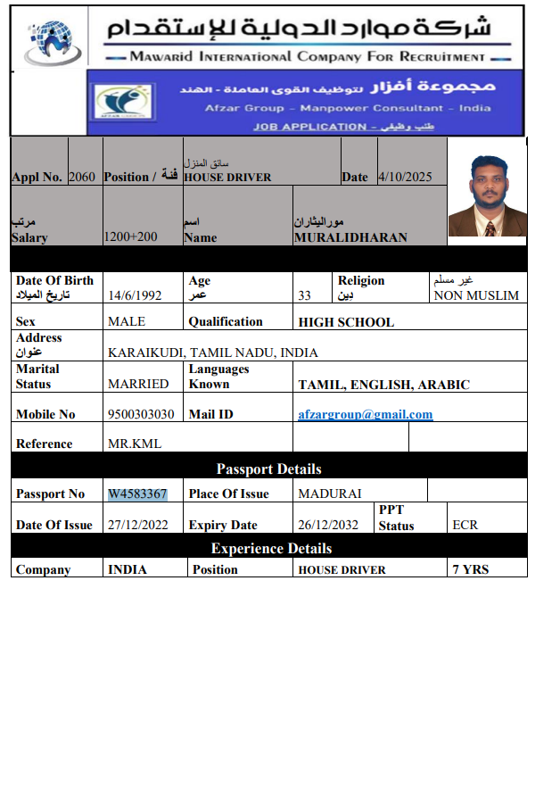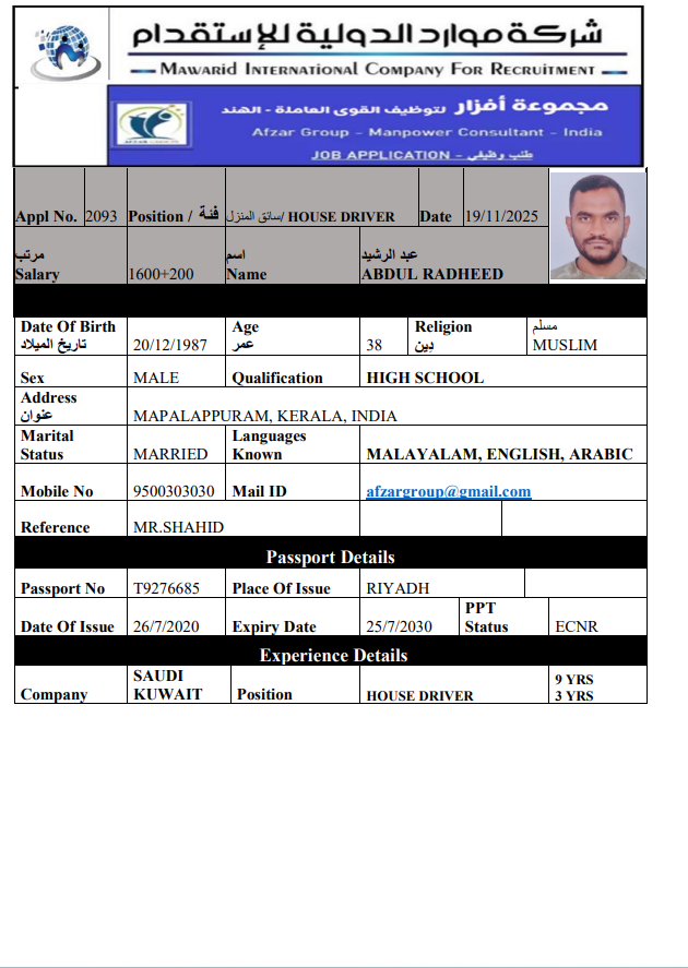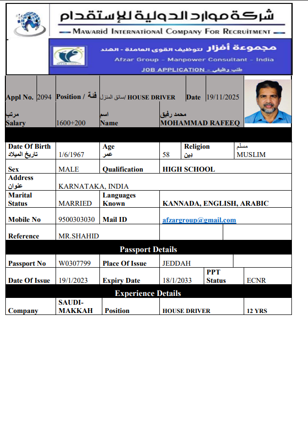 نوع الخدمة نوع الخدمة استقدام تأجير نقل خدمات الجنسية الجنسية الفلبين الهند اثيوبيا بروندي بنغلاديش أوغندا سريلانكا كينيا اندونيسيا غانا المهنة عاملة منزلية سائق خاص عاملة عناية الديانة مسلم غير مسلم الخبرة سبق العمل لم يسبق العمل بحث مسح KANAKAMMA SUBRANIYAN ACHARI SREEJITH الهند العمر 43 الخبرة سبق العمل الديانة غير مسلم رقم الملف R1986652 حجز العاملة السير الذاتية MOHAN MURALIDHARAN الهند العمر 33 الخبرة لم يسبق العمل الديانة غير مسلم رقم الملف W4583367 حجز العاملة السير الذاتية ANA KKACHERI ABDUL RASHEED الهند العمر 38 الخبرة سبق العمل الديانة مسلم رقم الملف T9276685 حجز العاملة السير الذاتية ABBAS BEARY MOHAMMAD RAFEEQ الهند العمر 58 الخبرة سبق العمل الديانة غير مسلم رقم الملف W0307799 حجز العاملة السير الذاتية LOUIE JAY GUZMAN ORACION الفلبين العمر 37 الخبرة لم يسبق العمل الديانة غير مسلم رقم الملف P8629285C حجز العاملة السير الذاتية MARK DOLAND SY- GACO APIT الفلبين العمر 27 الخبرة لم يسبق العمل الديانة غير مسلم رقم الملف P8809028C حجز العاملة السير الذاتية هعغمفلخهعمنز الفلبين العمر 44 الخبرة لم يسبق العمل الديانة غير مسلم رقم الملف صضثقل حجز العاملة