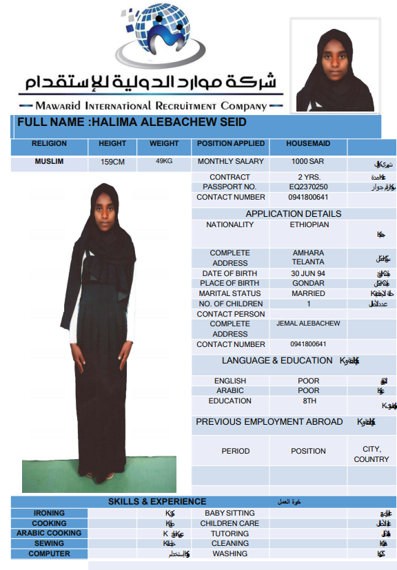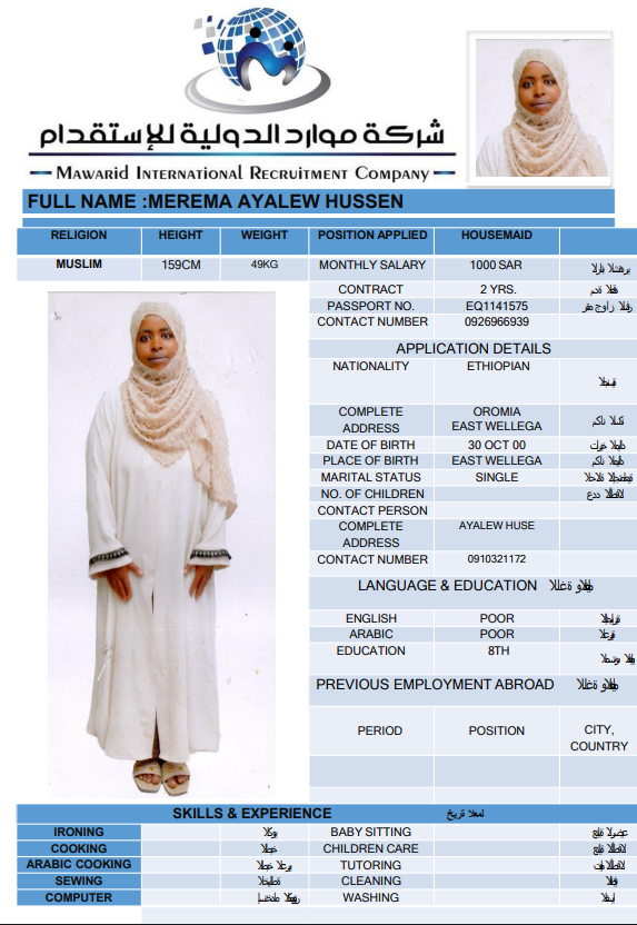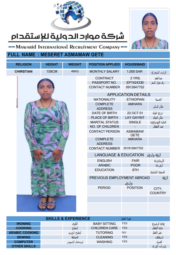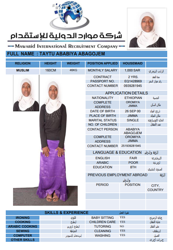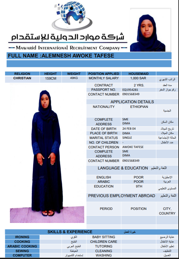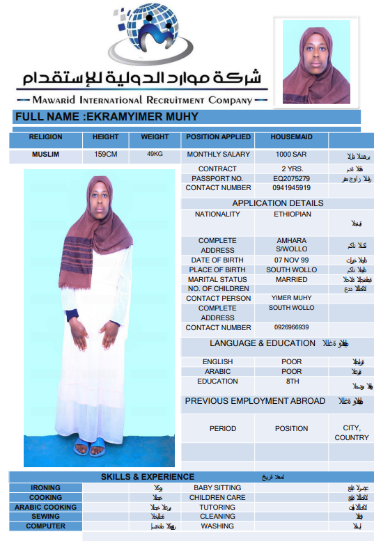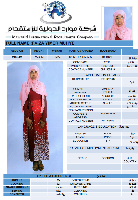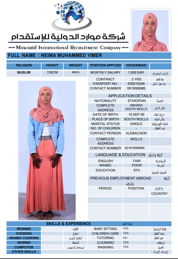 نوع الخدمة نوع الخدمة استقدام تأجير نقل خدمات الجنسية الجنسية الفلبين الهند اثيوبيا بروندي بنغلاديش أوغندا سريلانكا كينيا اندونيسيا غانا المهنة عاملة منزلية سائق خاص عاملة عناية ممرضة منزلية الديانة مسلم غير مسلم الخبرة سبق العمل لم يسبق العمل بحث مسح ALEMNESH AWOKE TAFESE اثيوبيا العمر 22 الخبرة لم يسبق العمل الديانة غير مسلم رقم الملف EQ1954281 حجز العاملة TAYTU ABABIYA ABAGOJEM اثيوبيا العمر 26 الخبرة لم يسبق العمل الديانة مسلم رقم الملف EQ1428969 حجز العاملة ZINASH ABERA JIMA اثيوبيا العمر 25 الخبرة لم يسبق العمل الديانة غير مسلم رقم الملف EQ1012815 حجز العاملة MESERET ASMAMAW GETE اثيوبيا العمر 25 الخبرة لم يسبق العمل الديانة غير مسلم رقم الملف EP7424330 حجز العاملة NEIMA MUHAMMED YIMER اثيوبيا العمر 26 الخبرة لم يسبق العمل الديانة مسلم رقم الملف E00215346 حجز العاملة EKRAMYIMER MUHY اثيوبيا العمر 27 الخبرة لم يسبق العمل الديانة مسلم رقم الملف EQ2075279 حجز العاملة FAIZA YIMER MUHYE اثيوبيا العمر 23 الخبرة لم يسبق العمل الديانة مسلم رقم الملف E00215583 حجز العاملة HALIMA ALEBACHEW SEID اثيوبيا العمر 32 الخبرة لم يسبق العمل الديانة مسلم رقم الملف EQ2370250 حجز العاملة MEREMA AYALEW HUSSEN اثيوبيا العمر 26 الخبرة لم يسبق العمل الديانة مسلم رقم الملف EQ1141575 حجز العاملة HIKRAM JEMAL AHMED اثيوبيا العمر 25 الخبرة لم يسبق العمل الديانة مسلم رقم الملف EQ1697559 حجز العاملة 1 2 3 4