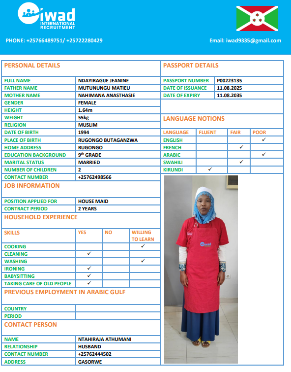 نوع الخدمة نوع الخدمة استقدام تأجير نقل خدمات الجنسية الجنسية الفلبين الهند اثيوبيا بروندي بنغلاديش أوغندا سريلانكا كينيا اندونيسيا غانا المهنة عاملة منزلية سائق خاص عاملة عناية الديانة مسلم غير مسلم الخبرة سبق العمل لم يسبق العمل بحث مسح LOUIE JAY GUZMAN ORACION الفلبين العمر 37 الخبرة لم يسبق العمل الديانة غير مسلم رقم الملف P8629285C حجز العاملة السير الذاتية KANAPATHIPILLAI SINNATHAMBY سريلانكا العمر 49 الخبرة سبق العمل الديانة غير مسلم رقم الملف N11212753 حجز العاملة السير الذاتية MARK DOLAND SY- GACO APIT الفلبين العمر 27 الخبرة لم يسبق العمل الديانة غير مسلم رقم الملف P8809028C حجز العاملة السير الذاتية Couples الفلبين العمر 49 الخبرة سبق العمل الديانة مسلم رقم الملف Couples حجز العاملة M Z SITTHY SANEERA سريلانكا العمر 57 الخبرة سبق العمل الديانة مسلم رقم الملف N9728614 حجز العاملة السير الذاتية GRACE MBONE OTIENO كينيا العمر 36 الخبرة سبق العمل الديانة غير مسلم رقم الملف BK169390 حجز العاملة السير الذاتية HARERIMANA ANITHA بروندي العمر 37 الخبرة لم يسبق العمل الديانة غير مسلم رقم الملف OP0422384 حجز العاملة السير الذاتية NITUNGA THETINE بروندي العمر 24 الخبرة لم يسبق العمل الديانة غير مسلم رقم الملف OP0358911 حجز العاملة السير الذاتية NDAYIKEZA SANDRINE بروندي العمر 22 الخبرة لم يسبق العمل الديانة غير مسلم رقم الملف P00182781 حجز العاملة السير الذاتية NDAYIRAGIJE JEANINE بروندي العمر 31 الخبرة لم يسبق العمل الديانة مسلم رقم الملف P00223135 حجز العاملة السير الذاتية 6 7 8 9 10 11 12