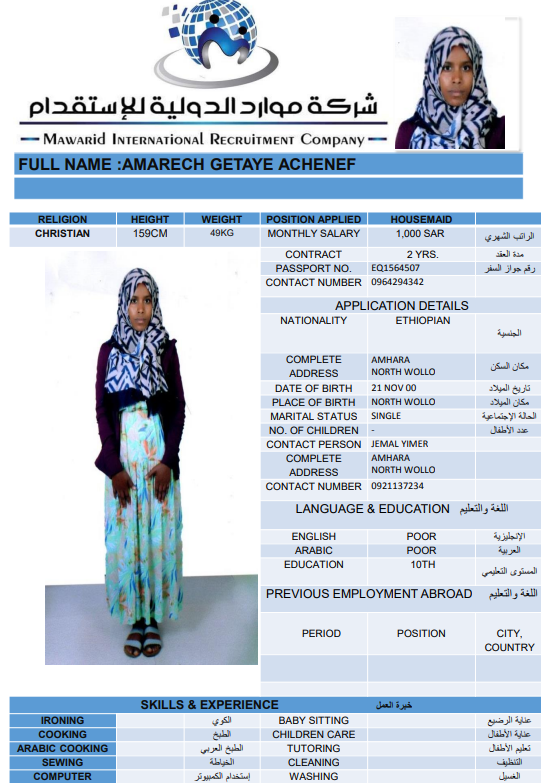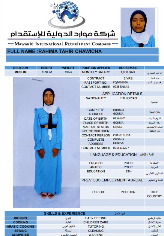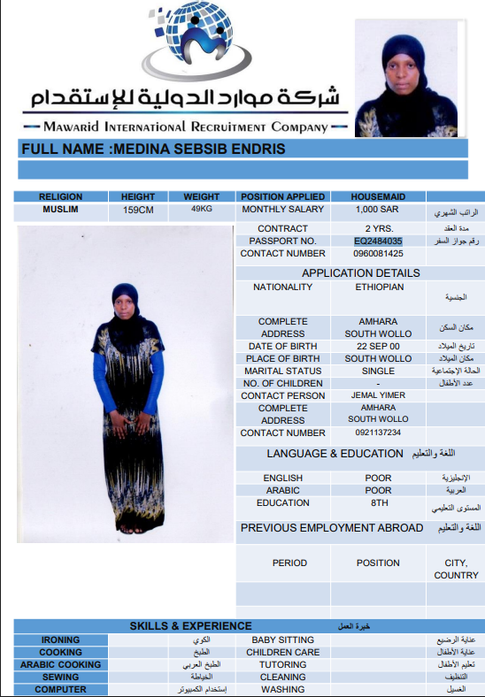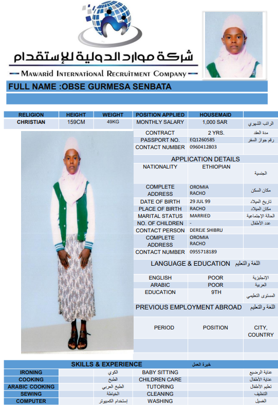 Service Type Service Type Recruitment Rent Transfer Services Nationality Nationality Philippines India Ethiopia Burundi Bangladesh Uganda Sri Lanka KENIA Indonesia Ghana Career Housemaid Family driver Care worker Religion Muslim Non-Muslim Choose Experience Previous Work Never Worked Search Clear ELIZA KADZO KAZUNGU KENIA Age 31 Experince Never Worked Relegion Non-Muslim File Number BK148512 Reserve the worker CV IMMAM SHAIF AISHA UMMA Sri Lanka Age 51 Experince Previous Work Relegion Muslim File Number N11369051 Reserve the worker CV OBSE GURMESA SENBATA Ethiopia Age 25 Experince Never Worked Relegion Non-Muslim File Number EQ1260585 Reserve the worker CV RAHIMA TAHIR CHAWICHA Age 22 Experince Never Worked Relegion Muslim File Number EQ2056066 Reserve the worker CV WERKI INASU TADESSE Ethiopia Age 25 Experince Never Worked Relegion Non-Muslim File Number EP8410228 Reserve the worker CV WERKNESH MULATU GAWO Ethiopia Age 25 Experince Never Worked Relegion Non-Muslim File Number EQ2791131 Reserve the worker CV MEDINA SEBSIB ENDRIS Ethiopia Age 24 Experince Never Worked Relegion Muslim File Number EQ2484035 Reserve the worker CV AMARECH GETAYE ACHENEF Ethiopia Age 24 Experince Never Worked Relegion Non-Muslim File Number EQ1564507 Reserve the worker CV هعغمفلخهعمنز Philippines Age 44 Experince Never Worked Relegion Non-Muslim File Number صضثقل Reserve the worker . Age . Experince Previous Work Relegion Non-Muslim File Number .. Reserve the worker 8 9 10 11 12