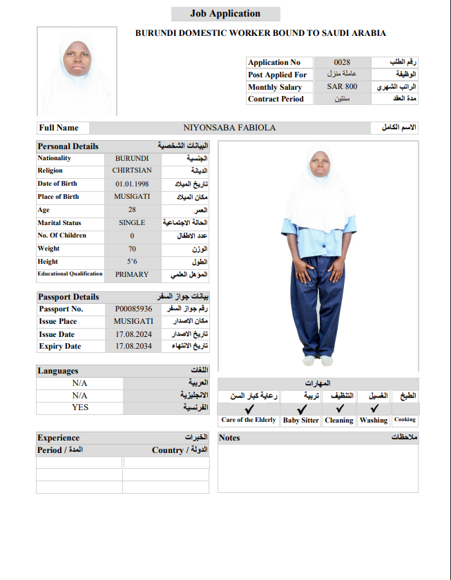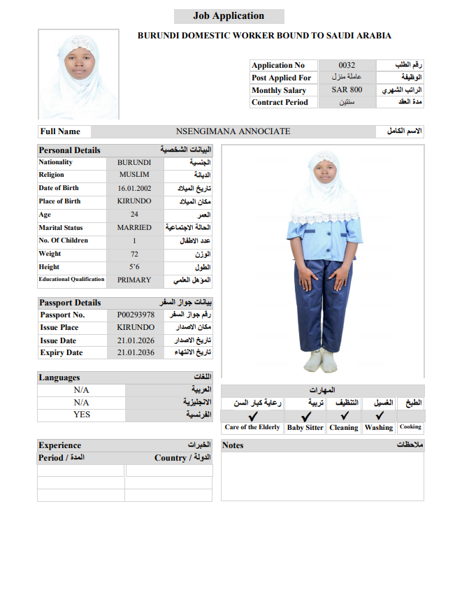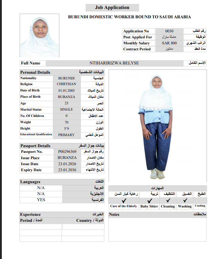 نوع الخدمة نوع الخدمة استقدام تأجير نقل خدمات الجنسية الجنسية الفلبين الهند اثيوبيا بروندي بنغلاديش أوغندا سريلانكا كينيا اندونيسيا غانا المهنة عاملة منزلية سائق خاص عاملة عناية ممرضة منزلية الديانة مسلم غير مسلم الخبرة سبق العمل لم يسبق العمل بحث مسح NIYONSABA FABIOLA CV بروندي العمر 28 الخبرة لم يسبق العمل الديانة غير مسلم رقم الملف P00085936 حجز العاملة السير الذاتية NTIHARIRIZWA BELYSE CV بروندي العمر 23 الخبرة لم يسبق العمل الديانة غير مسلم رقم الملف P00296369 حجز العاملة السير الذاتية NSENGIMANA ANNOCIATE CV بروندي العمر 24 الخبرة لم يسبق العمل الديانة مسلم رقم الملف P00293978 حجز العاملة السير الذاتية NIYODUSENGA MIREILLE بروندي العمر 22 الخبرة لم يسبق العمل الديانة غير مسلم رقم الملف P00186096 حجز العاملة السير الذاتية M R SITHY SAVURBEGAM سريلانكا العمر 41 الخبرة سبق العمل الديانة مسلم رقم الملف P0150679 حجز العاملة anyera أوغندا العمر 47 الخبرة لم يسبق العمل الديانة غير مسلم رقم الملف b00706534 حجز العاملة mbambu أوغندا العمر 42 الخبرة لم يسبق العمل الديانة غير مسلم رقم الملف b00801817 حجز العاملة musenero أوغندا العمر 36 الخبرة لم يسبق العمل الديانة غير مسلم رقم الملف a00232107 حجز العاملة karungi أوغندا العمر 23 الخبرة لم يسبق العمل الديانة غير مسلم رقم الملف b00807306 حجز العاملة achola أوغندا العمر 30 الخبرة لم يسبق العمل الديانة غير مسلم رقم الملف b00807357 حجز العاملة 1 2 3 4 5 6 7