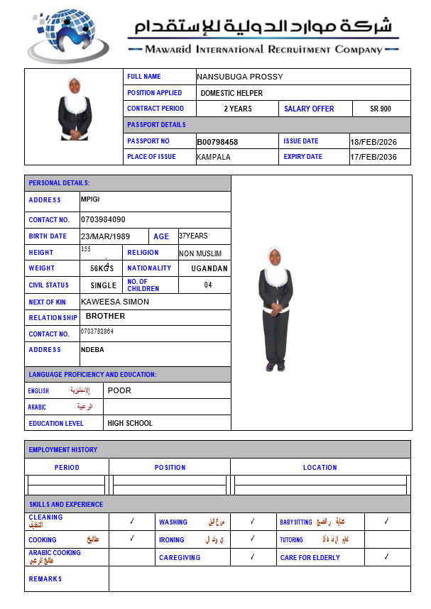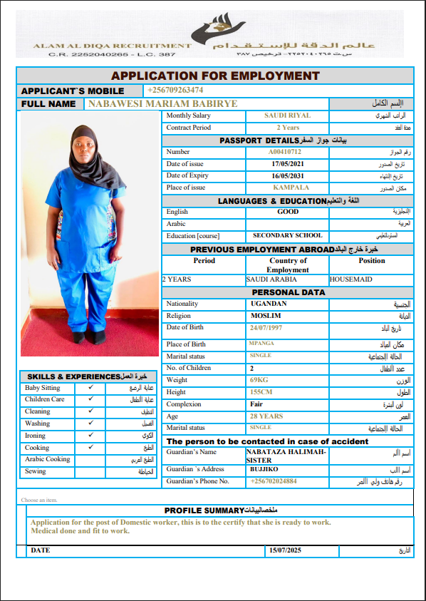 نوع الخدمة نوع الخدمة استقدام تأجير نقل خدمات الجنسية الجنسية الفلبين الهند اثيوبيا بروندي بنغلاديش أوغندا سريلانكا كينيا اندونيسيا غانا المهنة عاملة منزلية سائق خاص عاملة عناية ممرضة منزلية الديانة مسلم غير مسلم الخبرة سبق العمل لم يسبق العمل بحث مسح mwenyango أوغندا العمر 29 الخبرة لم يسبق العمل الديانة غير مسلم رقم الملف b00803170 حجز العاملة kayongo أوغندا العمر 39 الخبرة لم يسبق العمل الديانة مسلم رقم الملف b00800275 حجز العاملة namaganda أوغندا العمر 22 الخبرة لم يسبق العمل الديانة مسلم رقم الملف b00816468 حجز العاملة nansubuga أوغندا العمر 37 الخبرة لم يسبق العمل الديانة غير مسلم رقم الملف b00798458 حجز العاملة domestic أوغندا العمر 36 الخبرة لم يسبق العمل الديانة غير مسلم رقم الملف b00814664 حجز العاملة nanziri أوغندا العمر 38 الخبرة سبق العمل الديانة غير مسلم رقم الملف b00428226 حجز العاملة BABIRYE GLORIA أوغندا العمر 26 الخبرة سبق العمل الديانة غير مسلم رقم الملف a00697154 حجز العاملة السير الذاتية mutiibwa viola أوغندا العمر 26 الخبرة سبق العمل الديانة غير مسلم رقم الملف a00697262 حجز العاملة السير الذاتية NABAWESI MARIAM BABIRYE أوغندا العمر 28 الخبرة لم يسبق العمل الديانة غير مسلم رقم الملف a00410712 حجز العاملة السير الذاتية NALUGO PAULINA أوغندا العمر 42 الخبرة لم يسبق العمل الديانة غير مسلم رقم الملف b00407734 حجز العاملة السير الذاتية 1 2 3 4 5 6 7 8