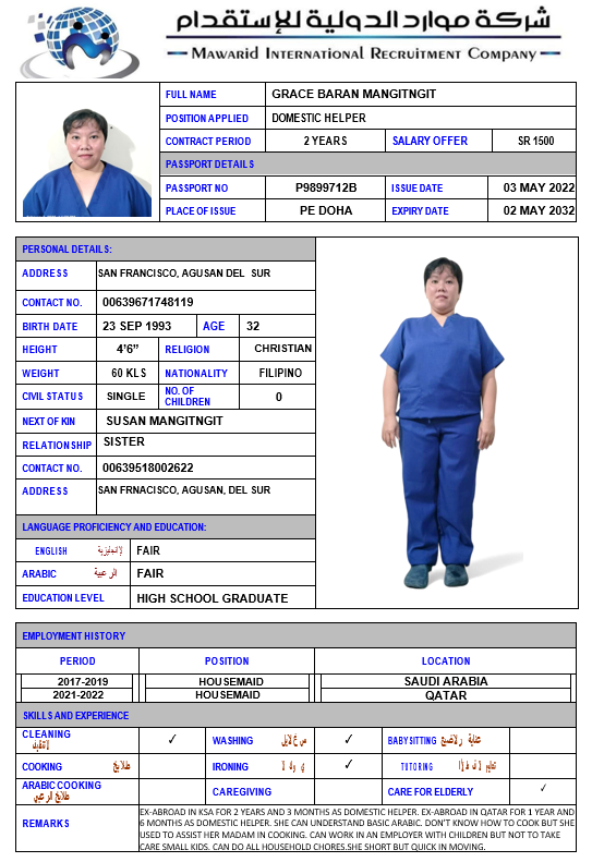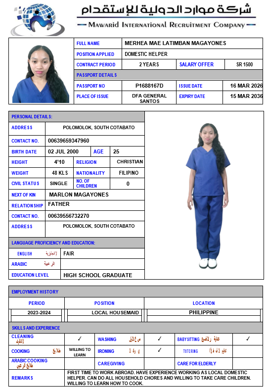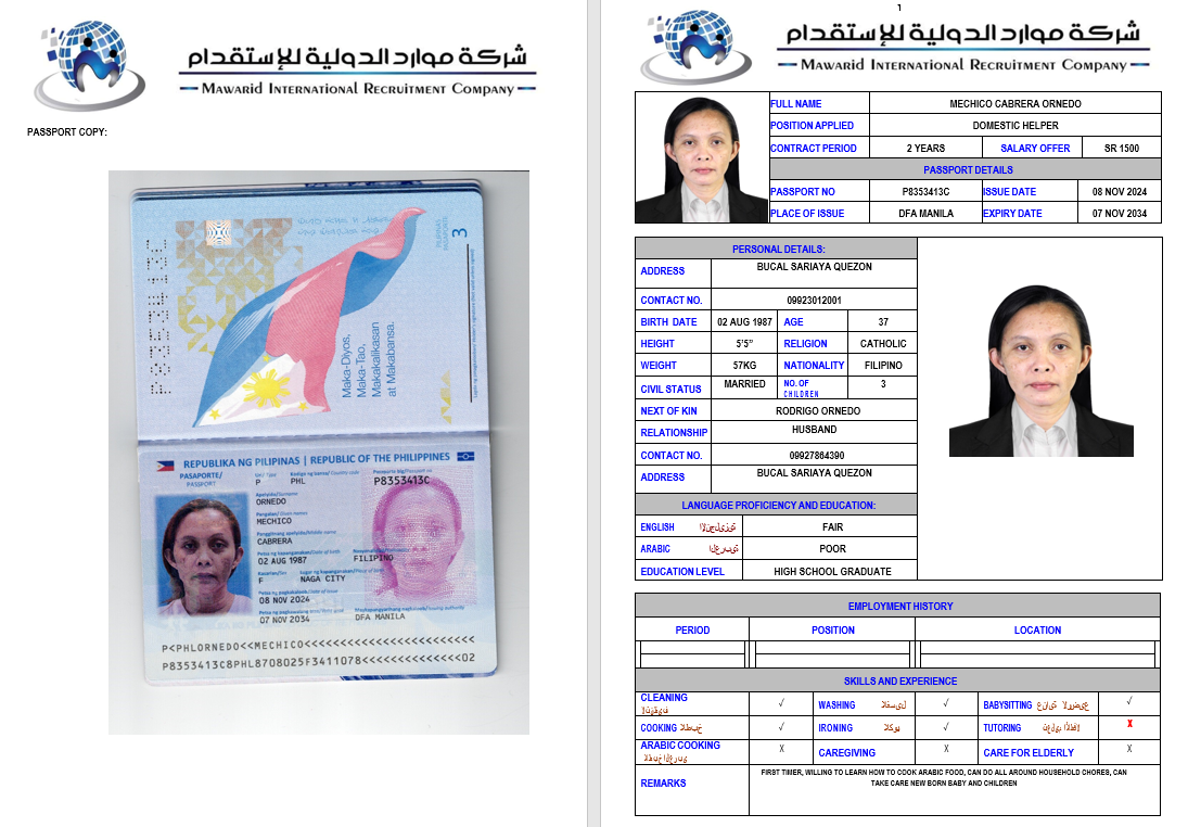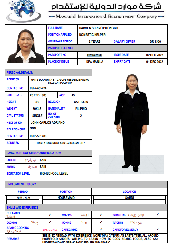 نوع الخدمة نوع الخدمة استقدام تأجير نقل خدمات الجنسية الجنسية الفلبين الهند اثيوبيا بروندي بنغلاديش أوغندا سريلانكا كينيا اندونيسيا غانا المهنة عاملة منزلية سائق خاص عاملة عناية ممرضة منزلية الديانة مسلم غير مسلم الخبرة سبق العمل لم يسبق العمل بحث مسح EWFDSA الفلبين العمر 52 الخبرة سبق العمل الديانة غير مسلم رقم الملف EWAFSD حجز العاملة DINA BEDONIA TAMASE الفلبين العمر 38 الخبرة سبق العمل الديانة غير مسلم رقم الملف P2580130B حجز العاملة قثلفسشثصض الفلبين العمر 33 الخبرة سبق العمل الديانة مسلم رقم الملف ازواج حجز العاملة السير الذاتية ميلاني الفلبين العمر 45 الخبرة سبق العمل الديانة غير مسلم رقم الملف سيببي حجز العاملة JACQUELINE SALAZAR NUÑEZ الفلبين العمر 47 الخبرة سبق العمل الديانة غير مسلم رقم الملف P541800C حجز العاملة GIRISH الفلبين العمر 30 الخبرة لم يسبق العمل الديانة غير مسلم رقم الملف UKH حجز العاملة FULL NAME MECHICO CABRERA ORNEDO الفلبين العمر 37 الخبرة لم يسبق العمل الديانة غير مسلم رقم الملف P8353413C حجز العاملة MERHEA MAE LATIMBAN MAGAYONES الفلبين العمر 25 الخبرة لم يسبق العمل الديانة غير مسلم رقم الملف P1688167D حجز العاملة CARMEN SORINO PILONGGO الفلبين العمر 45 الخبرة سبق العمل الديانة غير مسلم رقم الملف P2564716C حجز العاملة GRACE BARAN MANGITNGIT الفلبين العمر 32 الخبرة سبق العمل الديانة غير مسلم رقم الملف P9899712B حجز العاملة 1 2