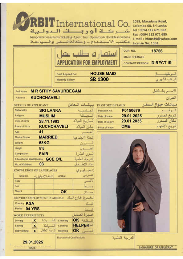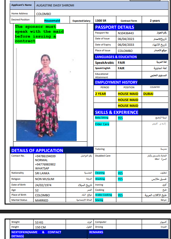 Service Type Service Type Recruitment Rent Transfer Services Nationality Nationality Philippines India Ethiopia Burundi Bangladesh Uganda Sri Lanka KENIA Indonesia Ghana Career Housemaid Family driver Care worker Home nurse Religion Muslim Non-Muslim Choose Experience Previous Work Never Worked Search Clear سيتي Sri Lanka Age 29 Experince Previous Work Relegion Muslim File Number شبسب Reserve the worker TENSIKE Sri Lanka Age 48 Experince Previous Work Relegion Non-Muslim File Number SDF Reserve the worker M R SITHY SAVURBEGAM Sri Lanka Age 41 Experince Previous Work Relegion Muslim File Number P0150679 Reserve the worker AUGASTINE DAISY SHIROMI Sri Lanka Age 52 Experince Previous Work Relegion Non-Muslim File Number N10436443 Reserve the worker MANAUTHUM MUDIYANSELAGE NILANTHIKA P Sri Lanka Age 44 Experince Previous Work Relegion Non-Muslim File Number N9172589 Reserve the worker KOLONGAHA WATTE GEDARA RANJANI PODIMAN Sri Lanka Age 55 Experince Previous Work Relegion Non-Muslim File Number P0689602 Reserve the worker DORERAJ JAYAMALA Sri Lanka Age 40 Experince Previous Work Relegion Non-Muslim File Number N11096290 Reserve the worker NISHANTHI Sri Lanka Age 40 Experince Previous Work Relegion Non-Muslim File Number N11135478 Reserve the worker EDIRISINGHE ARACHCHILLAGE SUBASINI EDIRISINGHE MENIKE Sri Lanka Age 50 Experince Previous Work Relegion Non-Muslim File Number P0794881 Reserve the worker CV SINNNAIYA ILLYATHAMBY JEYASITHTHI Sri Lanka Age 49 Experince Previous Work Relegion Non-Muslim File Number N9388990 Reserve the worker 1 2