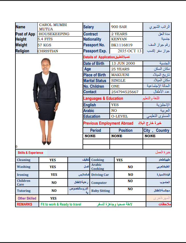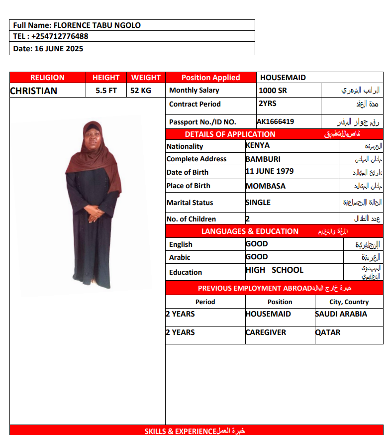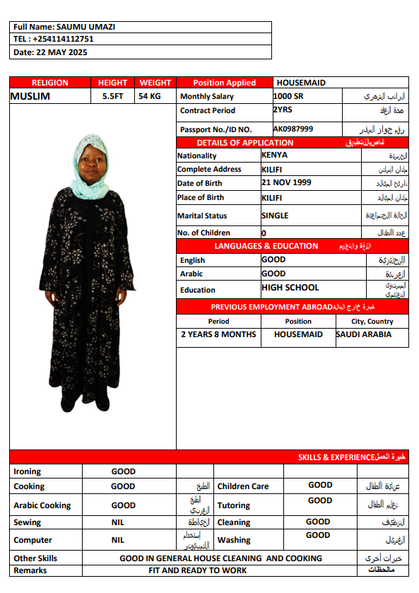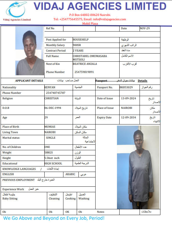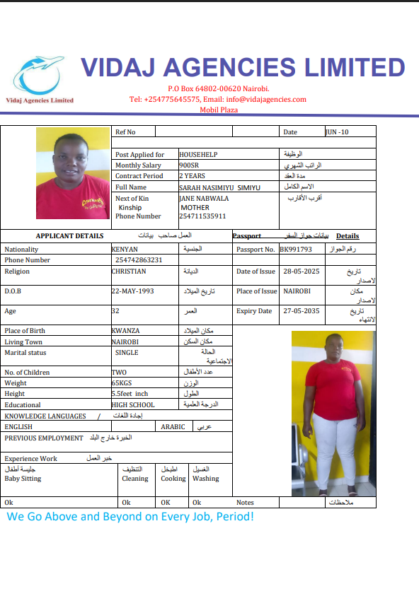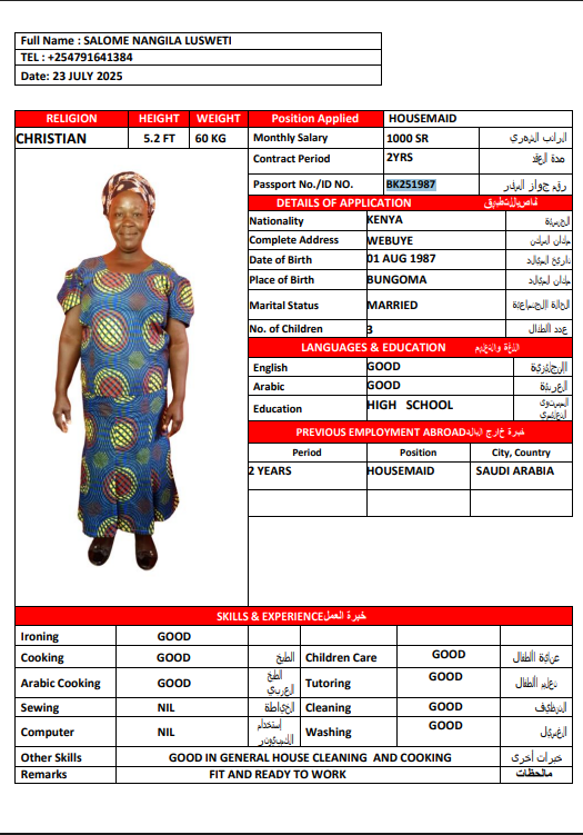 نوع الخدمة نوع الخدمة استقدام تأجير نقل خدمات الجنسية الجنسية الفلبين الهند اثيوبيا بروندي بنغلاديش أوغندا سريلانكا كينيا اندونيسيا غانا المهنة عاملة منزلية سائق خاص عاملة عناية الديانة مسلم غير مسلم الخبرة سبق العمل لم يسبق العمل بحث مسح UMAZI كينيا العمر 26 الخبرة سبق العمل الديانة مسلم رقم الملف AK0987999 حجز العاملة FATUMA كينيا العمر 26 الخبرة سبق العمل الديانة مسلم رقم الملف BK456948 حجز العاملة SAUMU كينيا العمر 26 الخبرة سبق العمل الديانة مسلم رقم الملف AK1307106 حجز العاملة EUNICE ATAMBA MUKARA كينيا العمر 36 الخبرة سبق العمل الديانة غير مسلم رقم الملف AK0999849 حجز العاملة السير الذاتية NGOLO FLORENCE TABU كينيا العمر 46 الخبرة سبق العمل الديانة غير مسلم رقم الملف AK1666419 حجز العاملة السير الذاتية LUSWETI SOLOME NANGILA كينيا العمر 38 الخبرة سبق العمل الديانة غير مسلم رقم الملف BK251987 حجز العاملة السير الذاتية MWANAKOMBO JUMA KIDATO كينيا العمر 38 الخبرة سبق العمل الديانة مسلم رقم الملف BK633344 حجز العاملة السير الذاتية CHRISTABEL OMUMASABA MUTSOLI كينيا العمر 29 الخبرة لم يسبق العمل الديانة غير مسلم رقم الملف BK8530290 حجز العاملة السير الذاتية SARAH NASIMIYU SIMIYU كينيا العمر 32 الخبرة لم يسبق العمل الديانة غير مسلم رقم الملف BK9917930 حجز العاملة السير الذاتية CAROL MUMBI MUTUA كينيا العمر 25 الخبرة لم يسبق العمل الديانة غير مسلم رقم الملف BK1116819 حجز العاملة السير الذاتية 1 2
