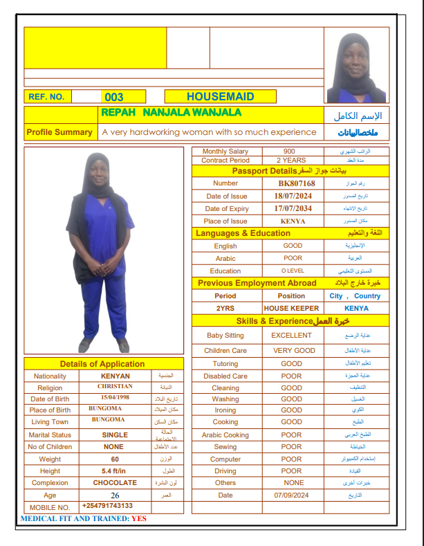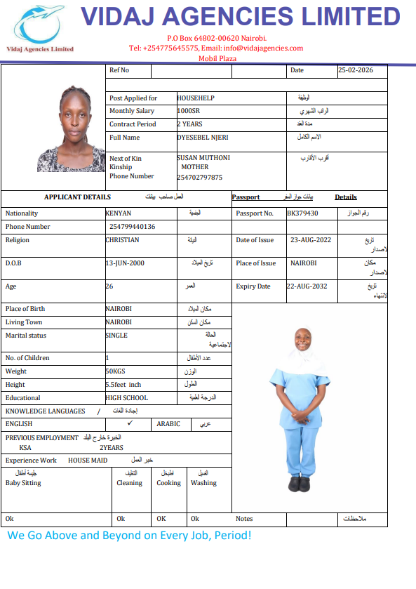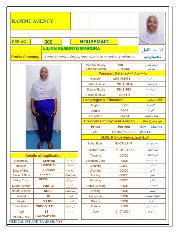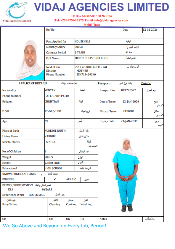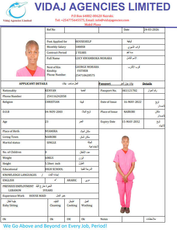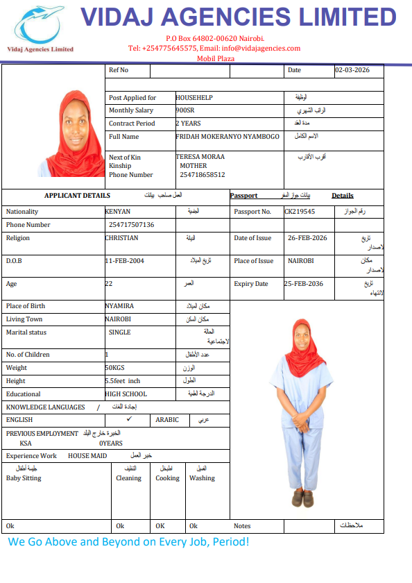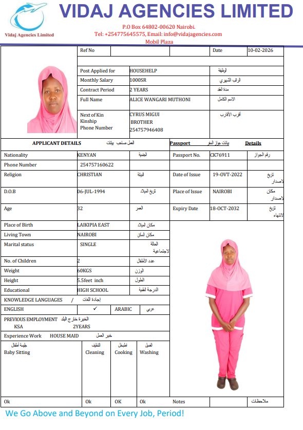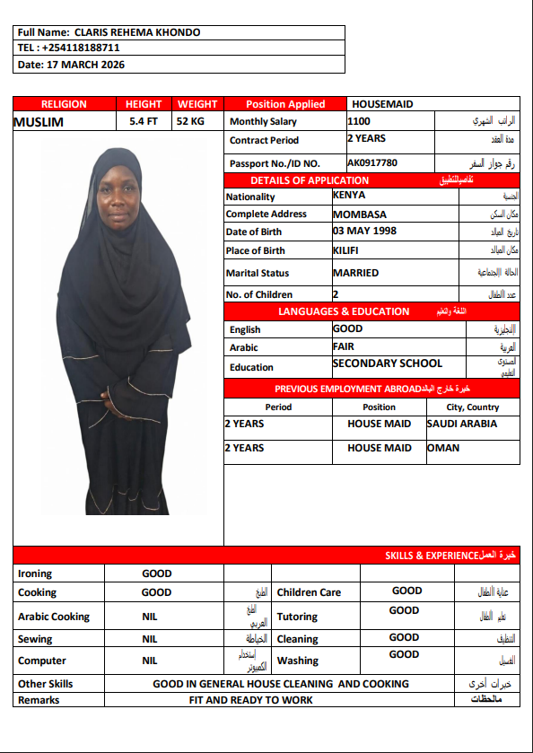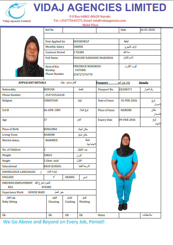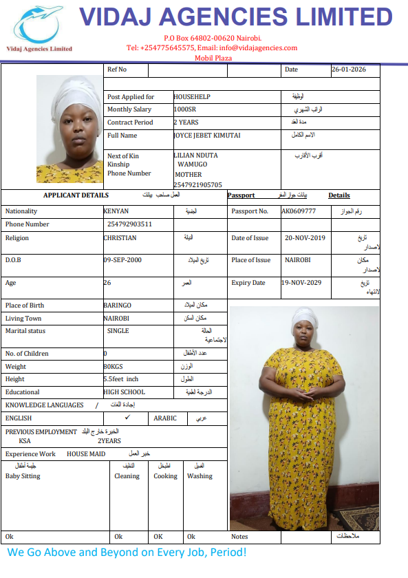 نوع الخدمة نوع الخدمة استقدام تأجير نقل خدمات الجنسية الجنسية الفلبين الهند اثيوبيا بروندي بنغلاديش أوغندا سريلانكا كينيا اندونيسيا غانا المهنة عاملة منزلية سائق خاص عاملة عناية ممرضة منزلية الديانة مسلم غير مسلم الخبرة سبق العمل لم يسبق العمل بحث مسح LILIAN KEMUNTO كينيا العمر 35 الخبرة لم يسبق العمل الديانة غير مسلم رقم الملف AK1682921 حجز العاملة السير الذاتية WANJALA REPAH NANJALA كينيا العمر 26 الخبرة لم يسبق العمل الديانة غير مسلم رقم الملف BK807168 حجز العاملة السير الذاتية KHONDO CLARIS REHEMA كينيا العمر 28 الخبرة سبق العمل الديانة مسلم رقم الملف AK0917780 حجز العاملة السير الذاتية MERCY CHEPKORIR KIRUI كينيا العمر 29 الخبرة لم يسبق العمل الديانة غير مسلم رقم الملف BK1220527 حجز العاملة السير الذاتية NJERI DYESEBEL كينيا العمر 26 الخبرة سبق العمل الديانة غير مسلم رقم الملف BK379430 حجز العاملة السير الذاتية MAKOKHA PAULINE NAKHANU كينيا العمر 37 الخبرة سبق العمل الديانة غير مسلم رقم الملف CK200371 حجز العاملة السير الذاتية KIMUTAI JOYCE JEBET كينيا العمر 26 الخبرة سبق العمل الديانة غير مسلم رقم الملف AK0609777 حجز العاملة السير الذاتية MUTHONI ALICE WANGARI كينيا العمر 32 الخبرة سبق العمل الديانة غير مسلم رقم الملف CK76911 حجز العاملة السير الذاتية MORARA LUCY KWAMBOKA كينيا العمر 23 الخبرة سبق العمل الديانة غير مسلم رقم الملف AK1121702 حجز العاملة السير الذاتية NYAMBOGO FRIDAH MOKERANYO كينيا العمر 22 الخبرة لم يسبق العمل الديانة غير مسلم رقم الملف CK219545 حجز العاملة السير الذاتية 1 2 3 4