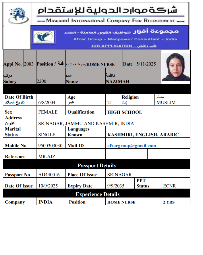 Service Type Service Type Recruitment Rent Transfer Services Nationality Nationality Philippines India Ethiopia Burundi Bangladesh Uganda Sri Lanka KENIA Indonesia Ghana Career Housemaid Family driver Care worker Religion Muslim Non-Muslim Choose Experience Previous Work Never Worked Search Clear KANAKAMMA SUBRANIYAN ACHARI SREEJITH India Age 43 Experince Previous Work Relegion Non-Muslim File Number R1986652 Reserve the worker CV MOHAN MURALIDHARAN India Age 33 Experince Never Worked Relegion Non-Muslim File Number W4583367 Reserve the worker CV ABDUL SAMAD UMMUSALMABIVEE India Age 34 Experince Never Worked Relegion Muslim File Number AF037919 Reserve the worker CV BASHIR NAZIMAH India Age 21 Experince Never Worked Relegion Muslim File Number AD440016 Reserve the worker CV ANA KKACHERI ABDUL RASHEED India Age 38 Experince Previous Work Relegion Muslim File Number T9276685 Reserve the worker CV ABBAS BEARY MOHAMMAD RAFEEQ India Age 58 Experince Previous Work Relegion Non-Muslim File Number W0307799 Reserve the worker CV