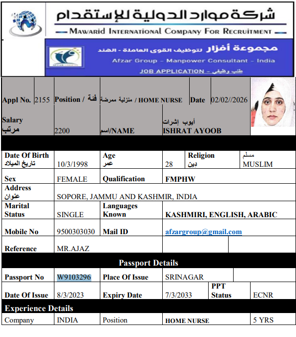 نوع الخدمة نوع الخدمة استقدام تأجير نقل خدمات الجنسية الجنسية الفلبين الهند اثيوبيا بروندي بنغلاديش أوغندا سريلانكا كينيا اندونيسيا غانا المهنة عاملة منزلية سائق خاص عاملة عناية ممرضة منزلية الديانة مسلم غير مسلم الخبرة سبق العمل لم يسبق العمل بحث مسح ناضمه الهند العمر 22 الخبرة لم يسبق العمل الديانة مسلم رقم الملف شبسيثصيبس حجز العاملة صبرينا الهند العمر 23 الخبرة لم يسبق العمل الديانة مسلم رقم الملف ثسي حجز العاملة GULSHANA AKHTER الهند العمر 28 الخبرة لم يسبق العمل الديانة مسلم رقم الملف C3634821 حجز العاملة السير الذاتية ISHRAT AYOOB الهند العمر 28 الخبرة لم يسبق العمل الديانة مسلم رقم الملف W9103296 حجز العاملة السير الذاتية SINDHU DEVI الهند العمر 35 الخبرة لم يسبق العمل الديانة غير مسلم رقم الملف V8275954 حجز العاملة السير الذاتية SABREENA MEHJOOR MEHJOOR AHMAD PARRAY الهند العمر 23 الخبرة لم يسبق العمل الديانة مسلم رقم الملف AD434964 حجز العاملة DHASTHAGEER الهند العمر 32 الخبرة سبق العمل الديانة مسلم رقم الملف C7157533 حجز العاملة ABID الهند العمر 46 الخبرة سبق العمل الديانة مسلم رقم الملف X6592682 حجز العاملة السير الذاتية MOHAMED SATHIK الهند العمر 43 الخبرة سبق العمل الديانة مسلم رقم الملف X3486515 حجز العاملة السير الذاتية SATHAM HUSSAIN الهند العمر 32 الخبرة سبق العمل الديانة مسلم رقم الملف Y4434610 حجز العاملة السير الذاتية 1 2