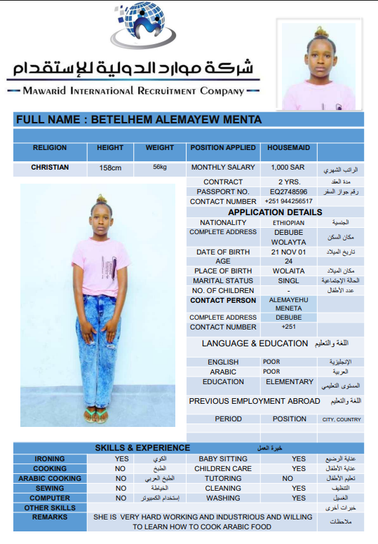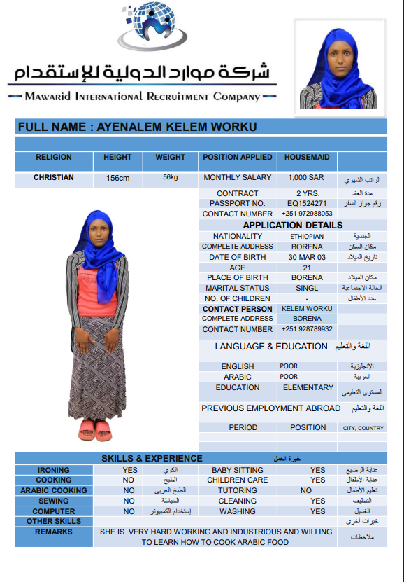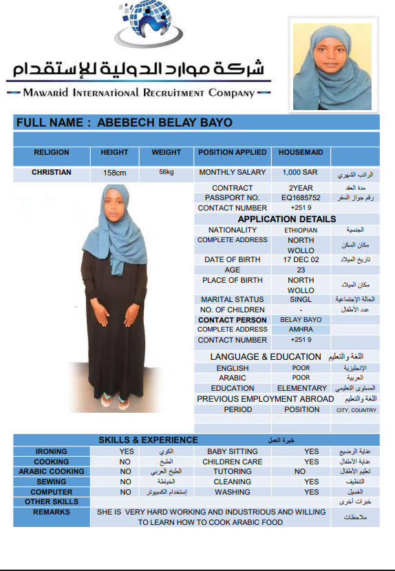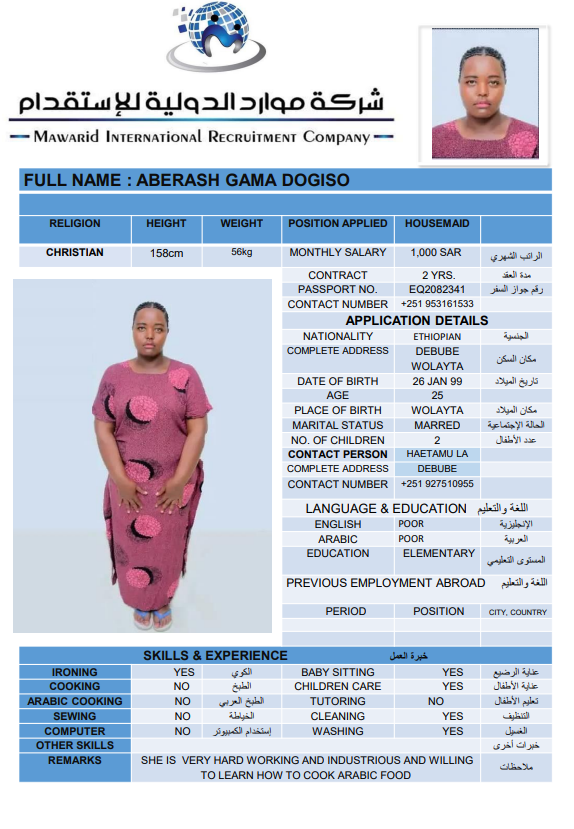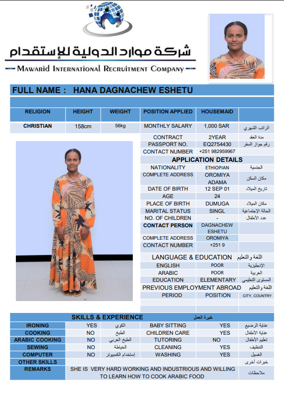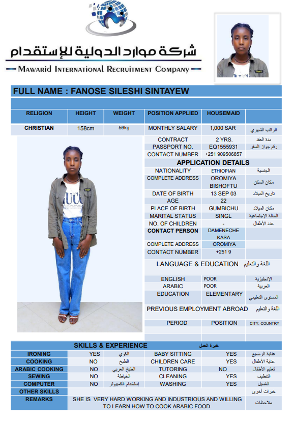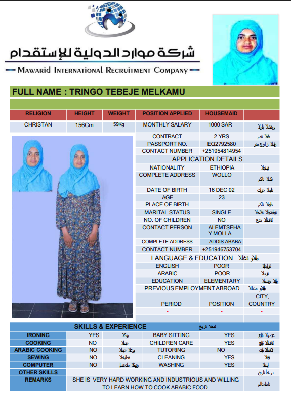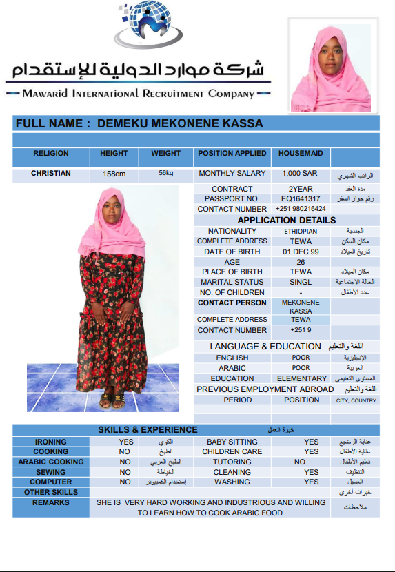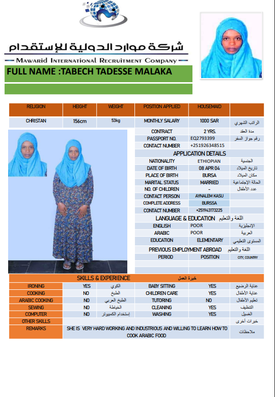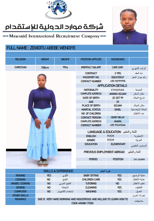 نوع الخدمة نوع الخدمة استقدام تأجير نقل خدمات الجنسية الجنسية الفلبين الهند اثيوبيا بروندي بنغلاديش أوغندا سريلانكا كينيا اندونيسيا غانا المهنة عاملة منزلية سائق خاص عاملة عناية ممرضة منزلية الديانة مسلم غير مسلم الخبرة سبق العمل لم يسبق العمل بحث مسح ZEWDITU ABEBE WENDIYE اثيوبيا العمر 25 الخبرة لم يسبق العمل الديانة غير مسلم رقم الملف 2470547EQ حجز العاملة السير الذاتية ABEBECH BELAY BAYO اثيوبيا العمر 23 الخبرة لم يسبق العمل الديانة غير مسلم رقم الملف 1685752EQ حجز العاملة السير الذاتية DEMEKU MEKONENE KASSA اثيوبيا العمر 26 الخبرة لم يسبق العمل الديانة غير مسلم رقم الملف 1641317EQ حجز العاملة السير الذاتية TRINGO TEBEJE MELKAMU اثيوبيا العمر 23 الخبرة لم يسبق العمل الديانة غير مسلم رقم الملف 2792580EQ حجز العاملة السير الذاتية TABECH TADESSE MALAKA اثيوبيا العمر 22 الخبرة لم يسبق العمل الديانة غير مسلم رقم الملف 2793399EQ حجز العاملة السير الذاتية AYENALEM KELEM WORKU اثيوبيا العمر 21 الخبرة لم يسبق العمل الديانة غير مسلم رقم الملف 1524271EQ حجز العاملة السير الذاتية FANOSE SILESHI SINTAYEW اثيوبيا العمر 22 الخبرة لم يسبق العمل الديانة غير مسلم رقم الملف 1555931EQ حجز العاملة السير الذاتية ABERASH GAMA DOGISO اثيوبيا العمر 25 الخبرة لم يسبق العمل الديانة غير مسلم رقم الملف 25 حجز العاملة السير الذاتية BETELHEM ALEMAYEW MENTA اثيوبيا العمر 24 الخبرة لم يسبق العمل الديانة غير مسلم رقم الملف 2748596EQ حجز العاملة السير الذاتية hana dagachew اثيوبيا العمر 24 الخبرة لم يسبق العمل الديانة غير مسلم رقم الملف eq2754430 حجز العاملة السير الذاتية 1 2 3 4 5 6