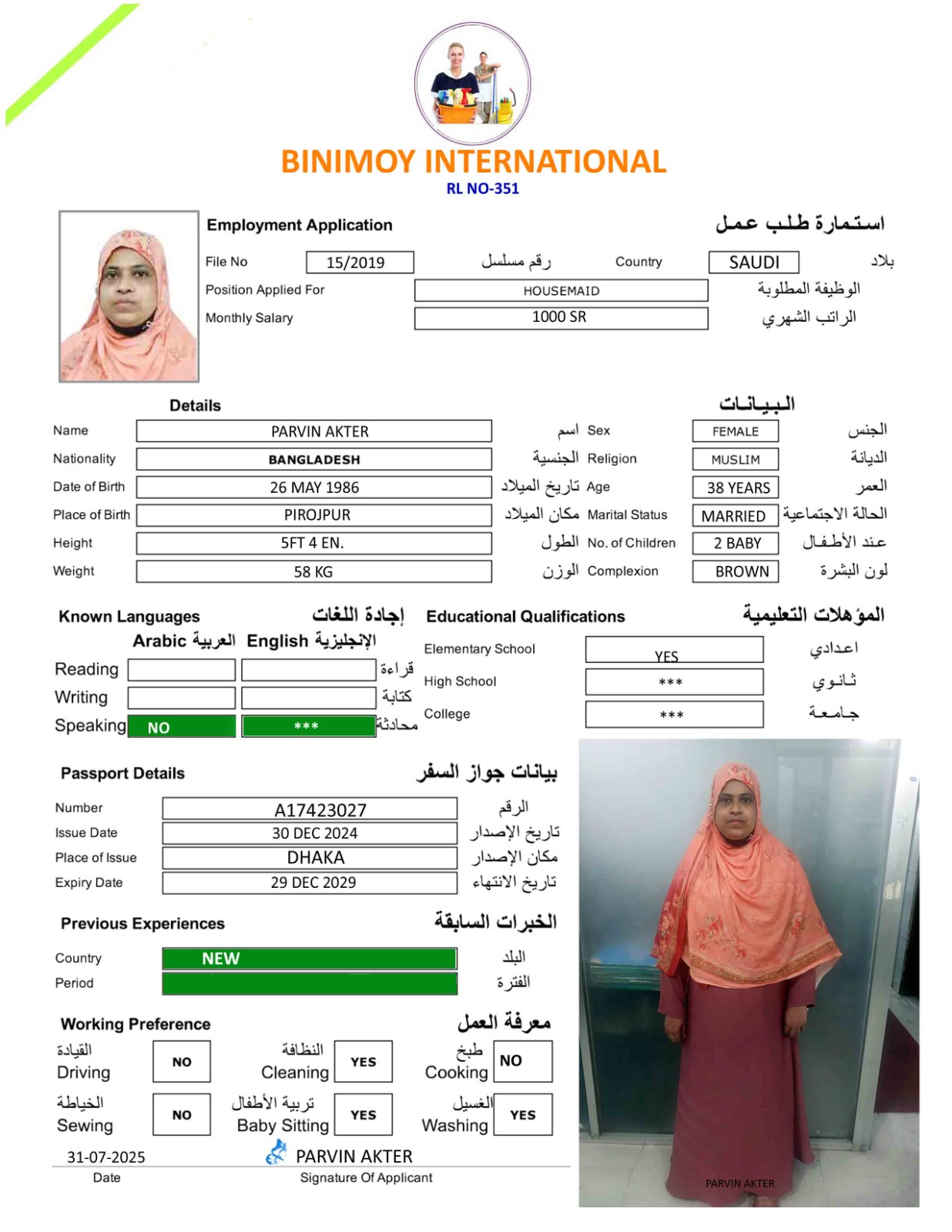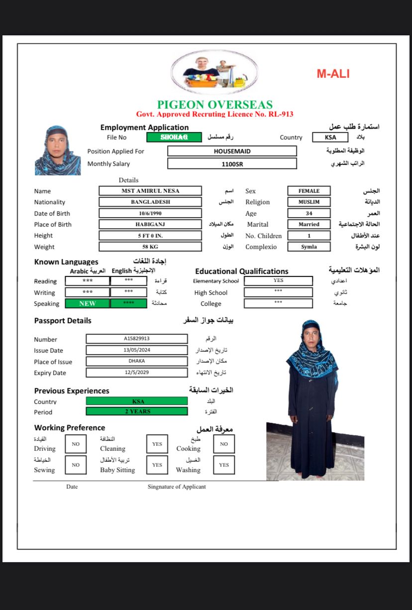 نوع الخدمة نوع الخدمة استقدام تأجير نقل خدمات الجنسية الجنسية الفلبين الهند اثيوبيا بروندي بنغلاديش أوغندا سريلانكا كينيا اندونيسيا غانا المهنة عاملة منزلية سائق خاص عاملة عناية الديانة مسلم غير مسلم الخبرة سبق العمل لم يسبق العمل بحث مسح PARVIN بنغلاديش العمر 38 الخبرة لم يسبق العمل الديانة مسلم رقم الملف A17423027 حجز العاملة SELINA بنغلاديش العمر 37 الخبرة سبق العمل الديانة مسلم رقم الملف EJ0689740 حجز العاملة SALMA بنغلاديش العمر 38 الخبرة سبق العمل الديانة غير مسلم رقم الملف A20187994 حجز العاملة REKHA BEGUM بنغلاديش العمر 40 الخبرة سبق العمل الديانة مسلم رقم الملف A04236889 حجز العاملة AMIRUL بنغلاديش العمر 34 الخبرة سبق العمل الديانة مسلم رقم الملف A15829913 حجز العاملة MST JAHIRUN بنغلاديش العمر 38 الخبرة سبق العمل الديانة مسلم رقم الملف A15561138 حجز العاملة SIMA BEGUM بنغلاديش العمر 37 الخبرة سبق العمل الديانة مسلم رقم الملف A157397910 حجز العاملة