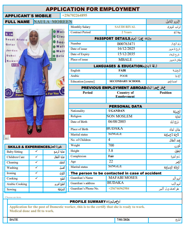 نوع الخدمة نوع الخدمة استقدام تأجير نقل خدمات الجنسية الجنسية الفلبين الهند اثيوبيا بروندي بنغلاديش أوغندا سريلانكا كينيا اندونيسيا غانا المهنة عاملة منزلية سائق خاص عاملة عناية ممرضة منزلية الديانة مسلم غير مسلم الخبرة سبق العمل لم يسبق العمل بحث مسح NAULA MOREEN أوغندا العمر 23 الخبرة سبق العمل الديانة غير مسلم رقم الملف 00763471B حجز العاملة VICKY أوغندا العمر 23 الخبرة لم يسبق العمل الديانة غير مسلم رقم الملف B00539393 حجز العاملة BETTY أوغندا العمر 36 الخبرة لم يسبق العمل الديانة غير مسلم رقم الملف B00780607 حجز العاملة NATABONA MARTHA أوغندا العمر 35 الخبرة سبق العمل الديانة غير مسلم رقم الملف 00649377A حجز العاملة MBAMBU LAHERI أوغندا العمر 34 الخبرة لم يسبق العمل الديانة غير مسلم رقم الملف B00770169 حجز العاملة NABAKOOZA FLORENCE أوغندا العمر 40 الخبرة سبق العمل الديانة غير مسلم رقم الملف A00358035 حجز العاملة 1 2 3 4