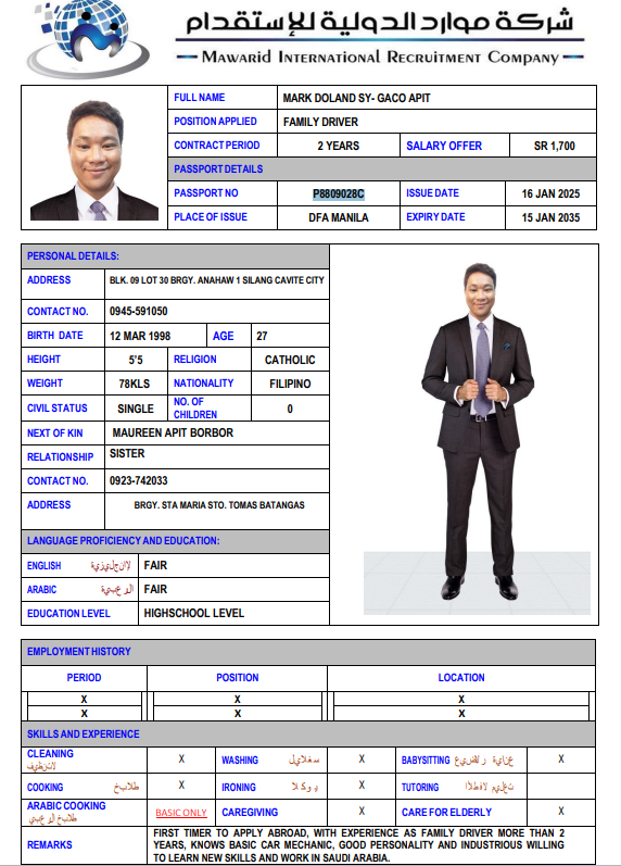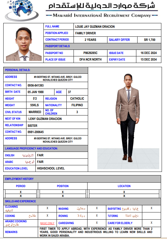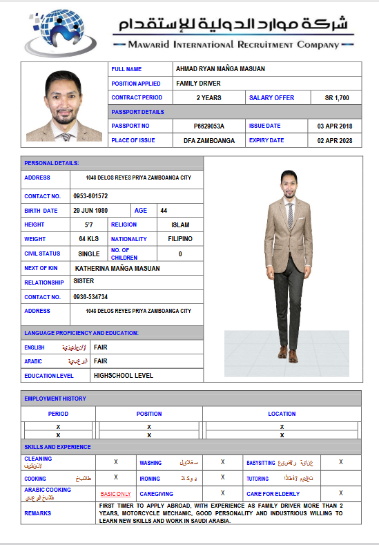 نوع الخدمة نوع الخدمة استقدام تأجير نقل خدمات الجنسية الجنسية الفلبين الهند اثيوبيا بروندي بنغلاديش أوغندا سريلانكا كينيا اندونيسيا غانا المهنة عاملة منزلية سائق خاص عاملة عناية الديانة مسلم غير مسلم الخبرة سبق العمل لم يسبق العمل بحث مسح KANAKAMMA SUBRANIYAN ACHARI SREEJITH الهند العمر 43 الخبرة سبق العمل الديانة غير مسلم رقم الملف R1986652 حجز العاملة السير الذاتية MOHAN MURALIDHARAN الهند العمر 33 الخبرة لم يسبق العمل الديانة غير مسلم رقم الملف W4583367 حجز العاملة السير الذاتية ANA KKACHERI ABDUL RASHEED الهند العمر 38 الخبرة سبق العمل الديانة مسلم رقم الملف T9276685 حجز العاملة السير الذاتية ABBAS BEARY MOHAMMAD RAFEEQ الهند العمر 58 الخبرة سبق العمل الديانة غير مسلم رقم الملف W0307799 حجز العاملة السير الذاتية LOUIE JAY GUZMAN ORACION الفلبين العمر 37 الخبرة لم يسبق العمل الديانة غير مسلم رقم الملف P8629285C حجز العاملة السير الذاتية MARK DOLAND SY- GACO APIT الفلبين العمر 27 الخبرة لم يسبق العمل الديانة غير مسلم رقم الملف P8809028C حجز العاملة السير الذاتية هعغمفلخهعمنز الفلبين العمر 44 الخبرة لم يسبق العمل الديانة غير مسلم رقم الملف صضثقل حجز العاملة