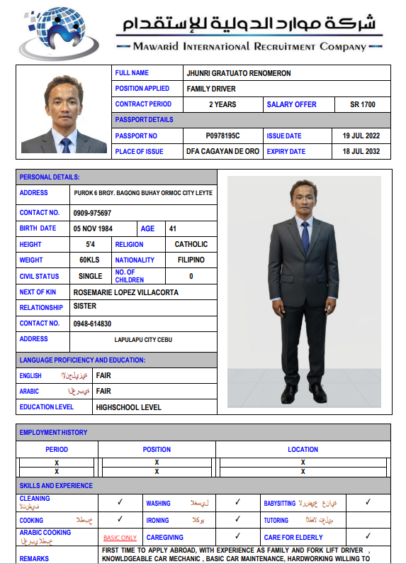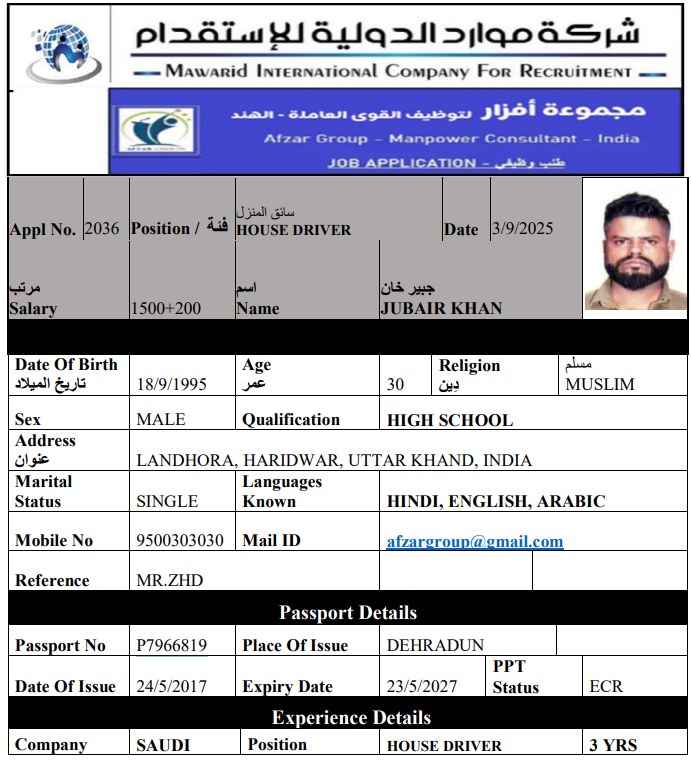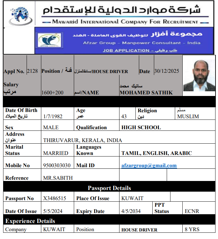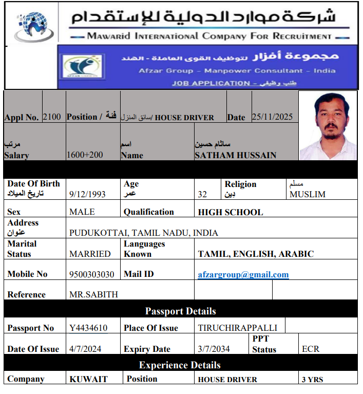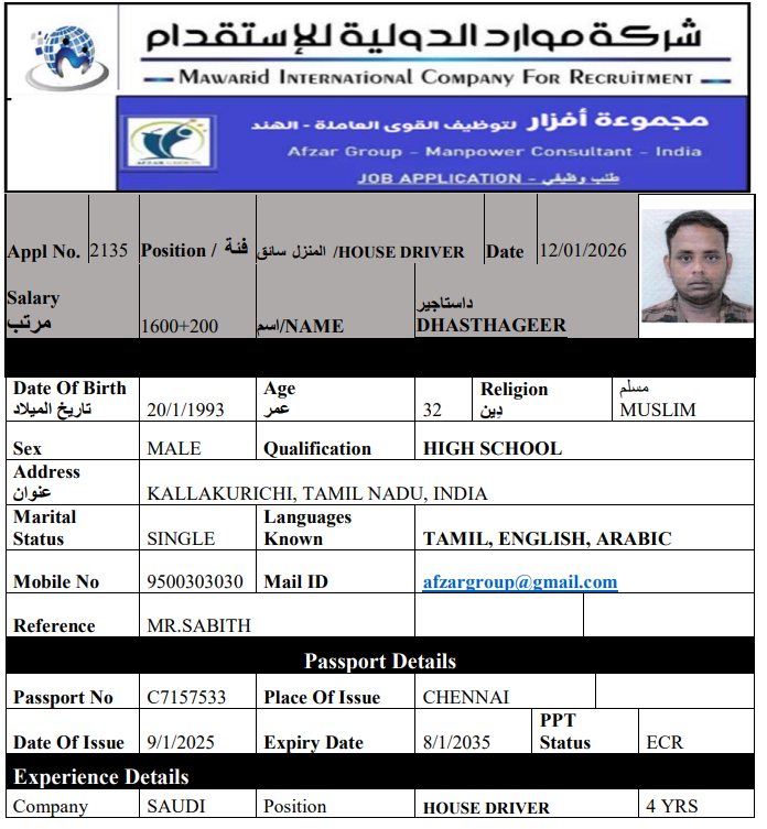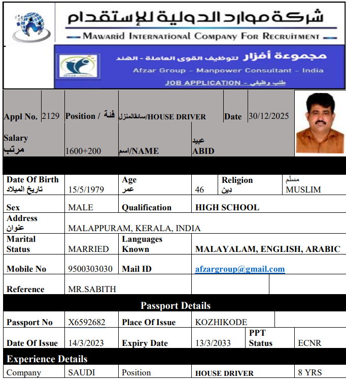 نوع الخدمة نوع الخدمة استقدام تأجير نقل خدمات الجنسية الجنسية الفلبين الهند اثيوبيا بروندي بنغلاديش أوغندا سريلانكا كينيا اندونيسيا غانا المهنة عاملة منزلية سائق خاص عاملة عناية ممرضة منزلية الديانة مسلم غير مسلم الخبرة سبق العمل لم يسبق العمل بحث مسح JHUNRI GRATUATO RENOMERON الفلبين العمر 41 الخبرة لم يسبق العمل الديانة غير مسلم رقم الملف P0978195C حجز العاملة السير الذاتية DHASTHAGEER الهند العمر 32 الخبرة سبق العمل الديانة مسلم رقم الملف C7157533 حجز العاملة ABID الهند العمر 46 الخبرة سبق العمل الديانة مسلم رقم الملف X6592682 حجز العاملة السير الذاتية MOHAMED SATHIK الهند العمر 43 الخبرة سبق العمل الديانة مسلم رقم الملف X3486515 حجز العاملة السير الذاتية SATHAM HUSSAIN الهند العمر 32 الخبرة سبق العمل الديانة مسلم رقم الملف Y4434610 حجز العاملة السير الذاتية JUBAIR KHAN الهند العمر 30 الخبرة سبق العمل الديانة مسلم رقم الملف P7966819 حجز العاملة السير الذاتية